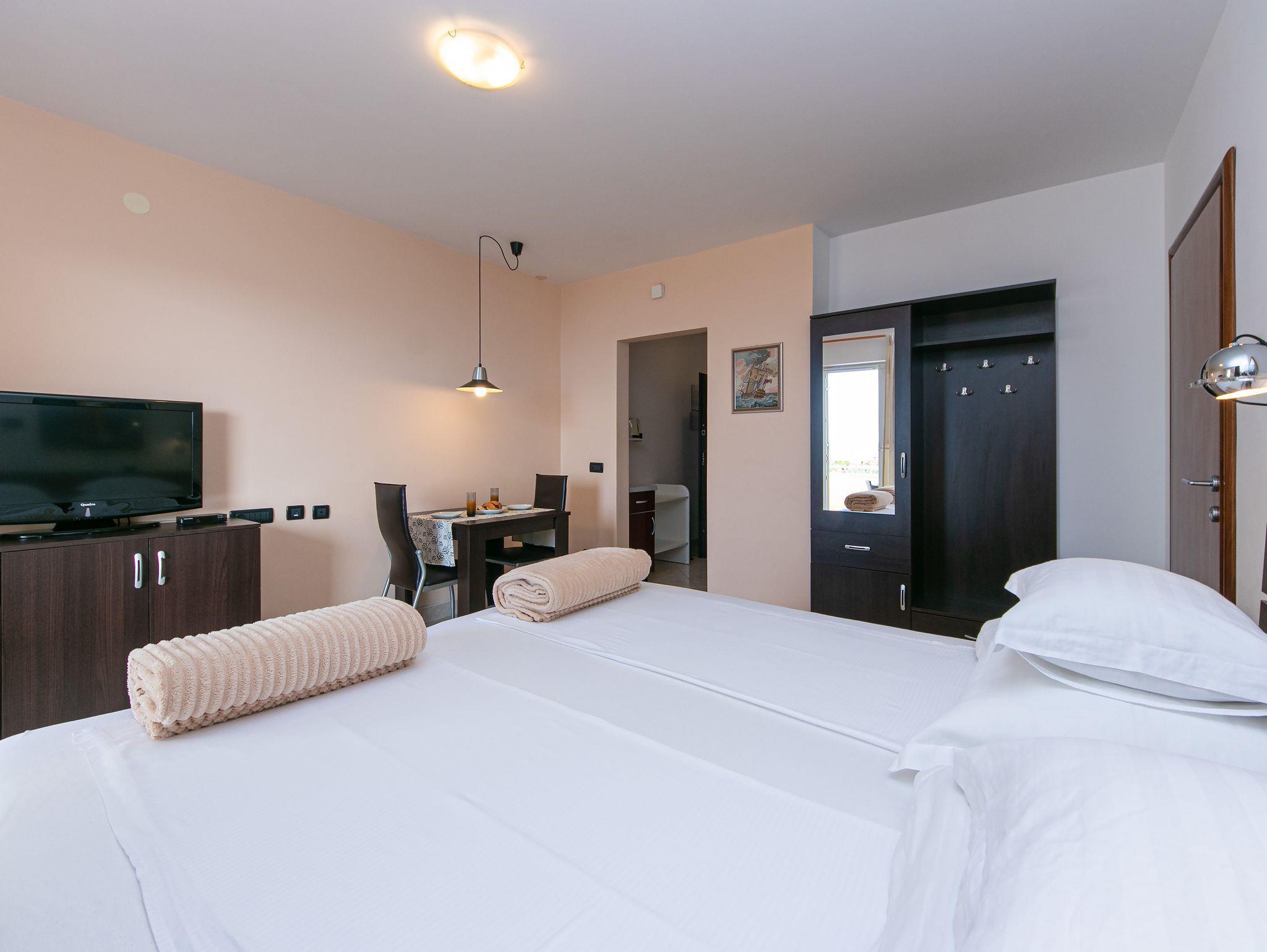 Studio bietet Platz für 2 Gäste. Die Betten sind in Schlafzimmern, die es 1 gibt, innerhalb einer Gesamtfläche von 24m2, angeordnet. Die Gäste haben eine eigene Terrasse zur Verfügung, auf der sie in warmen Sommernächten genießen können. Das Studio-Apartment bietet Meerblick. Es ist erlaubt, Speisen auf dem Gemeinschafts-Grill vorzubereiten. Während ihres Aufenthalts können Gäste das gemeinsam zur Nutzung stehende Schwimmbad benutzen. In der Unterkunftseinheit besteht die Möglichkeit des Mitbringens von Haustieren gegen Aufpreis. IM PREIS INBEGRIFFEN: Kurtaxe, Endreinigung, Klimatisierung, Pool, Parkplatz, Internet, Wäschewaschen, Kinderbett, Bügeleisen, Bügelbrett, Föhn. UNVERBINDLICHE ZUSÄTZLICHE KOSTEN: Haustiere (10,00 € pro Nacht). Die Verfügbarkeit zusätzlicher Dienstleistungen in Ihrem reservierten Termin und die Preise derselben (falls nicht aufgeführt) müssen im Voraus überprüft werden. Zusätzliche Dienstleistungen die in der Zahlungsaufforderung nicht aufgeführt sind werden direkt beim Vermieter bezahlt, angenommen der Gast nutzt auch diese. Ermäßigung auf den Grundpreis: Gratistag 14=13 (bei einem Aufenthalt von 14 Tagen oder mehr erhalten Sie einen Gratistag für den Aufenthalt bis 31.12.26).