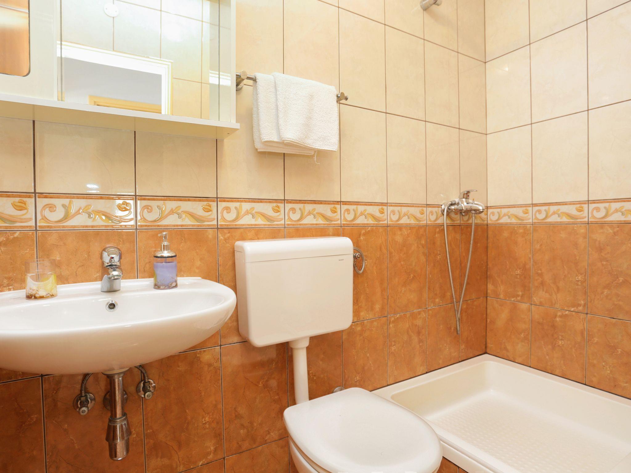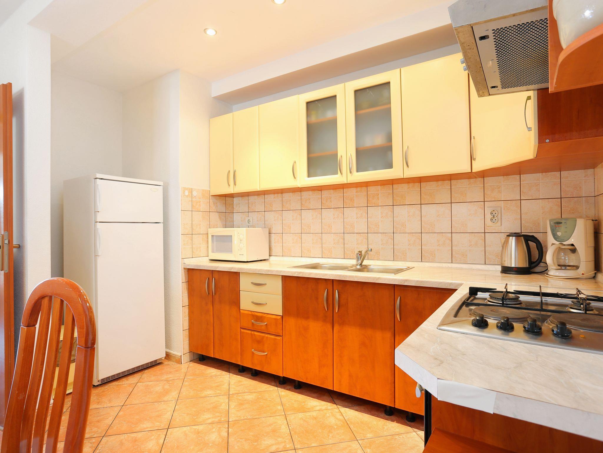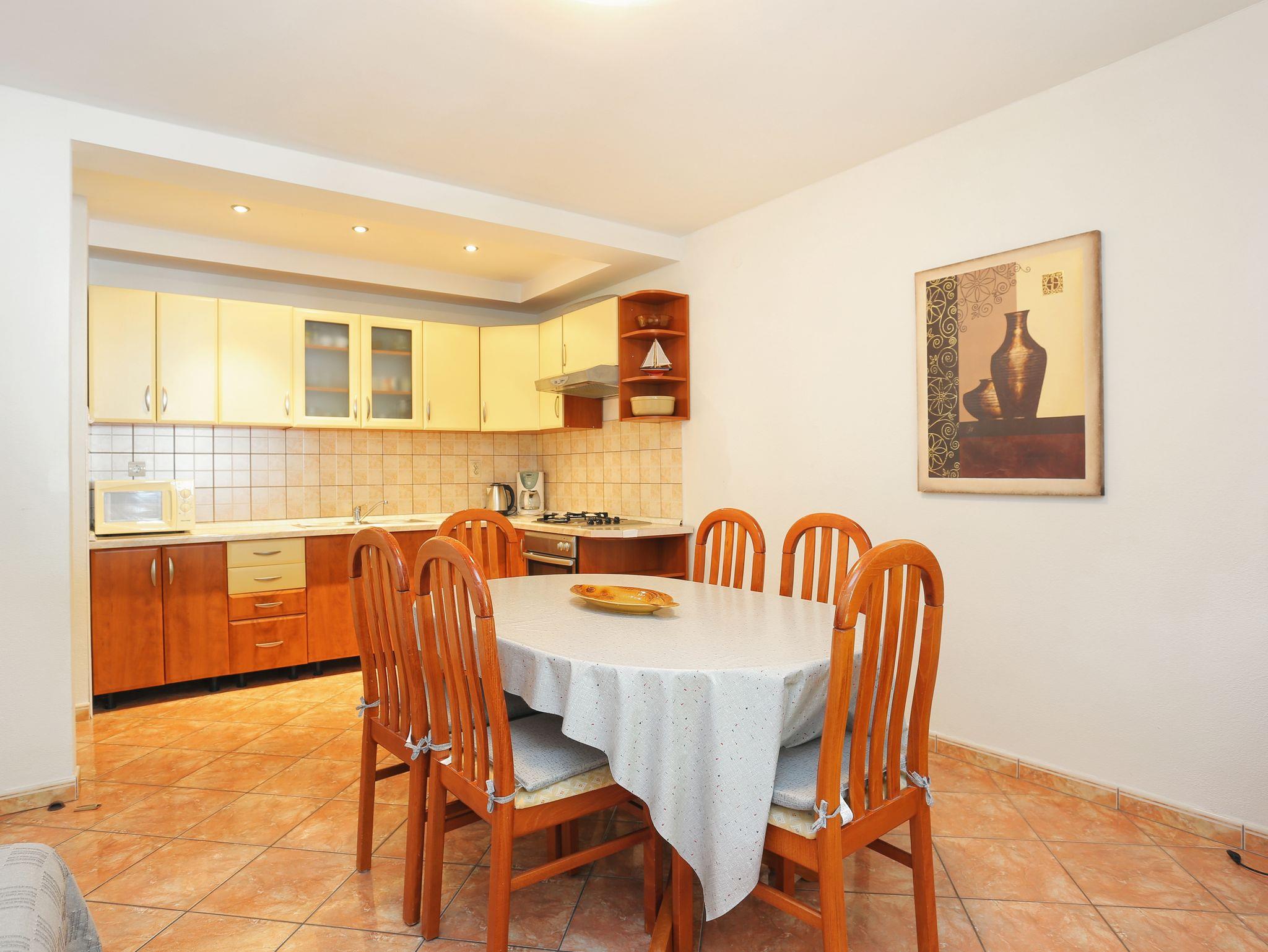 Ferienwohnung bietet Platz für 6 Gäste. Die Betten sind in Schlafzimmern, die es 2 gibt, und in Wohnzimmer, innerhalb einer Gesamtfläche von 58m2, angeordnet. Die Gäste haben eine eigene Terrasse zur Verfügung, auf der sie in warmen Sommernächten genießen können. Das Apartment bietet Meerblick. Es ist erlaubt, Speisen auf dem Gemeinschafts-Grill vorzubereiten. In der Unterkunftseinheit besteht die Möglichkeit des Mitbringens von Haustieren gegen Aufpreis. IM PREIS INBEGRIFFEN: Kurtaxe, Endreinigung, Klimatisierung, Parkplatz, Internet, Kinderbett, Bügeleisen, Bügelbrett, tragbarer Grill, 1 Bett für Kinder (im Preis enthalten). VERBINDLICHE ZUSÄTZLICHE KOSTEN: Aufzahlung für Kurzaufenthalte (prozentualer Zuschlag pro Nächtigungsanzahl: 30% - 1, 20% - 2, 10% - 3). UNVERBINDLICHE ZUSÄTZLICHE KOSTEN: Wäschewaschen (5,00 € Waschen), Haustiere (5,00 € pro Nacht). Die Verfügbarkeit zusätzlicher Dienstleistungen in Ihrem reservierten Termin und die Preise derselben (falls nicht aufgeführt) müssen im Voraus überprüft werden. Zusätzliche Dienstleistungen die in der Zahlungsaufforderung nicht aufgeführt sind werden direkt beim Vermieter bezahlt, angenommen der Gast nutzt auch diese.