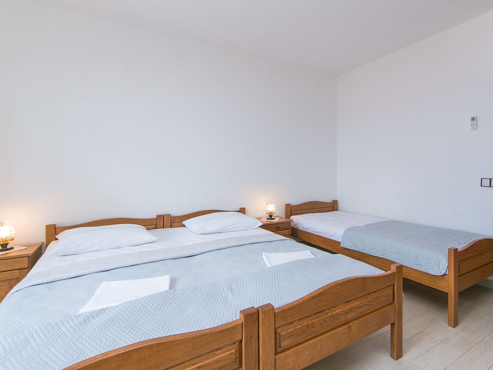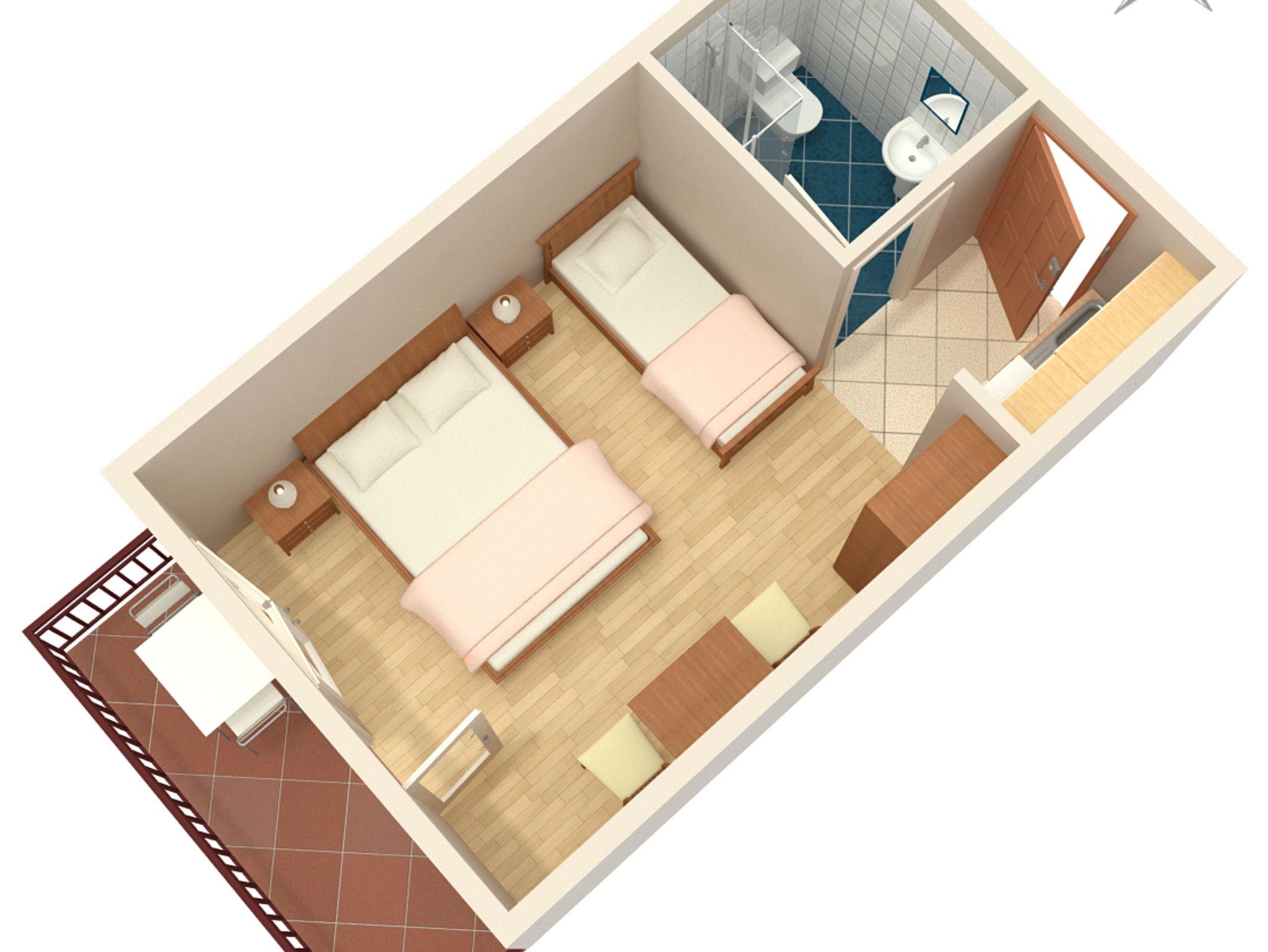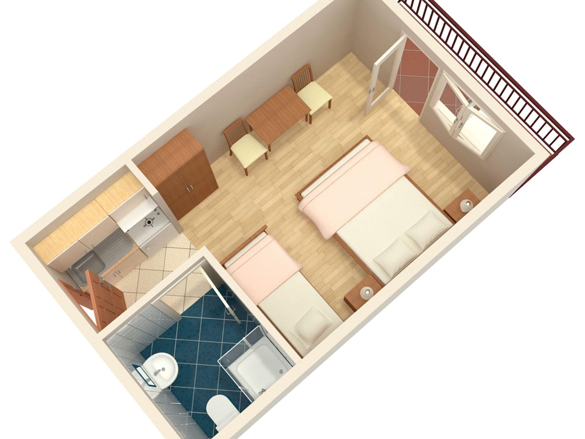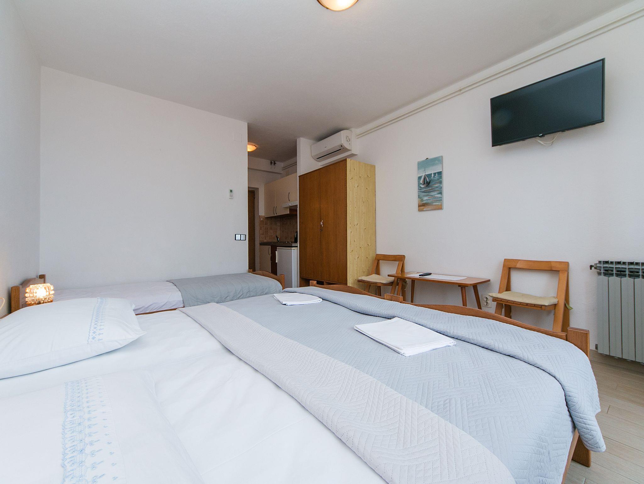 Studio bietet Platz für 3 Gäste. Die Betten sind in Schlafzimmern, die es 1 gibt, innerhalb einer Gesamtfläche von 21m2, angeordnet. Die Gäste haben einen eigenen Balkon zur Verfügung, auf der sie in warmen Sommernächten genießen können. Das Studio-Apartment bietet Meerblick. IM PREIS INBEGRIFFEN: Kurtaxe, Endreinigung, Klimatisierung, Parkplatz, Internet, Kinderbett, Bügeleisen, Bügelbrett, Föhn. Die Verfügbarkeit zusätzlicher Dienstleistungen in Ihrem reservierten Termin und die Preise derselben (falls nicht aufgeführt) müssen im Voraus überprüft werden. Zusätzliche Dienstleistungen die in der Zahlungsaufforderung nicht aufgeführt sind werden direkt beim Vermieter bezahlt, angenommen der Gast nutzt auch diese.