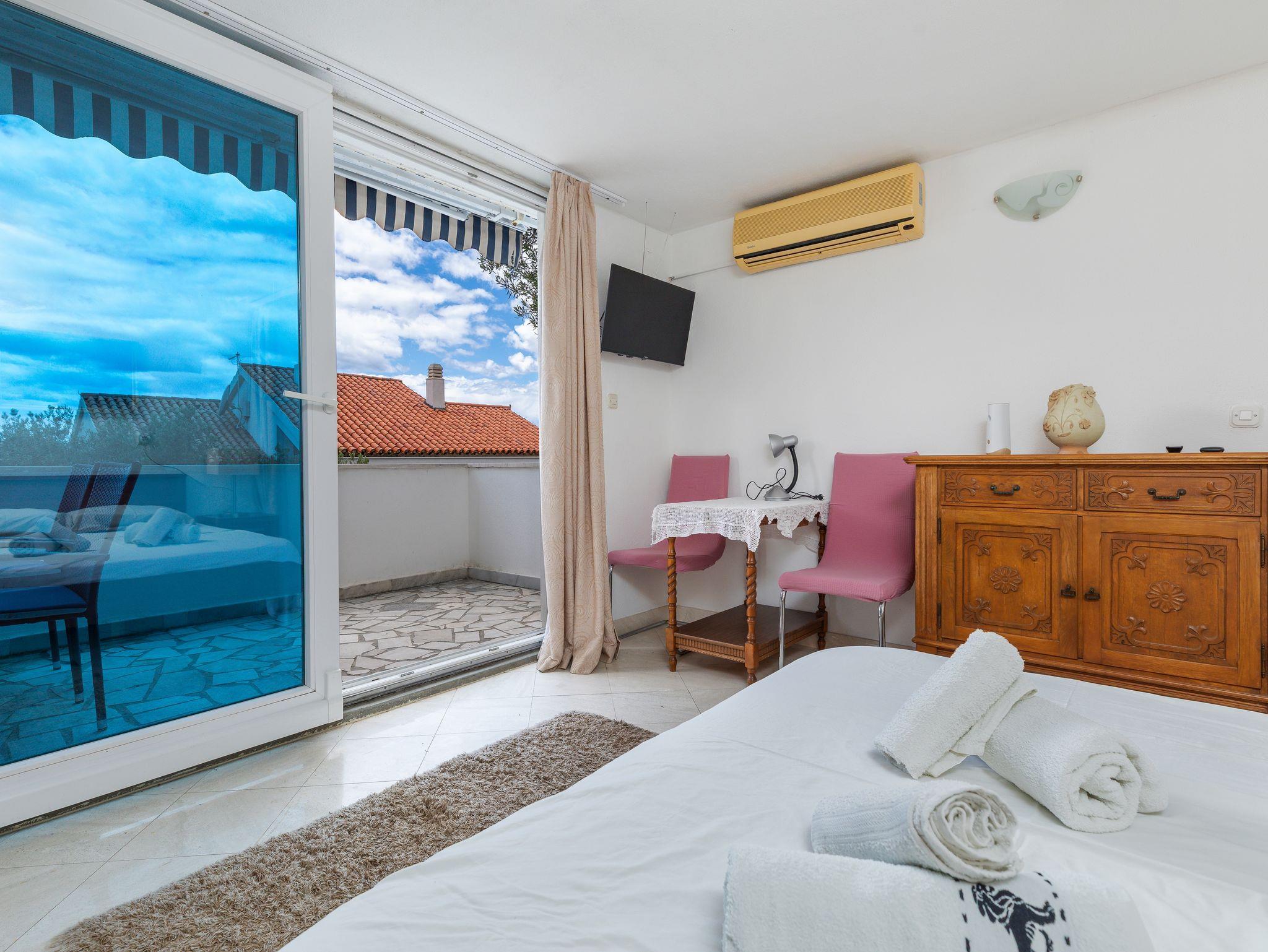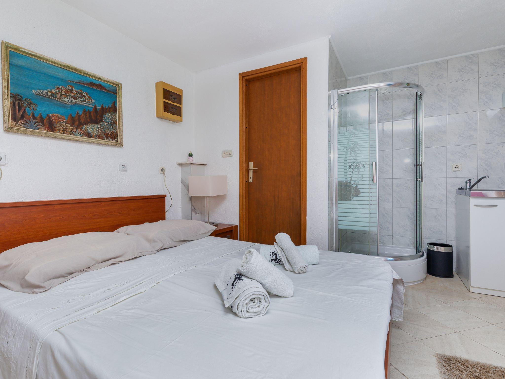 Studio bietet Platz für 2 Gäste. Die Betten sind in Schlafzimmern, die es 1 gibt, innerhalb einer Gesamtfläche von 17m2, angeordnet. Die Gäste haben eine eigene Terrasse zur Verfügung, auf der sie in warmen Sommernächten genießen können. Das Studio-Apartment bietet Meerblick. Es ist erlaubt, Speisen auf dem Gemeinschafts-Grill vorzubereiten. Während ihres Aufenthalts können Gäste das gemeinsam zur Nutzung stehende Schwimmbad benutzen. IM PREIS INBEGRIFFEN: Kurtaxe, Endreinigung, Klimatisierung, Pool, Parkplatz, Internet, Bügeleisen, Föhn, Liegestühle. VERBINDLICHE ZUSÄTZLICHE KOSTEN: Aufzahlung für Kurzaufenthalte (prozentualer Zuschlag pro Nächtigungsanzahl: 30% - 1, 20% - 2, 10% - 3). UNVERBINDLICHE ZUSÄTZLICHE KOSTEN: Wäschewaschen (10,00 € Waschen). Die Verfügbarkeit zusätzlicher Dienstleistungen in Ihrem reservierten Termin und die Preise derselben (falls nicht aufgeführt) müssen im Voraus überprüft werden. Zusätzliche Dienstleistungen die in der Zahlungsaufforderung nicht aufgeführt sind werden direkt beim Vermieter bezahlt, angenommen der Gast nutzt auch diese. Ermäßigung auf den Grundpreis: Gratistag 14=13 (bei einem Aufenthalt von 14 Tagen oder mehr erhalten Sie einen Gratistag für den Aufenthalt bis 31.12.26).
