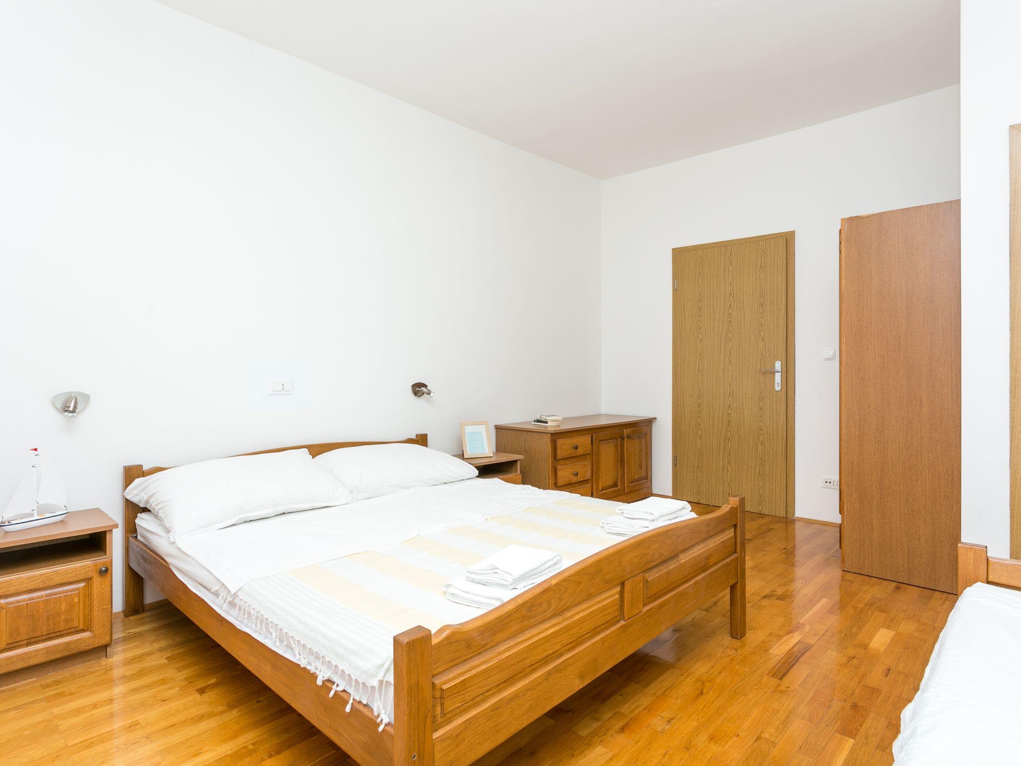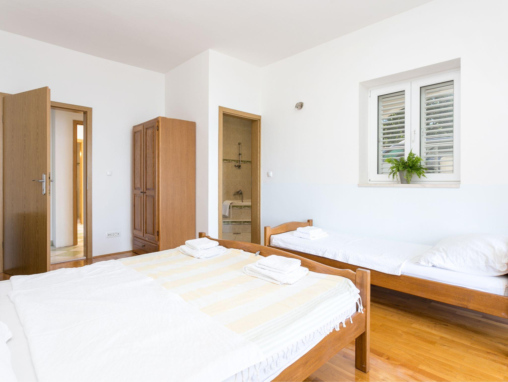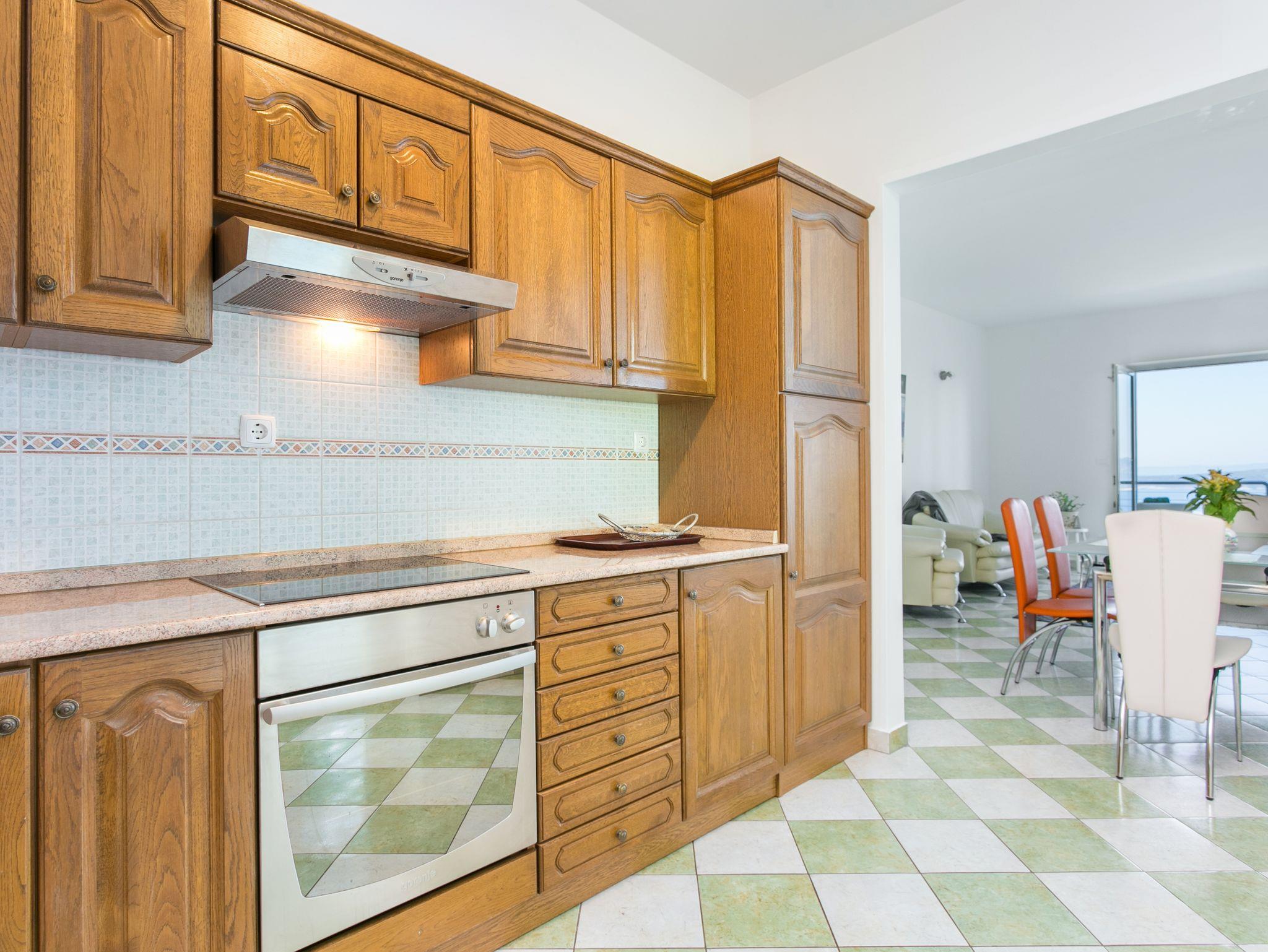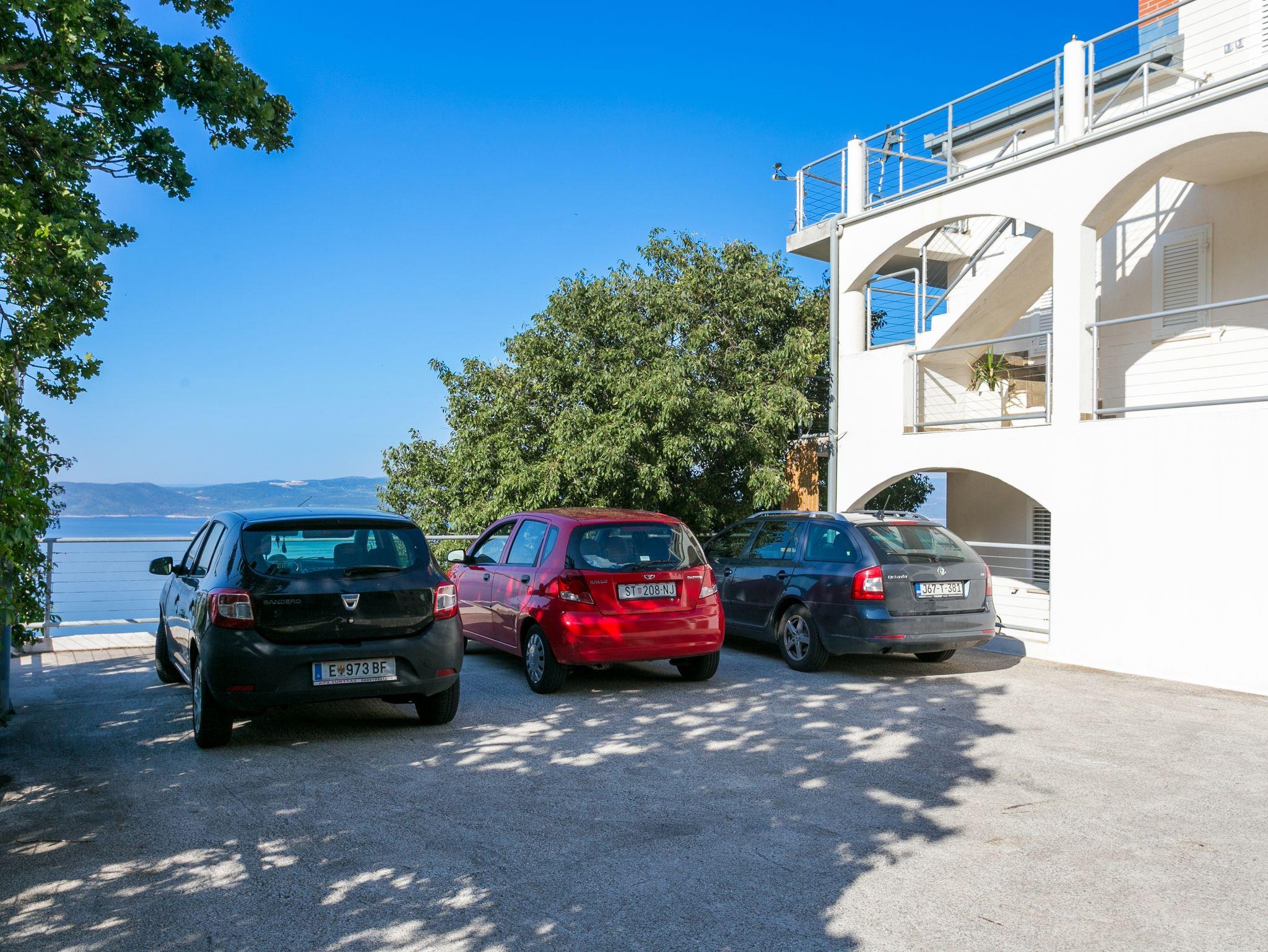 Ferienwohnung bietet Platz für 7 Gäste. Die Betten sind in Schlafzimmern, die es 2 gibt, und in Wohnzimmer, innerhalb einer Gesamtfläche von 77m2, angeordnet. Die Gäste haben eine eigene Terrasse zur Verfügung, auf der sie in warmen Sommernächten genießen können. Das Apartment bietet Meerblick. Es ist erlaubt, Speisen auf dem Gemeinschafts-Grill vorzubereiten. Während ihres Aufenthalts können Gäste das gemeinsam zur Nutzung stehende Schwimmbad benutzen. IM PREIS INBEGRIFFEN: Kurtaxe, Endreinigung, Klimatisierung, Pool, Parkplatz, Internet, Bügeleisen, Föhn. VERBINDLICHE ZUSÄTZLICHE KOSTEN: Aufzahlung für Kurzaufenthalte (prozentualer Zuschlag pro Nächtigungsanzahl: 30% - 1, 20% - 2, 10% - 3). UNVERBINDLICHE ZUSÄTZLICHE KOSTEN: Wäschewaschen (5,00 € Waschen). Die Verfügbarkeit zusätzlicher Dienstleistungen in Ihrem reservierten Termin und die Preise derselben (falls nicht aufgeführt) müssen im Voraus überprüft werden. Zusätzliche Dienstleistungen die in der Zahlungsaufforderung nicht aufgeführt sind werden direkt beim Vermieter bezahlt, angenommen der Gast nutzt auch diese. Ermäßigung auf den Grundpreis: Gratistag 14=13 (bei einem Aufenthalt von 14 Tagen oder mehr erhalten Sie einen Gratistag für den Aufenthalt bis 31.12.26).