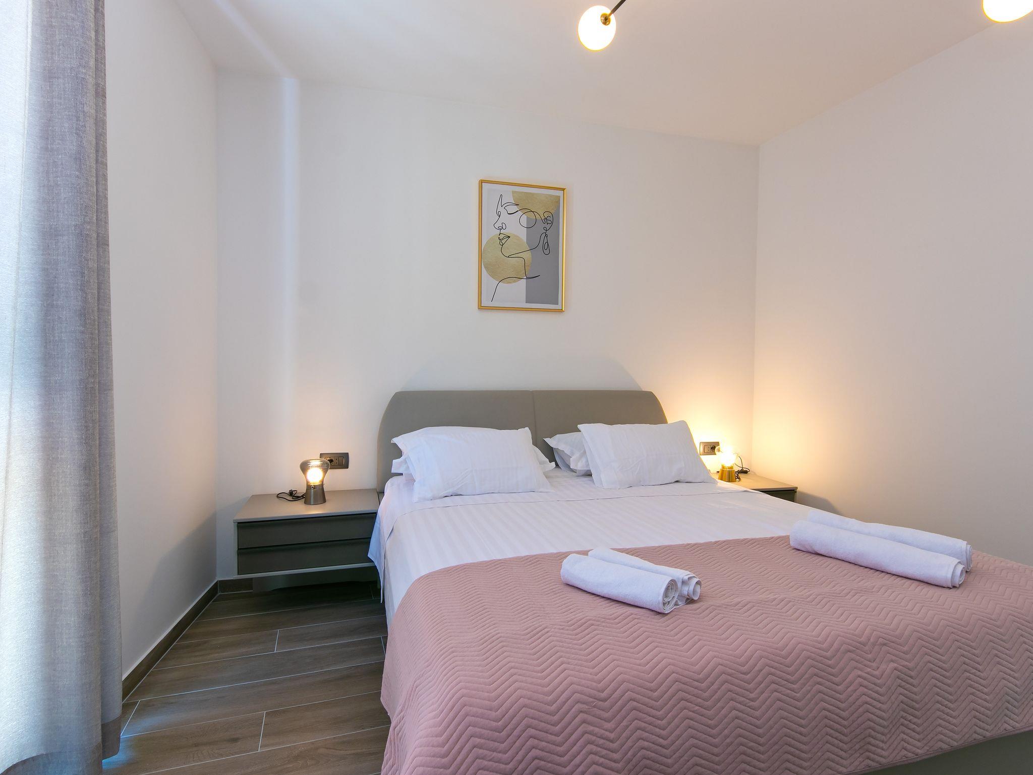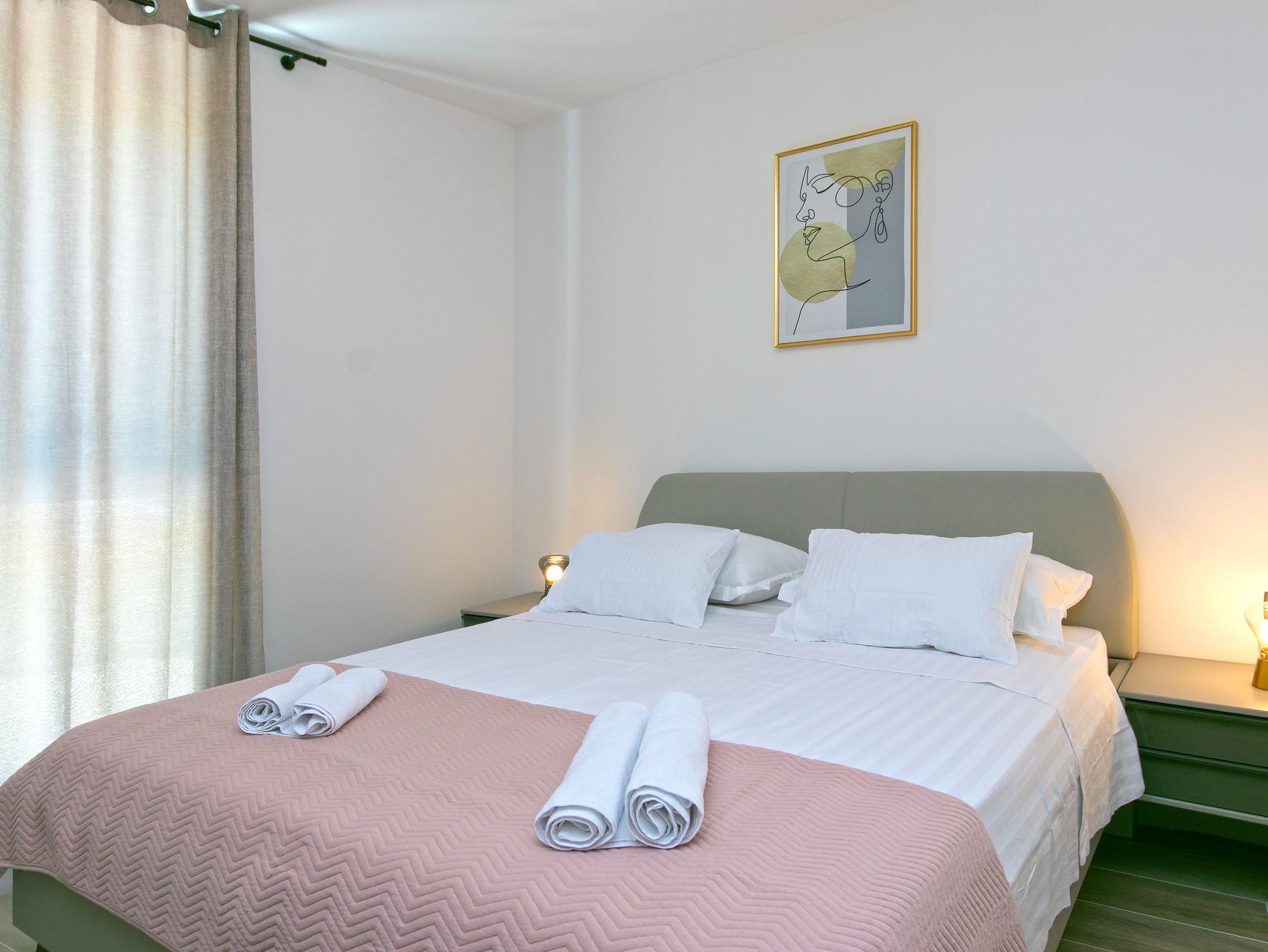Ferienwohnung bietet Platz für 2 Gäste. Die Betten sind in Schlafzimmern, die es 1 gibt, innerhalb einer Gesamtfläche von 54m2, angeordnet. Die Gäste haben eine eigene Terrasse zur Verfügung, auf der sie in warmen Sommernächten genießen können. Das Apartment bietet Meerblick. IM PREIS INBEGRIFFEN: Kurtaxe, Endreinigung, Klimatisierung, Parkplatz, Internet, Bügeleisen, Bügelbrett, Liegestühle, 2 Kinderbettchen (im Preis enthalten). Die Verfügbarkeit zusätzlicher Dienstleistungen in Ihrem reservierten Termin und die Preise derselben (falls nicht aufgeführt) müssen im Voraus überprüft werden. Zusätzliche Dienstleistungen die in der Zahlungsaufforderung nicht aufgeführt sind werden direkt beim Vermieter bezahlt, angenommen der Gast nutzt auch diese.
