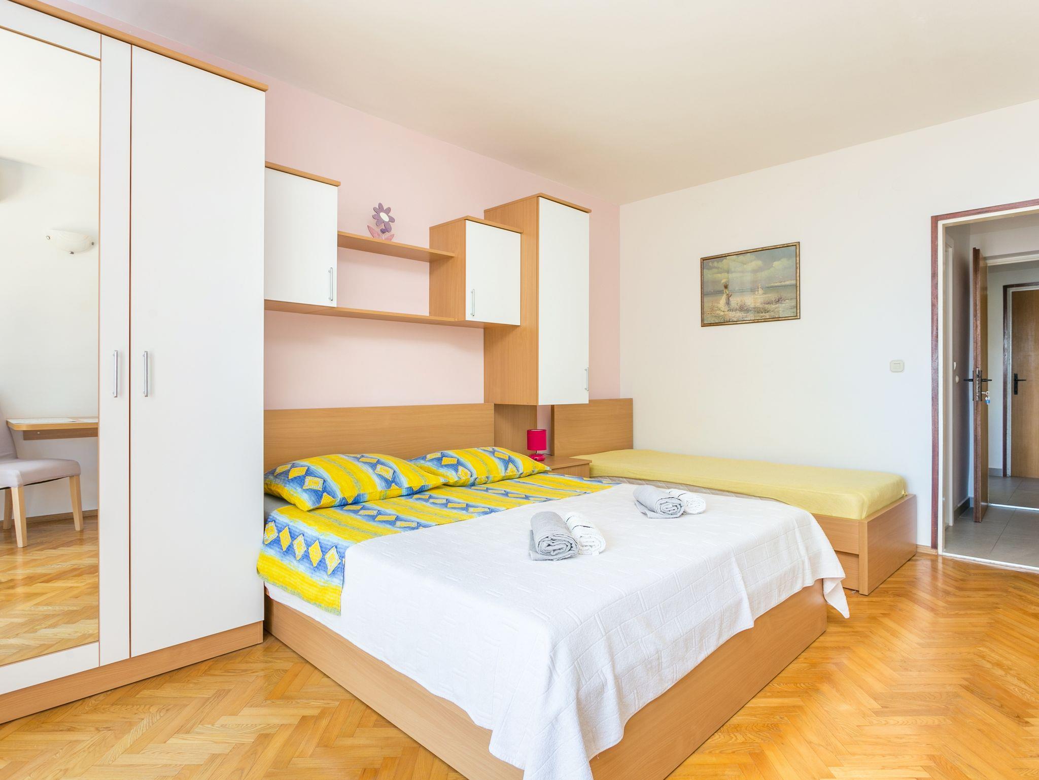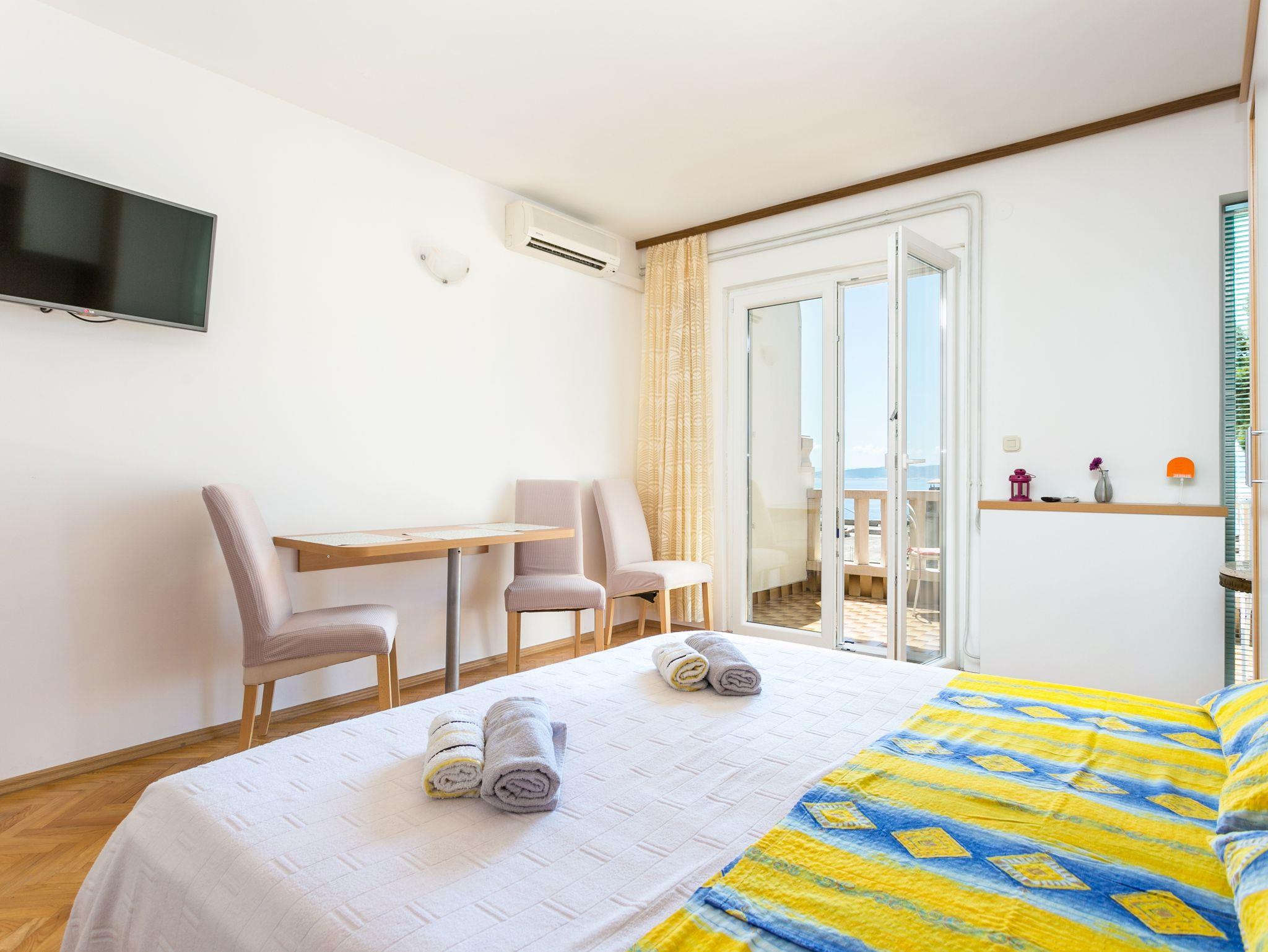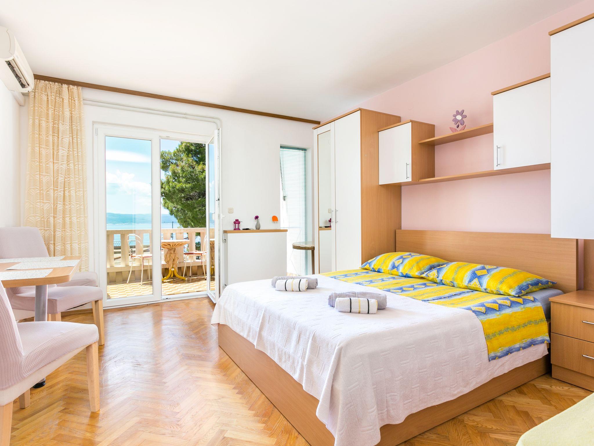 Studio bietet Platz für 3 Gäste. Die Betten sind in Schlafzimmern, die es 1 gibt, innerhalb einer Gesamtfläche von 25m2, angeordnet. Die Gäste haben eine eigene Terrasse zur Verfügung, auf der sie in warmen Sommernächten genießen können. Das Studio-Apartment bietet Meerblick. IM PREIS INBEGRIFFEN: Kurtaxe, Endreinigung, Zentralheizung, Parkplatz, Internet, Bügeleisen, Bügelbrett. VERBINDLICHE ZUSÄTZLICHE KOSTEN: Aufzahlung für Kurzaufenthalte (prozentualer Zuschlag pro Nächtigungsanzahl: 30% - 1, 20% - 2, 10% - 3). UNVERBINDLICHE ZUSÄTZLICHE KOSTEN: Klimatisierung (5,00 € pro Nacht), Wäschewaschen (5,00 € Waschen), Fahrrad (10,00 € täglich (pro Stück)). Die Verfügbarkeit zusätzlicher Dienstleistungen in Ihrem reservierten Termin und die Preise derselben (falls nicht aufgeführt) müssen im Voraus überprüft werden. Zusätzliche Dienstleistungen die in der Zahlungsaufforderung nicht aufgeführt sind werden direkt beim Vermieter bezahlt, angenommen der Gast nutzt auch diese. Ermäßigung auf den Grundpreis: Gratistag 14=13 (bei einem Aufenthalt von 14 Tagen oder mehr erhalten Sie einen Gratistag für den Aufenthalt bis 31.12.26).