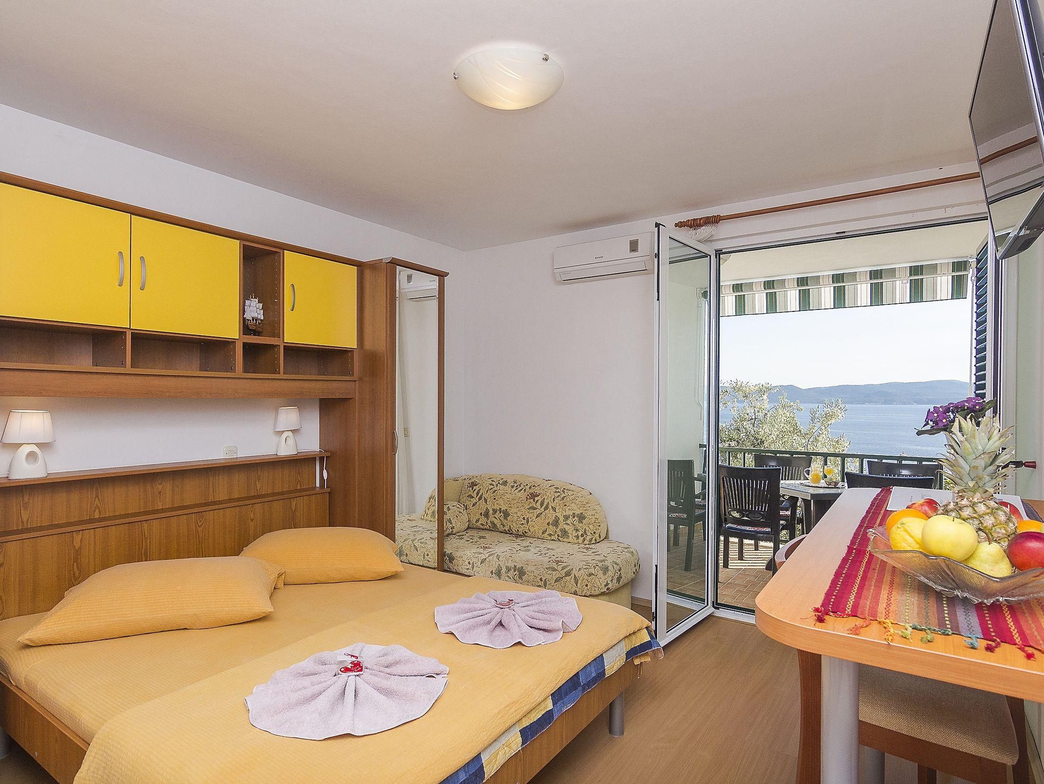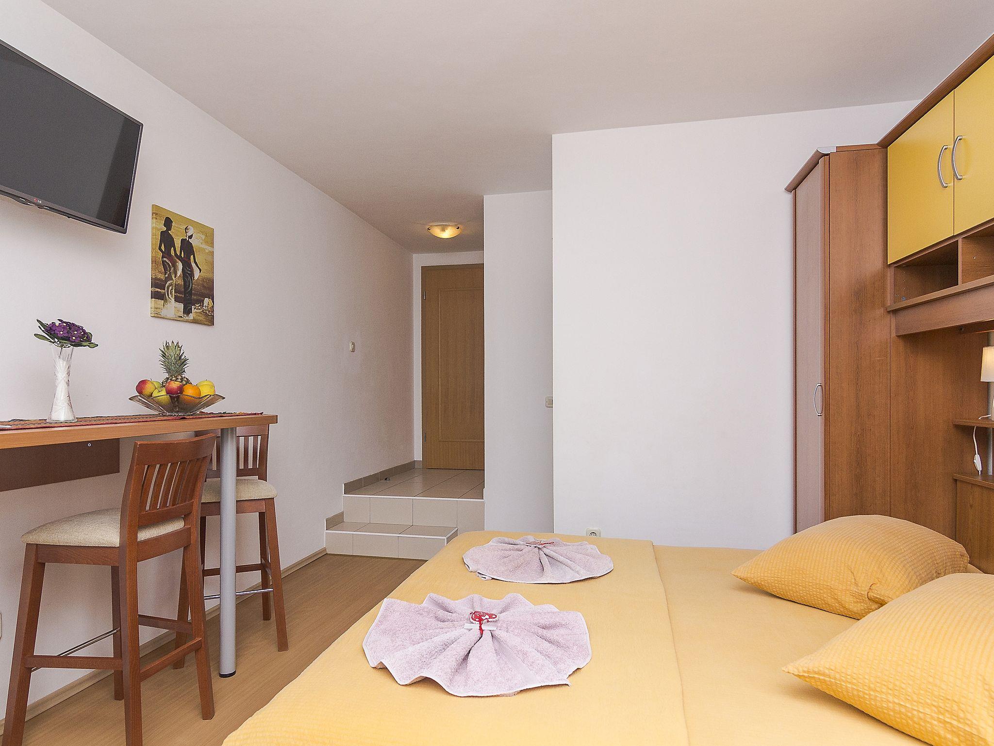 Studio bietet Platz für 3 Gäste. Die Betten sind in Schlafzimmern, die es 1 gibt, innerhalb einer Gesamtfläche von 20m2, angeordnet. Die Gäste haben einen eigenen Balkon zur Verfügung, auf der sie in warmen Sommernächten genießen können. Das Studio-Apartment bietet Meerblick. IM PREIS INBEGRIFFEN: Kurtaxe, Endreinigung, Klimatisierung, Parkplatz, Internet, Kinderbett, Bügeleisen, Bügelbrett, Föhn. VERBINDLICHE ZUSÄTZLICHE KOSTEN: Aufzahlung für Kurzaufenthalte (prozentualer Zuschlag pro Nächtigungsanzahl: 30% - 1, 20% - 2, 10% - 3). Die Verfügbarkeit zusätzlicher Dienstleistungen in Ihrem reservierten Termin und die Preise derselben (falls nicht aufgeführt) müssen im Voraus überprüft werden. Zusätzliche Dienstleistungen die in der Zahlungsaufforderung nicht aufgeführt sind werden direkt beim Vermieter bezahlt, angenommen der Gast nutzt auch diese. Ermäßigung auf den Grundpreis: Gratistag 14=13 (bei einem Aufenthalt von 14 Tagen oder mehr erhalten Sie einen Gratistag für den Aufenthalt bis 31.12.26).