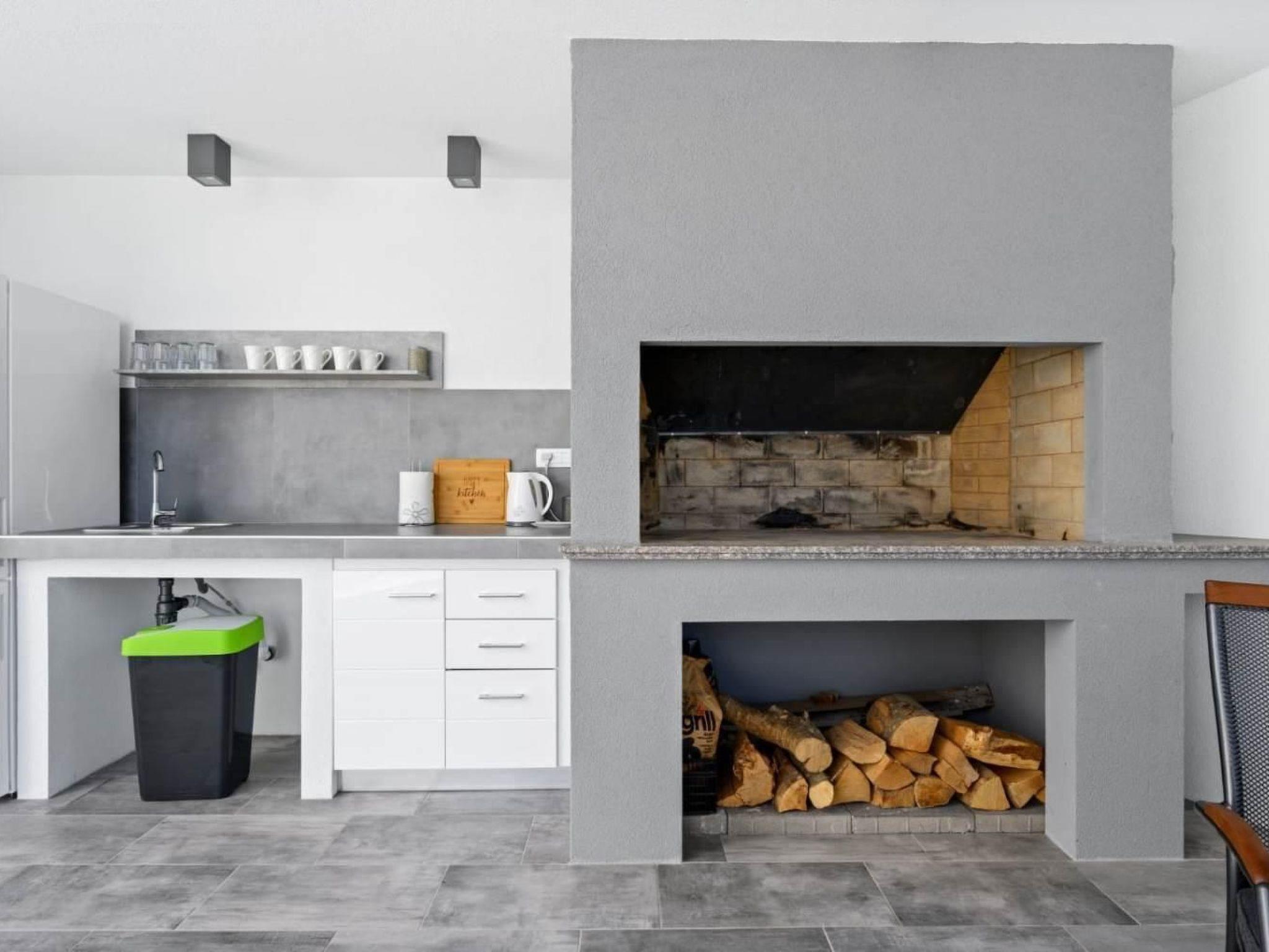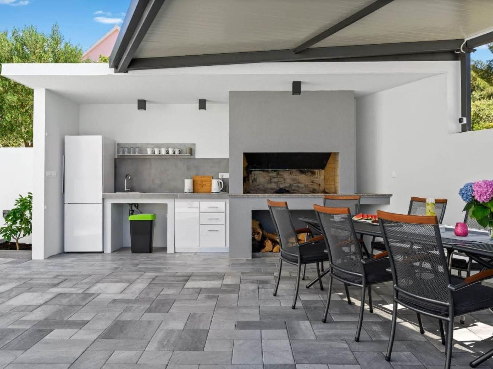 The yard of the villa is fully fenced, which allows you privacy and security. The pool is ready for jumping in, as well as the sun loungers, and sun umbrellas. In the outdoors, there is also a BBQ area with a stone house with a fireplace.