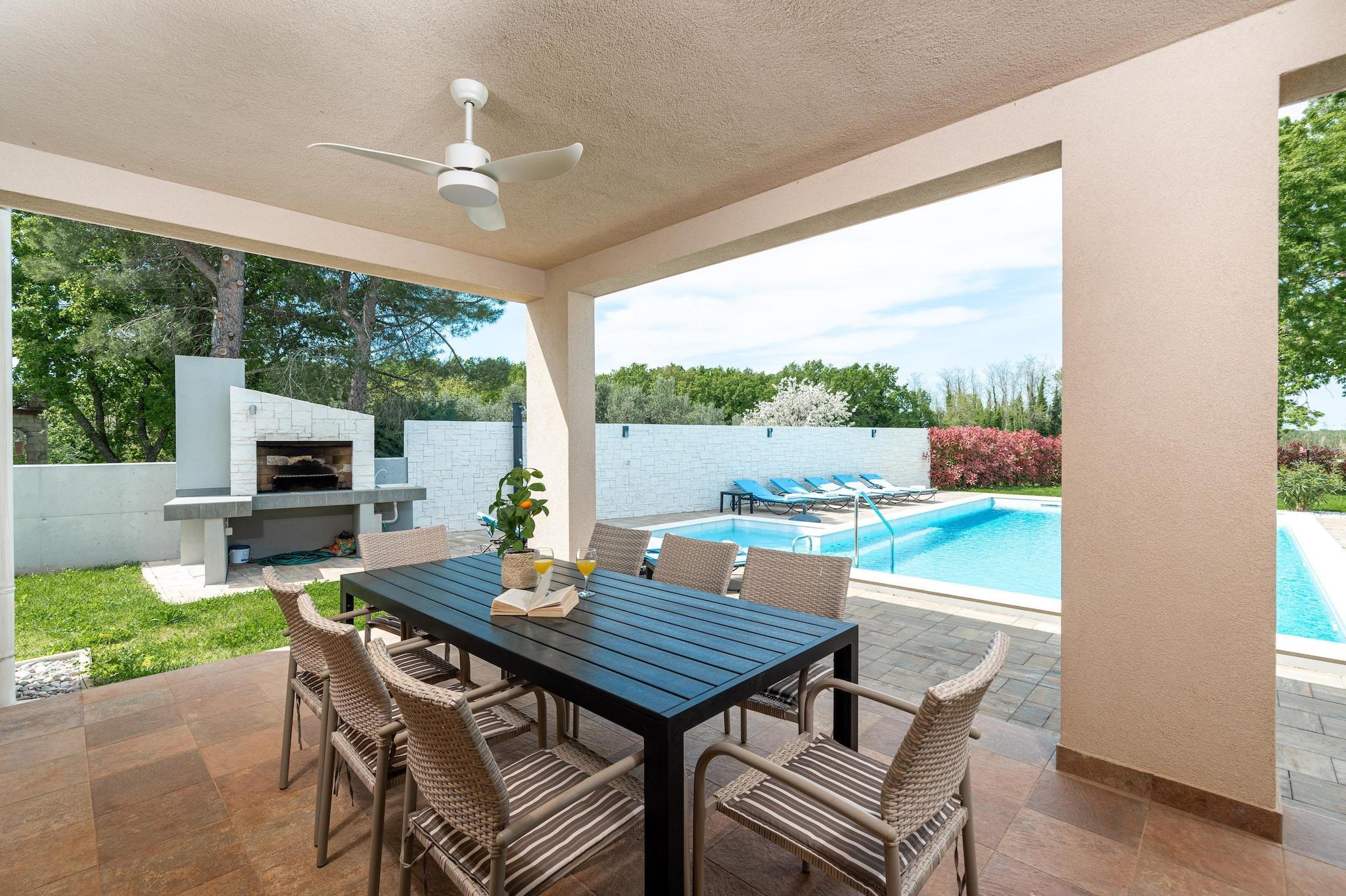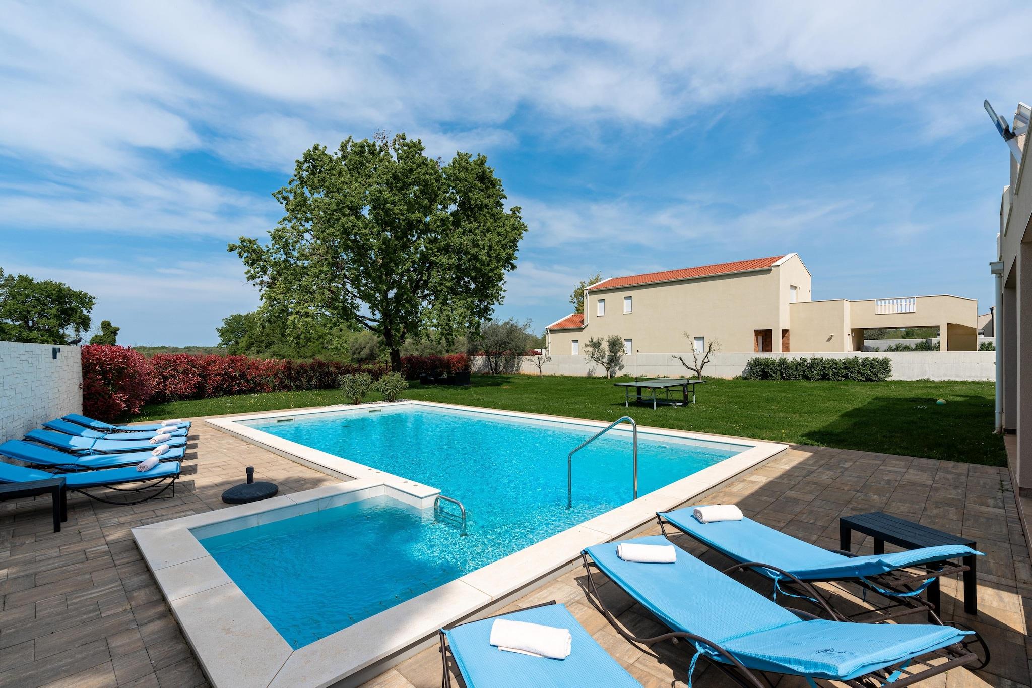 Oplev luksus og komfort i vores fantastiske nye villa i Istrien, Kroatien. Denne udsøgte ejendom har 4 rummelige soveværelser, hver med sit eget badeværelse, designet til afslapning og privatliv, med plads til op til 8 gæster. Forkæl dig med ultimativ afslapning med din private saltbaserede elektrolyse-swimmingpool, som kan opvarmes for din komfort. Denne miljøvenlige pool er skånsom mod huden og venlig mod miljøet. Nyd en sauna med ekstra bruser og toilet for din bekvemmelighed, hvilket skaber en luksuriøs oplevelse under dit ophold i villaen. Nyd at tilberede lækre måltider i det fuldt udstyrede køkken eller slap af i den stilfulde stue, der byder på rigelig plads til underholdning. Udnyt desuden det udendørs grillområde, perfekt til at grille velsmagende retter og skabe uforglemmelige madoplevelser under den istriske himmel. Træd udenfor til den udendørs terrasse og fordyb dig i naturens skønhed i den enorme have, der omgiver villaen. Deltag i venlige konkurrencer med dine kære med faciliteter som bordtennis, bordfodbold og en billard for endeløs sjov.