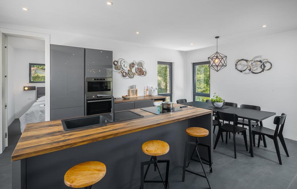 I en rolig beliggenhed finder I denne juvel på landet. Det moderne og smukke feriehus vil imponere jer med sit design, indretning og sin feel-good atmosfære. Privatlivets fred er også bevaret, selv hvis I er på en stor familieferie, fordi antallet af soveværelser og badeværelser lover jer afslappende nætter og mulighed for at blive klar på samme tid. Husets elegante indretning inviterer jer til at slappe af i stuen og lægge fødderne op efter en aktiv feriedag. Det store køkken giver jer plads til at tilberede feriens måltider sammen og spise på den overdækkede terrasse. svøm et par baner i Infinity-poolen, eller slap af mens I beundrer udsigten til den omkringliggende grønne vegetation med et glas vin.