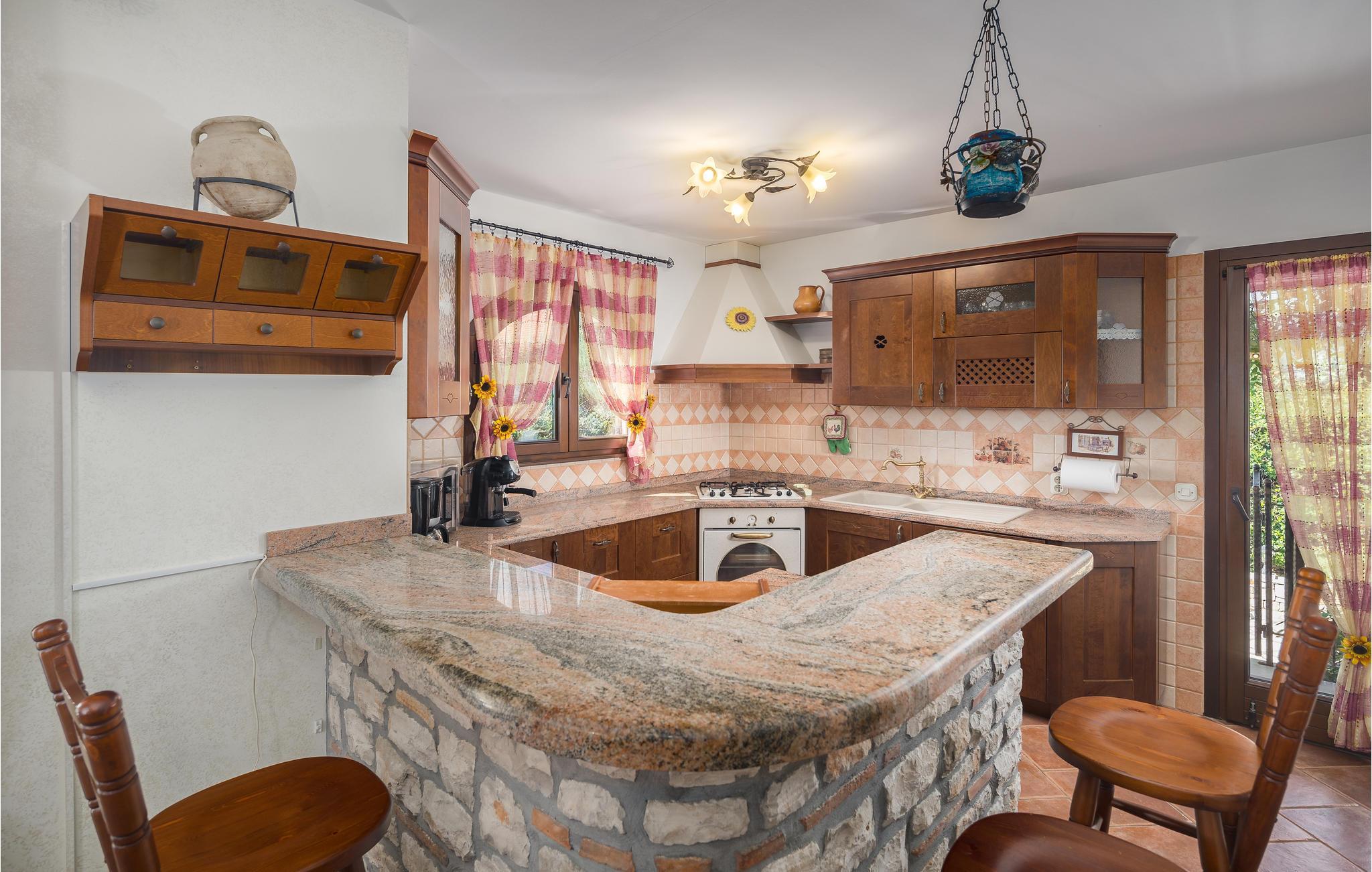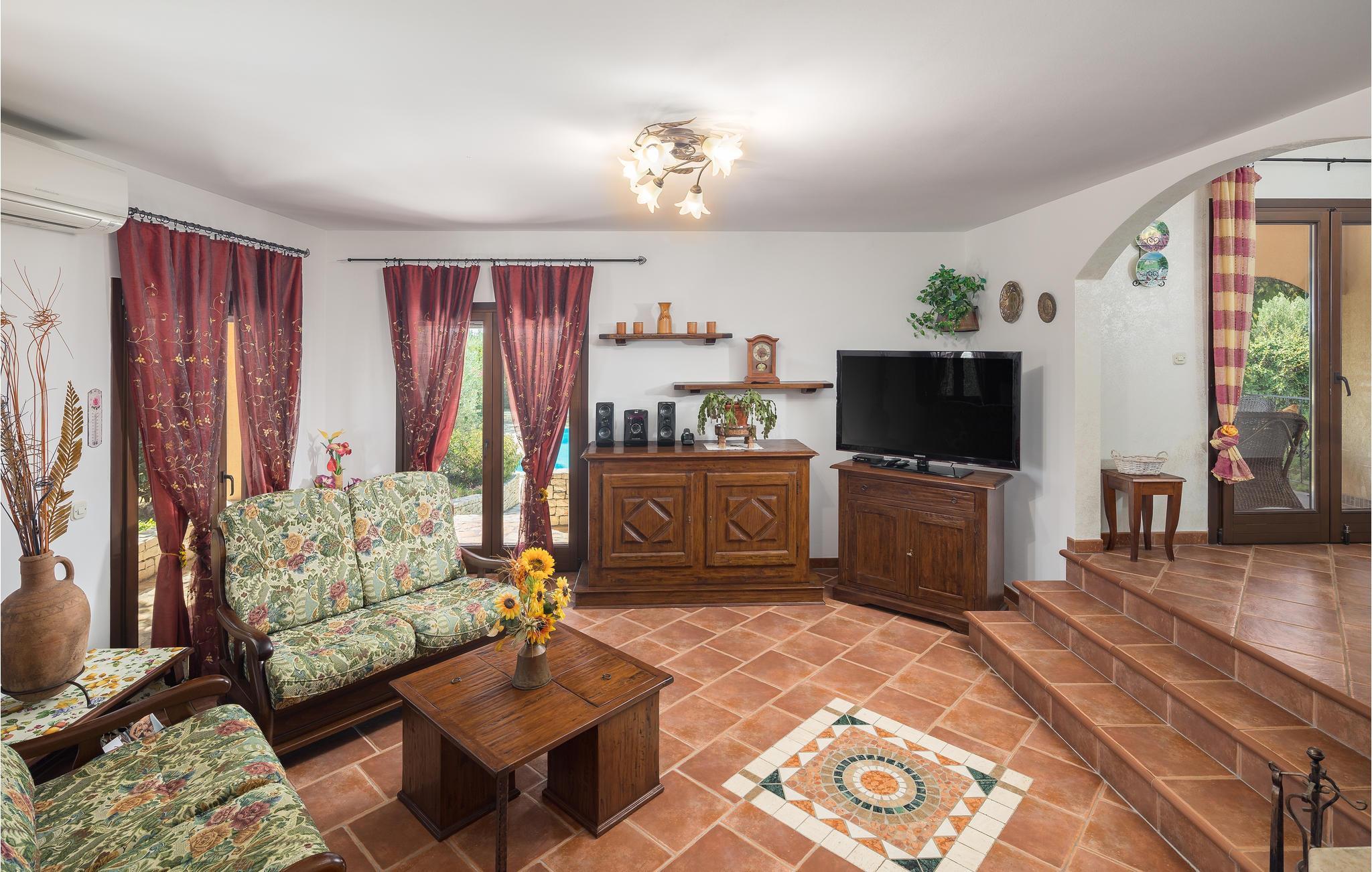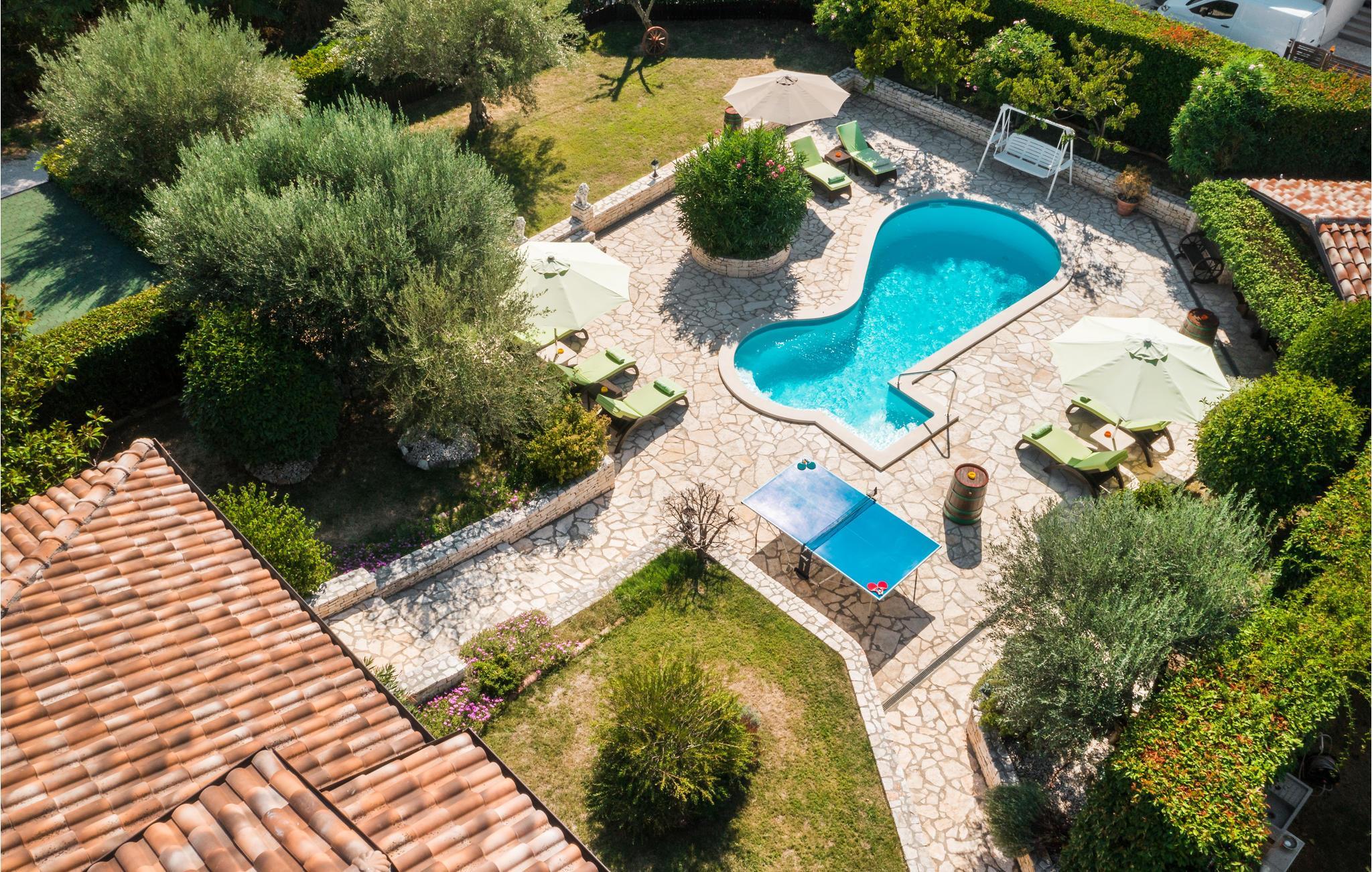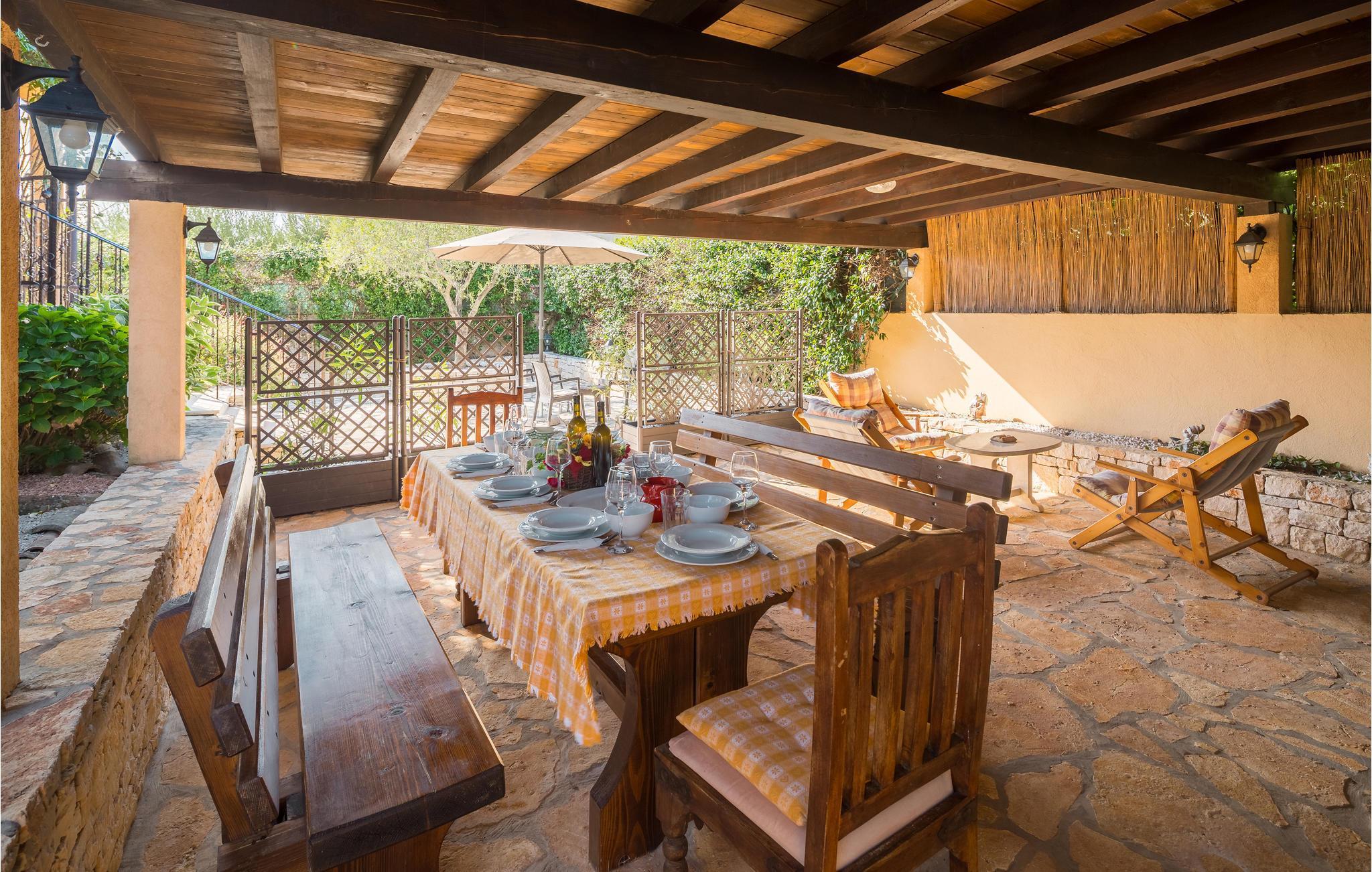 Dette flotte feriehus består af mange rustikke elementer og giver jer det perfekte sted til en familieferie. Her kan I slappe af sammen og udforske de forskellige rum. Der er meget at lave, også hvis I trænger til at holde en pause fra varmen indendørs, enten i baren, hvor der er et poolbord eller i selskabslokalet med åben brændeovn. Hyggelige terrasser og altaner giver jer også mulighed for at sætte jer med en bog og nyde en alenestund. Ud over en forfriskende dukkert i swimmingpoolen er der også et bordtennisbord i haven, så her kan I lave jeres egen lille familieturnering.