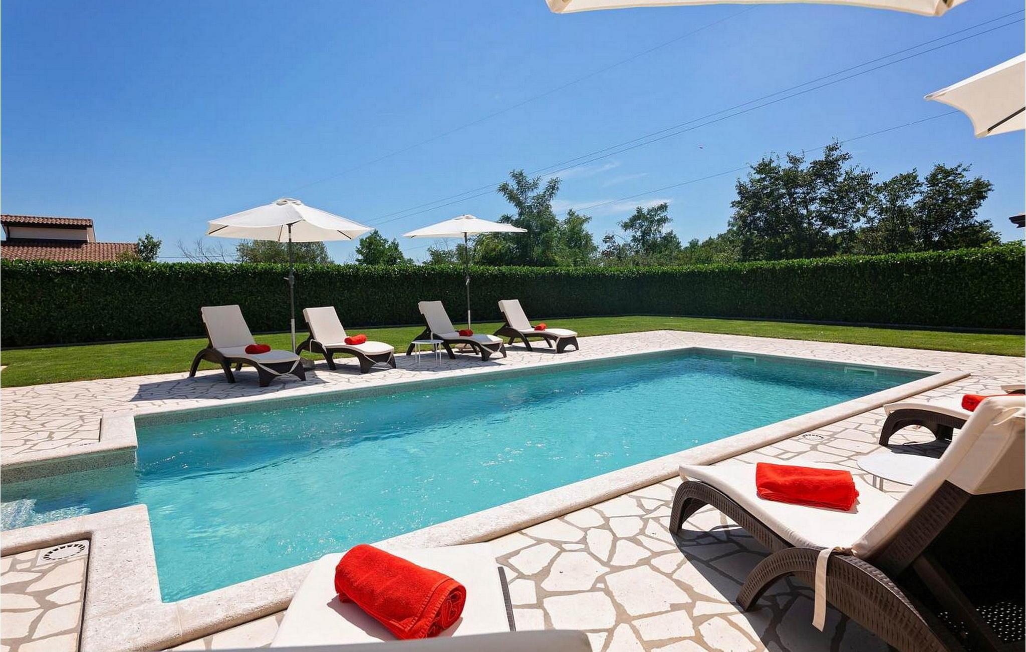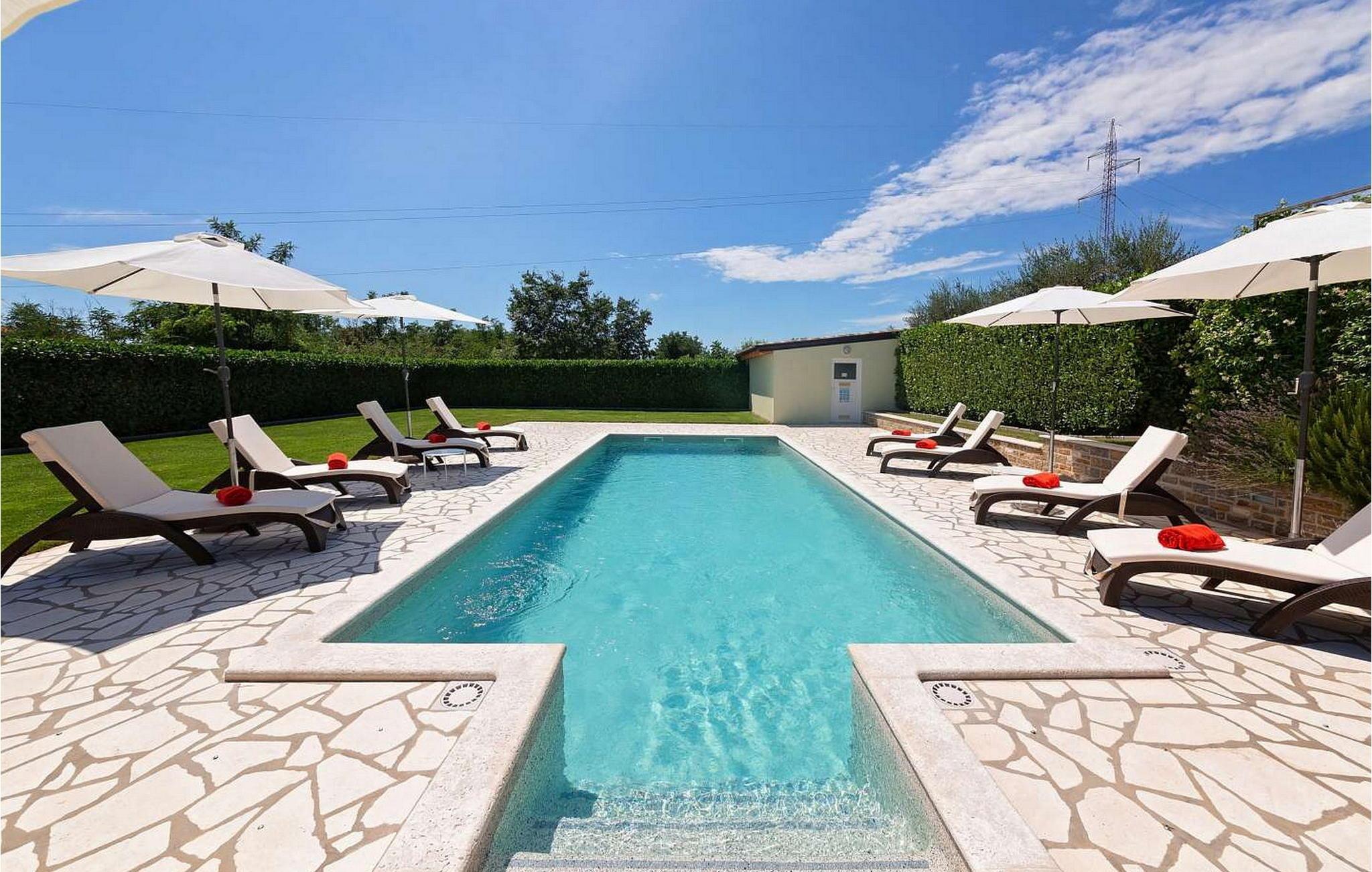 Villa Inga er en nybygget fritliggende villa med pool beliggende i udkanten af Kastel nær den kroatiske slovenske grænse og kun 8,5 km fra de dejlige grusstrande ved turiststedet Kanegra. Området er kendt for kvalitetsrestauranter og konobas (typiske istriske taverner), topvinproducenter og olivenolieproducenter, men mest berømt for den hvide trøffels delikatesse, ideel til topgourmetoplevelser. Beliggende på en velholdt have på 1100 kvm, tilbyder villa Inga følgende udendørs udstyr: privat pool på 36 kvm, sommerkøkken med stor grill pejs og overdækket terrasse med spisebord til 10 gæster og satellit-tv, en anden overdækket terrasse med siddesæt og 4 cykler. Villa med pool til 8 gæster med et samlet boligareal på 150 kvm fordelt på to etager med aircondition. I stueetagen er der en rummelig opholdsstue med siddesæt og spisebord, fuldt udstyret køkken, et soveværelse med dobbeltseng med enkeltsenge og bad/toilet. På første sal er der et soveværelse med dobbeltseng med enkeltsenge og balkon, bad/toilet på gangen, et dobbeltværelse med dobbeltseng, bad/toilet og et dobbeltværelse med dobbeltseng, bad/toilet og balkon. BEMÆRK: Gæster har gratis adgang til feriestedet Kanegra under deres ophold. Bemærk venligst, at denne ejendom ikke accepterer ungdomsgrupper eller polterabends. En ungdomsgruppe på denne ejendom er en gruppe bestående af personer på 26 år eller derunder. Book ikke denne ejendom, hvis du er en ungdomsgruppe eller et polterabend, da din reservation vil blive afvist efter booking, hvilket kan omfatte ved ankomst til ejendommen eller under dit ophold, og du vil ikke blive refunderet.