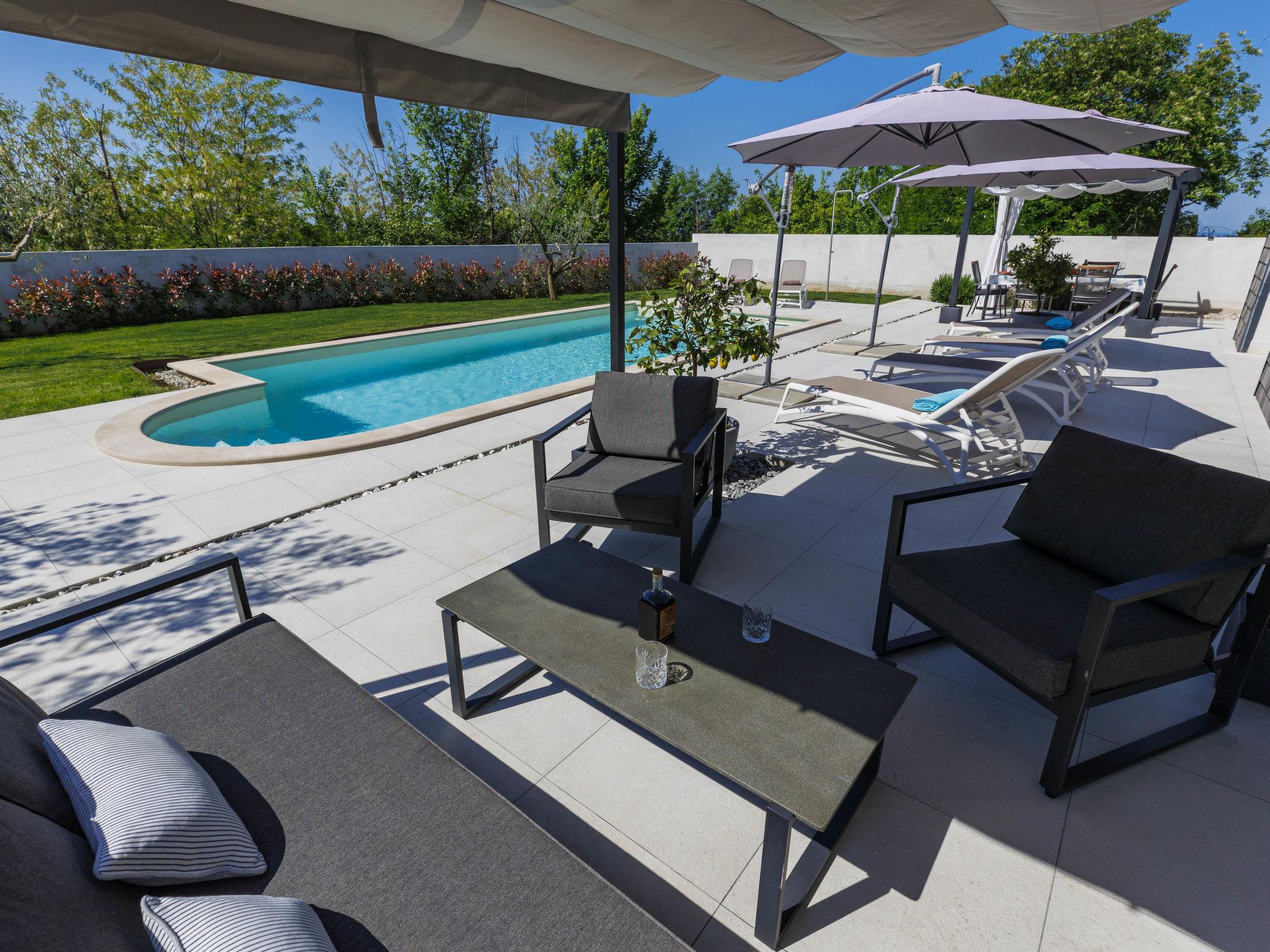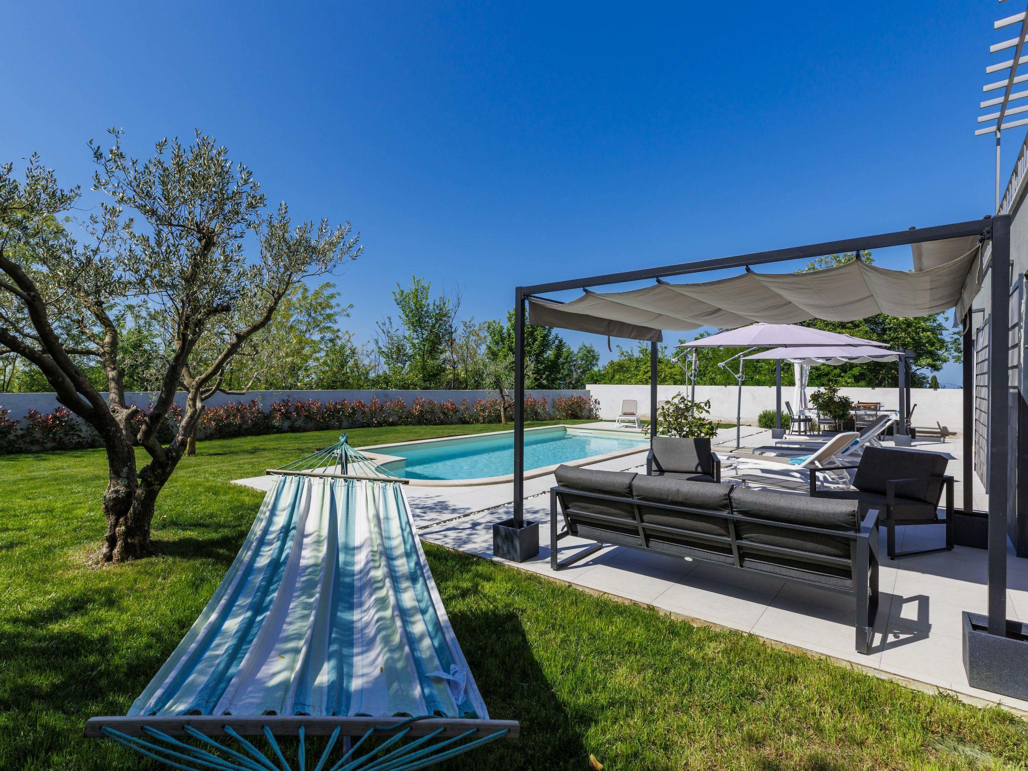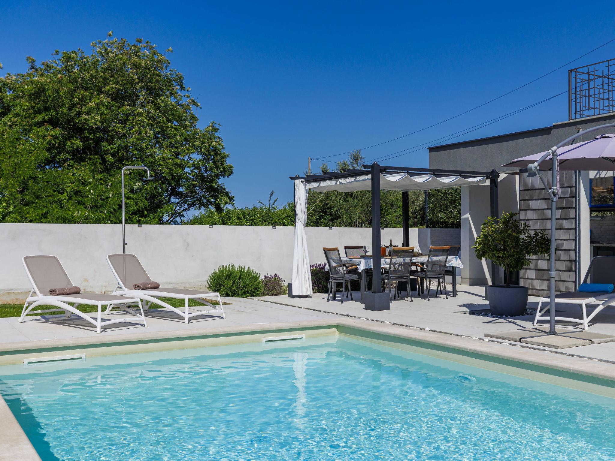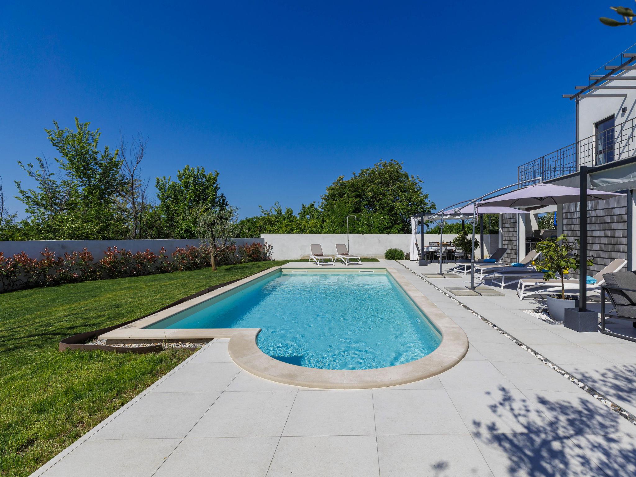 Beautiful single-family house "Villa Sonja". Outside the resort, 1 km from the centre of Buje, in a sunny position, 12 km from the sea. Private: property 500 m2, garden with lawn, swimming pool angular (8 x 4 m, depth 150 cm, seasonal availability: 01.May. - 31.Oct.) with internal staircase and salt-electrolysis pool-cleaning system. Outdoor shower, table tennis, barbecue, children's playground (slide, swing), pool maintenance by the owner/gardener. In the house: internet access, trampoline, washing machine, tumble dryer. Parking (for 2 cars) at the house on the premises. Shop 1 km, supermarket 1 km, restaurant 2 km, bus stop 800 m, pebble beach 12 km, rocky beach 12 km. Golf course (18 hole) 18 km, walking paths from the house 200 m, cycle lane 250 m. The owner does not accept any youth groups. Organizing a party is not allowed.