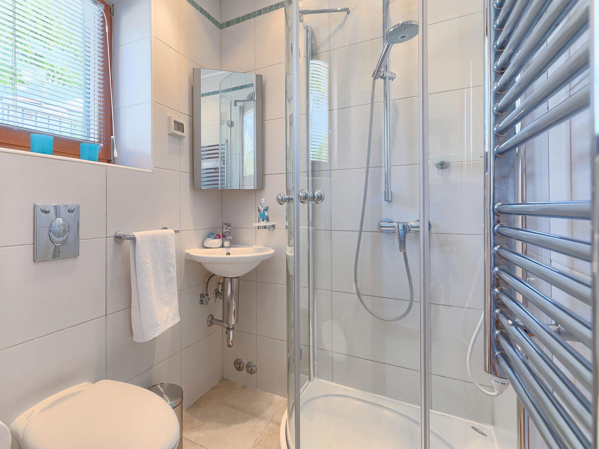 "Nini", 4-room terraced house 101 m2 on 2 levels. Tasteful and cosy furnishings: 1 room with 1 french bed (160 cm, length 200 cm), air conditioning. Exit to the terrace. 2 rooms, each room with 2 beds (80 cm, length 200 cm). Shower/WC, bath/shower/WC. Upper floor: living/dining room 50 m2 with satellite TV (flat screen), air conditioning. Exit to the terrace. Open kitchen (oven, dishwasher, 4 ceramic glass hob hotplates, microwave, freezer). Sep. WC. Floor heating. Terrace 20 m2, terrace 12 m2. Terrace furniture, deck chairs. Distant view of the sea. Facilities: safe. Internet (WiFi, free).