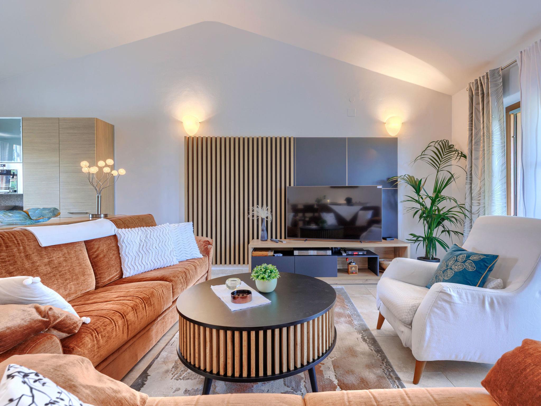 "Diana", 3-room terraced house 116 m2 on 2 levels. Tasteful and cosy furnishings: 1 room with 1 french bed (160 cm, length 200 cm), satellite TV (flat screen), air conditioning. Exit to the terrace. 1 room with 2 beds (80 cm, length 200 cm). Shower/WC, bath/shower/WC. Upper floor: living/dining room 50 m2 with satellite TV (flat screen), air conditioning. Exit to the terrace. Open kitchen (oven, dishwasher, 4 ceramic glass hob hotplates, microwave, freezer). Sep. WC. Underfloor heating. Terrace 20 m2, terrace 12 m2. Terrace furniture, deck chairs. Distant view of the sea. Facilities: safe. Internet (WiFi, free).