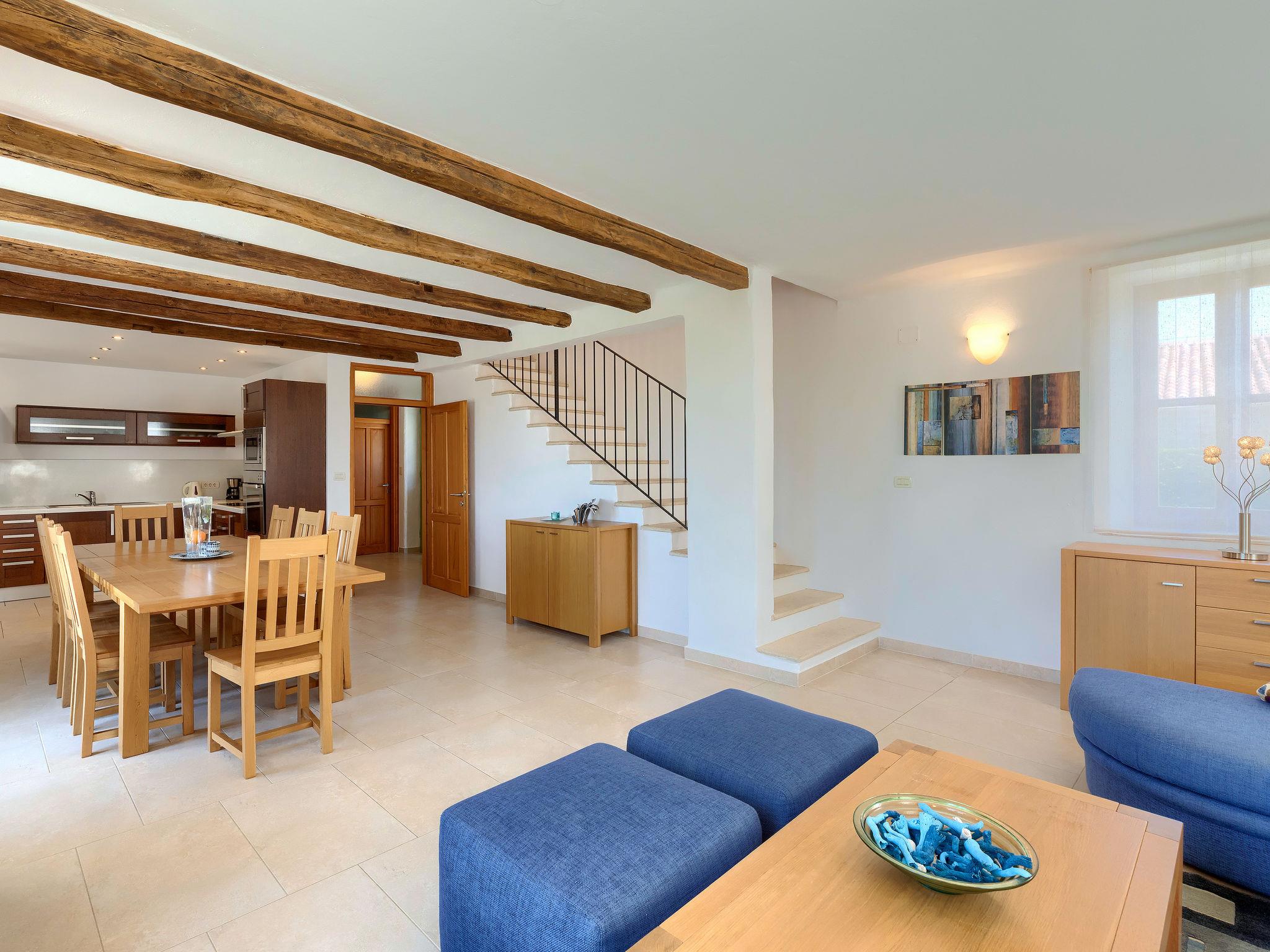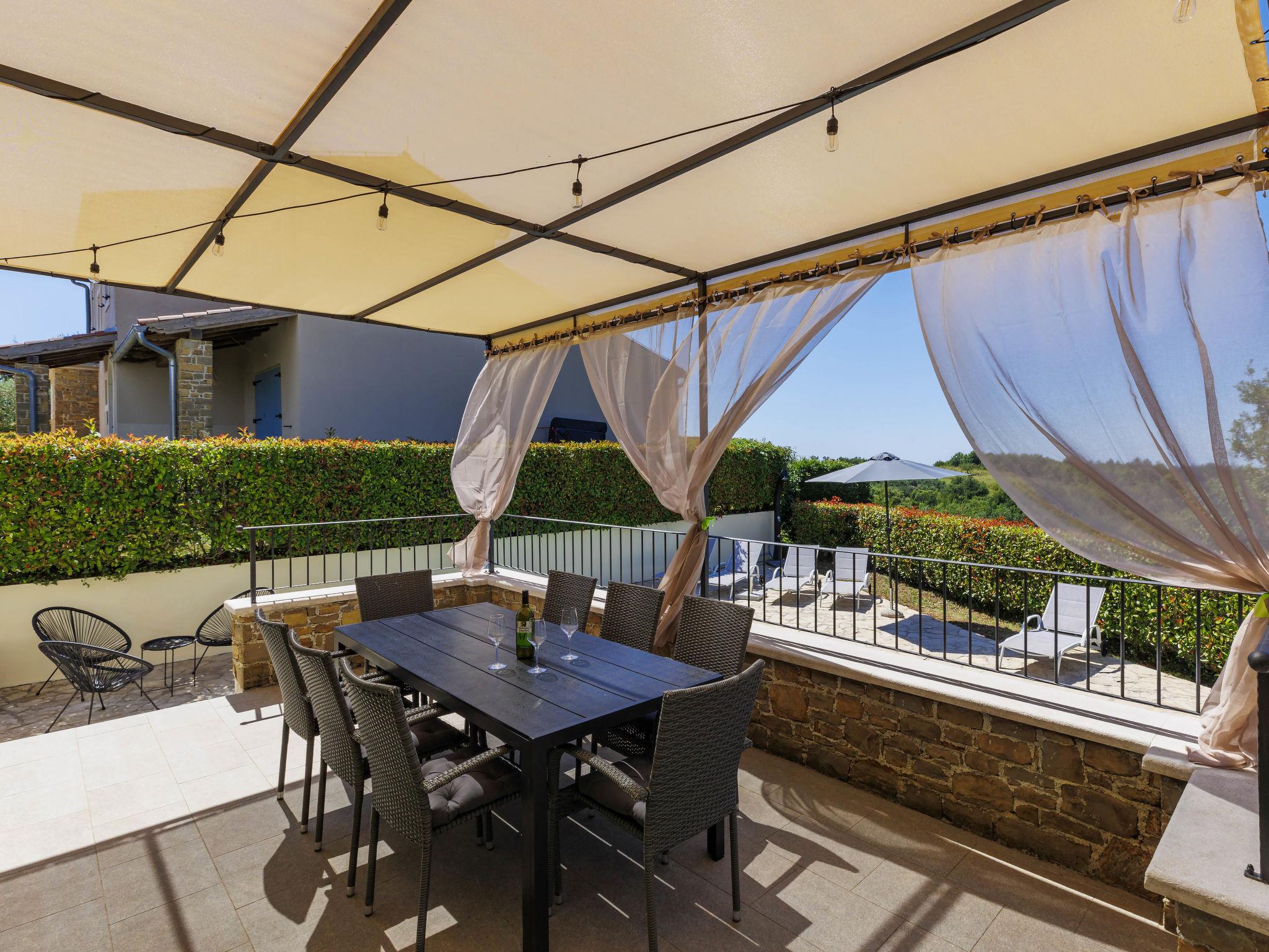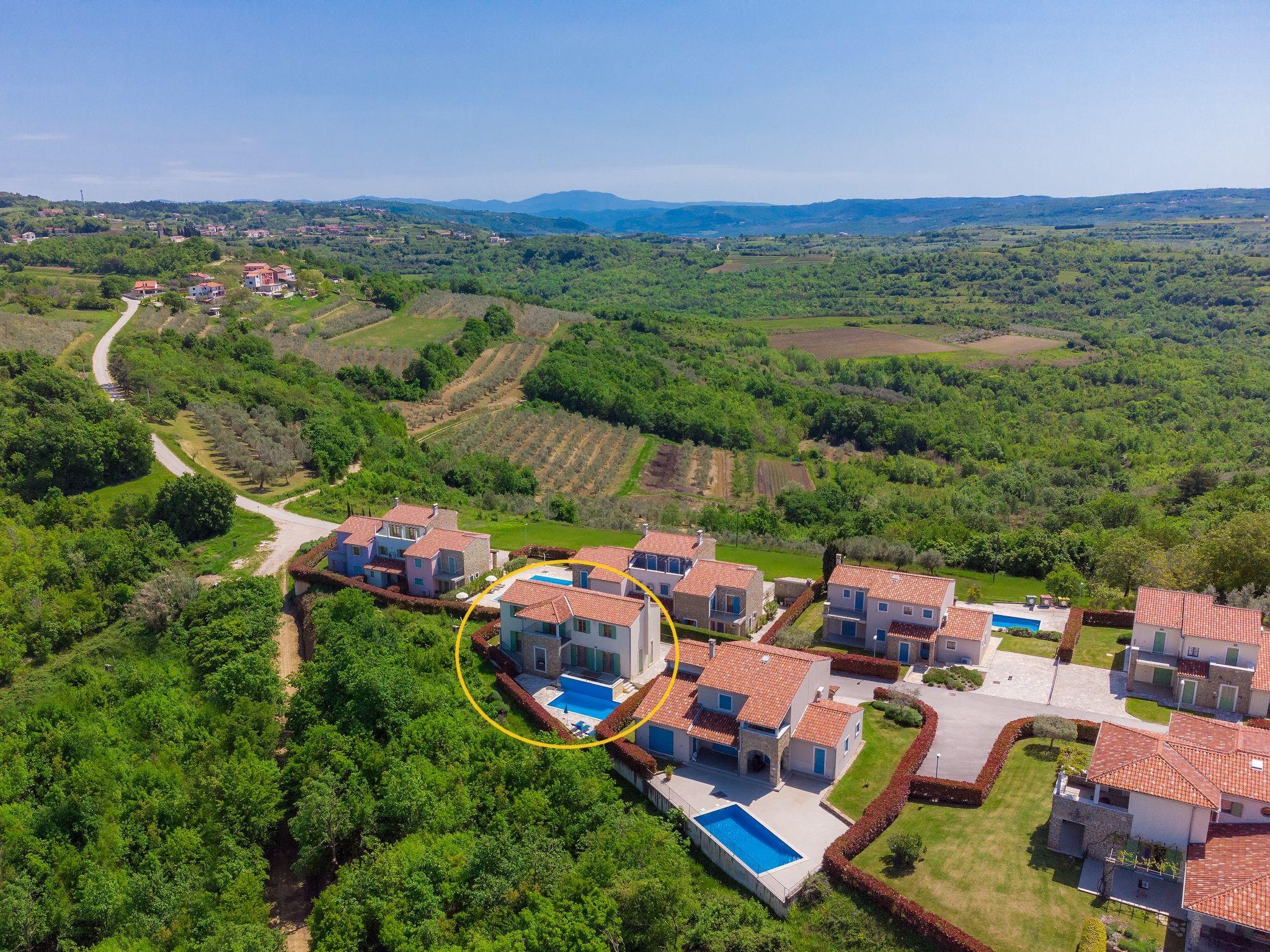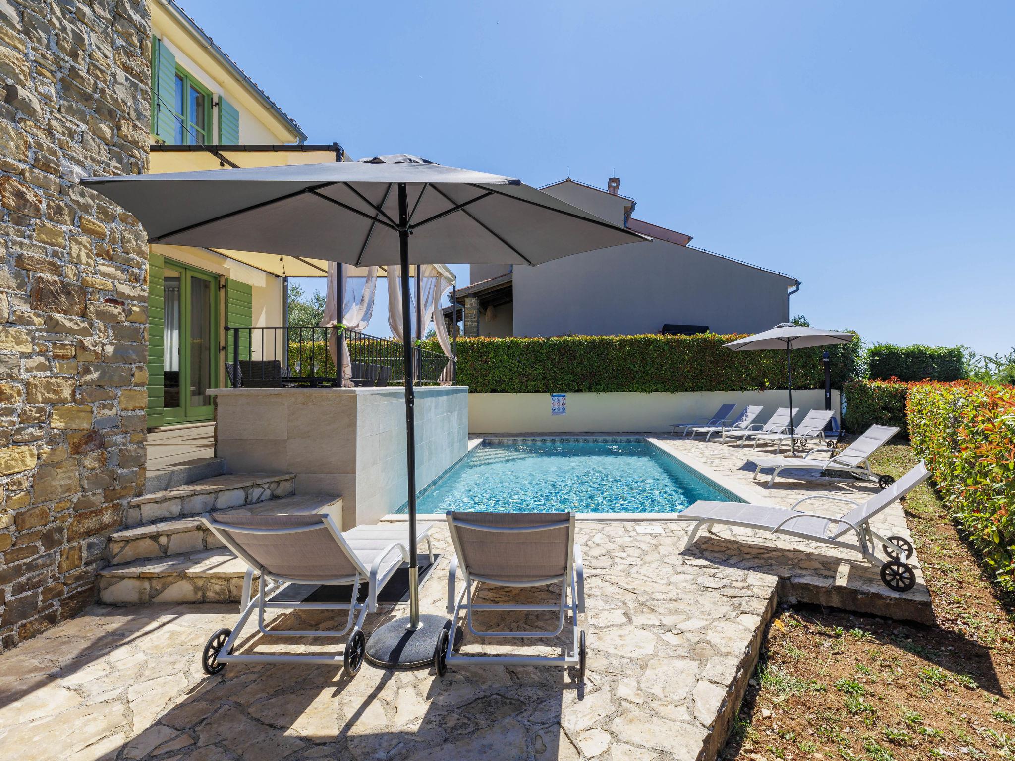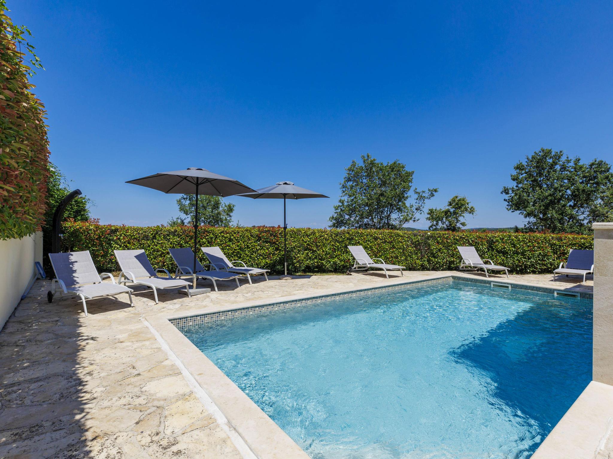 Beautiful villa "Morgan", 2 storeys. In the hamlet Baredine 4 km from the centre of Buje, in a quiet, sunny, elevated position, 17 km from the sea. Private: property 300 m2, small garden with lawn, swimming pool angular, heated (8 x 4 m, depth 140 cm, seasonal availability: 15.Apr. - 15.Oct.) with internal staircase. Outdoor shower. In the house: internet access, washing machine, tumble dryer. Parking at the house on the premises. Shop 4 km, restaurant 1 km, bus stop 4 km, railway station 33 km, pebble beach 17 km. Tennis 16 km, sports centre 16 km, walking paths from the house 1 km, cycle lane 1 km. Nearby attractions: Aquapark 19 km.