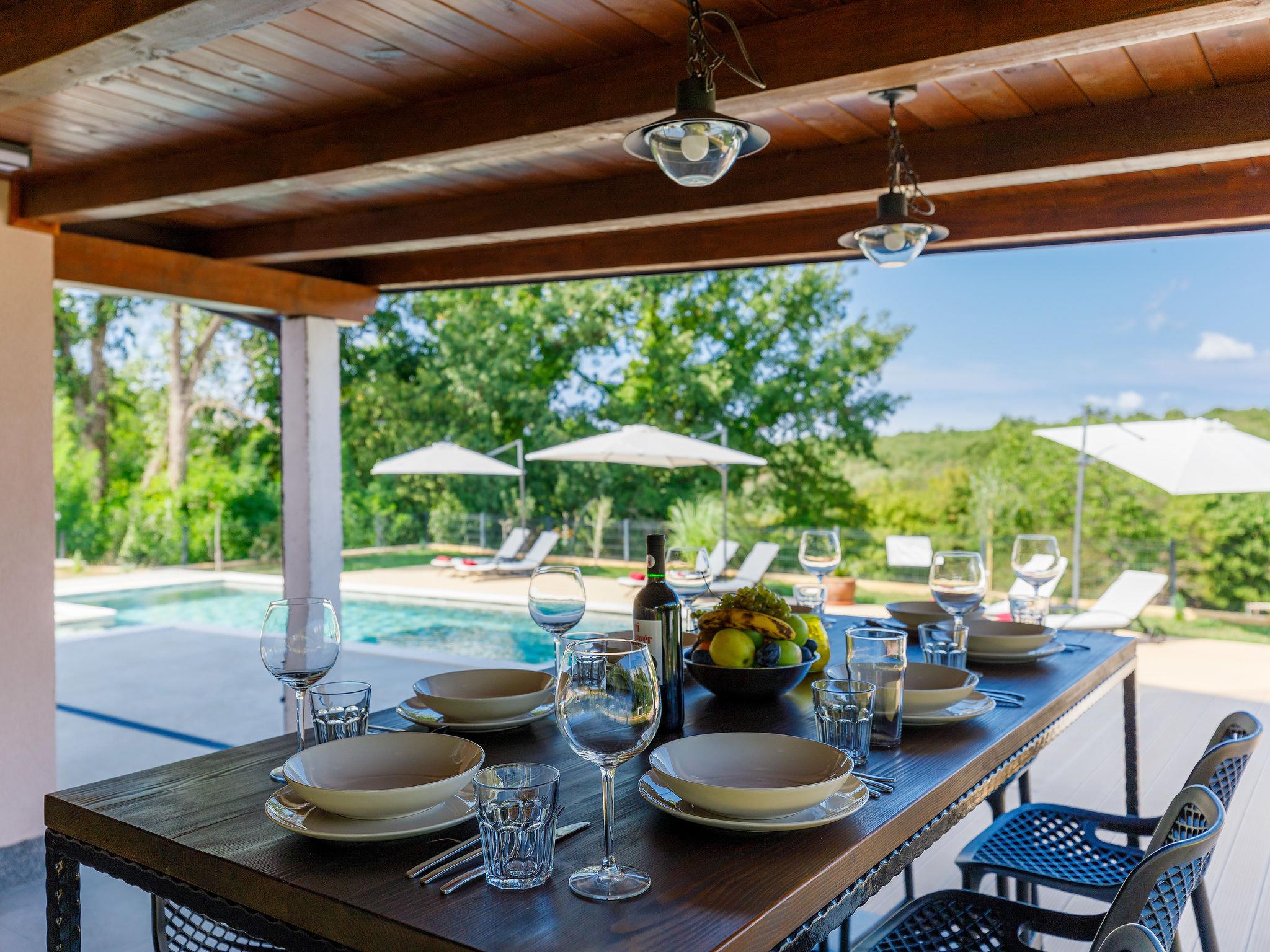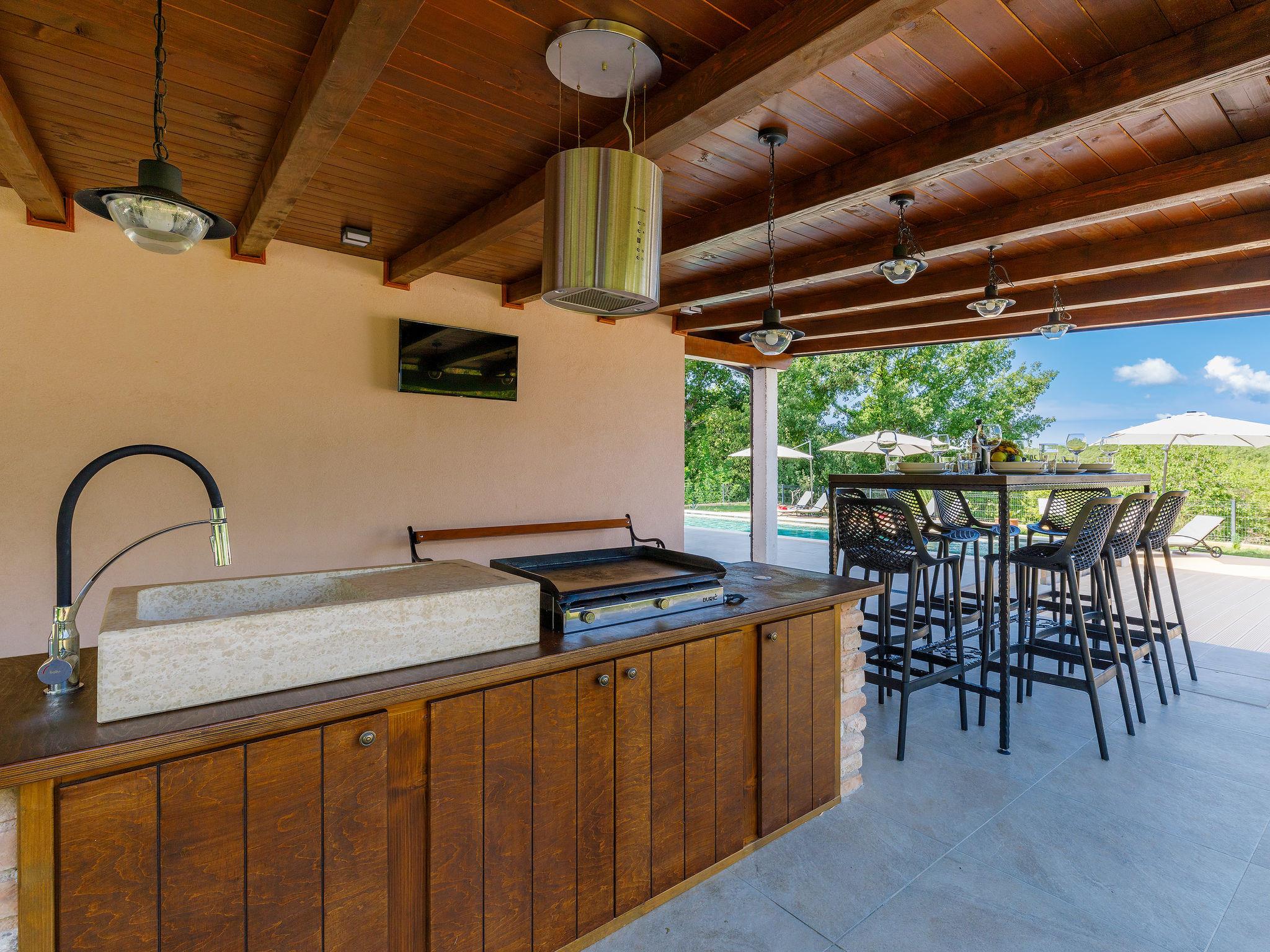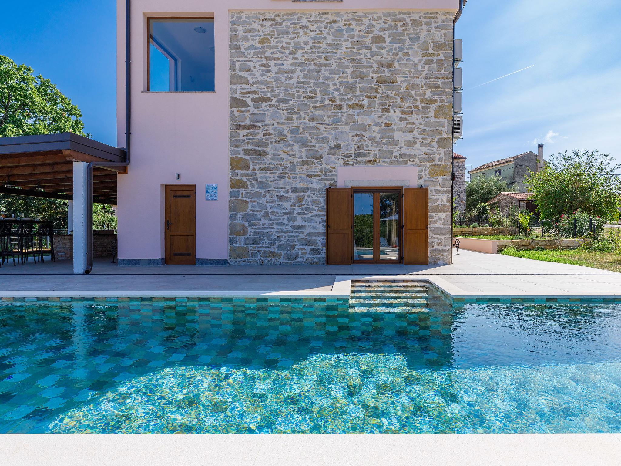 Single-family house "Villa Julia", 3 storeys, renovated in 2021. In the hamlet Buroli 5 km from the centre of Buje, 10 km from the centre of Umag, in a quiet, sunny position, 5 km from the sea. Private: property 650 m2 (fenced), garden, swimming pool angular (11 x 3 m, depth 150 cm, seasonal availability: 01.May. - 01.Oct.) with internal staircase. Paddling pool, outdoor shower, terrace (25 m2), garden furniture, barbecue, pool maintenance by the owner/gardener. In the house: internet access, washing machine. Roofed, parking (for 4 cars) at the house on the premises. Shop 2.5 km, supermarket 5 km, restaurant 2.5 km, bus stop 1.8 km, pebble beach 5 km, rocky beach 5 km. Please note: airfield 90 km from the property. Swimming pool with hydromassage.