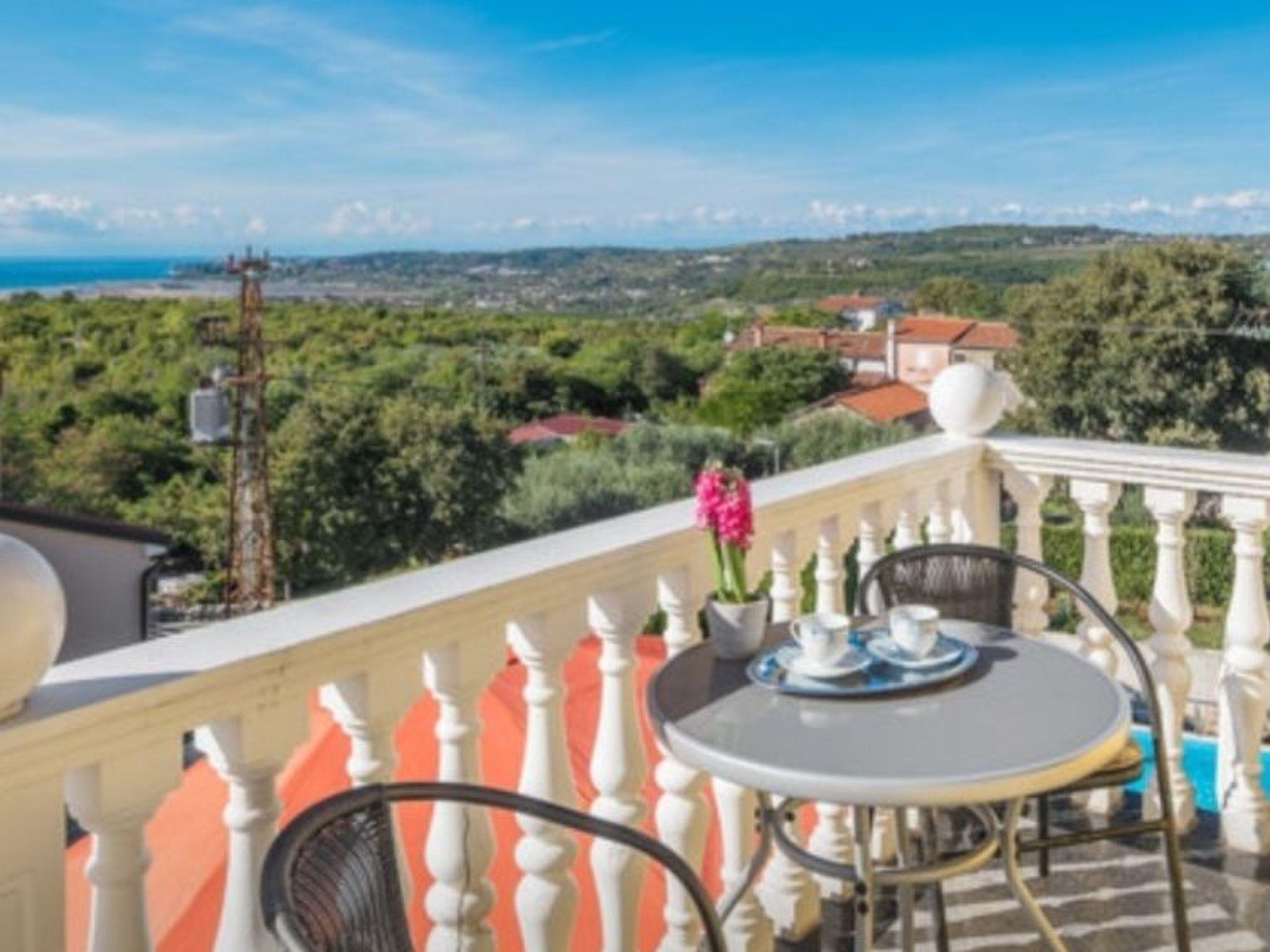 Three living rooms, three dining rooms and three kitchens and three bathrooms, one with shower and two with bath and washbasin. Each floor is approx. 100 m² in size. The furniture is new and harmoniously coordinated. While the bathrooms, hallway, dining room and kitchen are tiled, the bedrooms and living room have parquet flooring. Ground floor. Bedroom has a double bed of 200 cm x 180 cm. with wardrobe and mirror, bedside tables and lighting next to the Second bedroom on the ground floor A bed. 180×100 bedroom in wardrobe, desk, wardrobe and lighting next to the bed. Coffee maker (filter) kettle, salami slicer, toaster, egg cooker, for walking, blender, crockery, all kinds of classes, kitchen towels, etc. Large baguette with table and chairs. Living room with TV and all programmes. First floor two bedrooms, one with double beds 180×200 and also bedside tables with lighting above the bed. Chest of drawers. Second bedroom is equipped with two beds of 180×100. Kitchen, which is also a set as on the ground floor with dining area for eating. And living room with corner sofa, chest of drawers. Balcony door with access to a large terrace with large table, chairs and parasol where you can spend a pleasant time with beautiful views of the sea, Slovenia, Italy and the Alps. In the attic (with a slope) there is a small kitchen with a dining room and a living room. Two bedrooms. One with a double bed 180x200 and the other with a bed and a cot. Wardrobes, bedside tables. There are 3-4 parking spaces on the property.