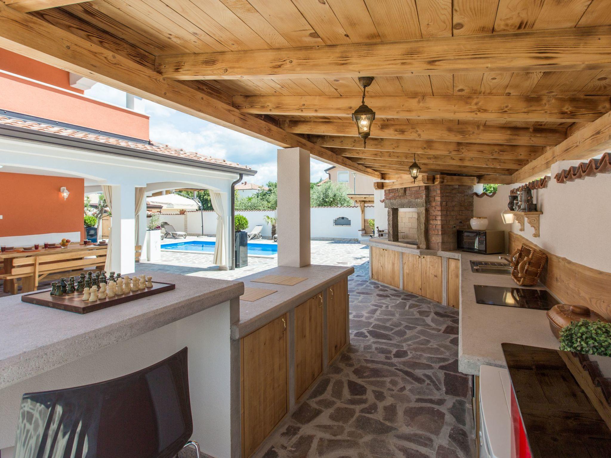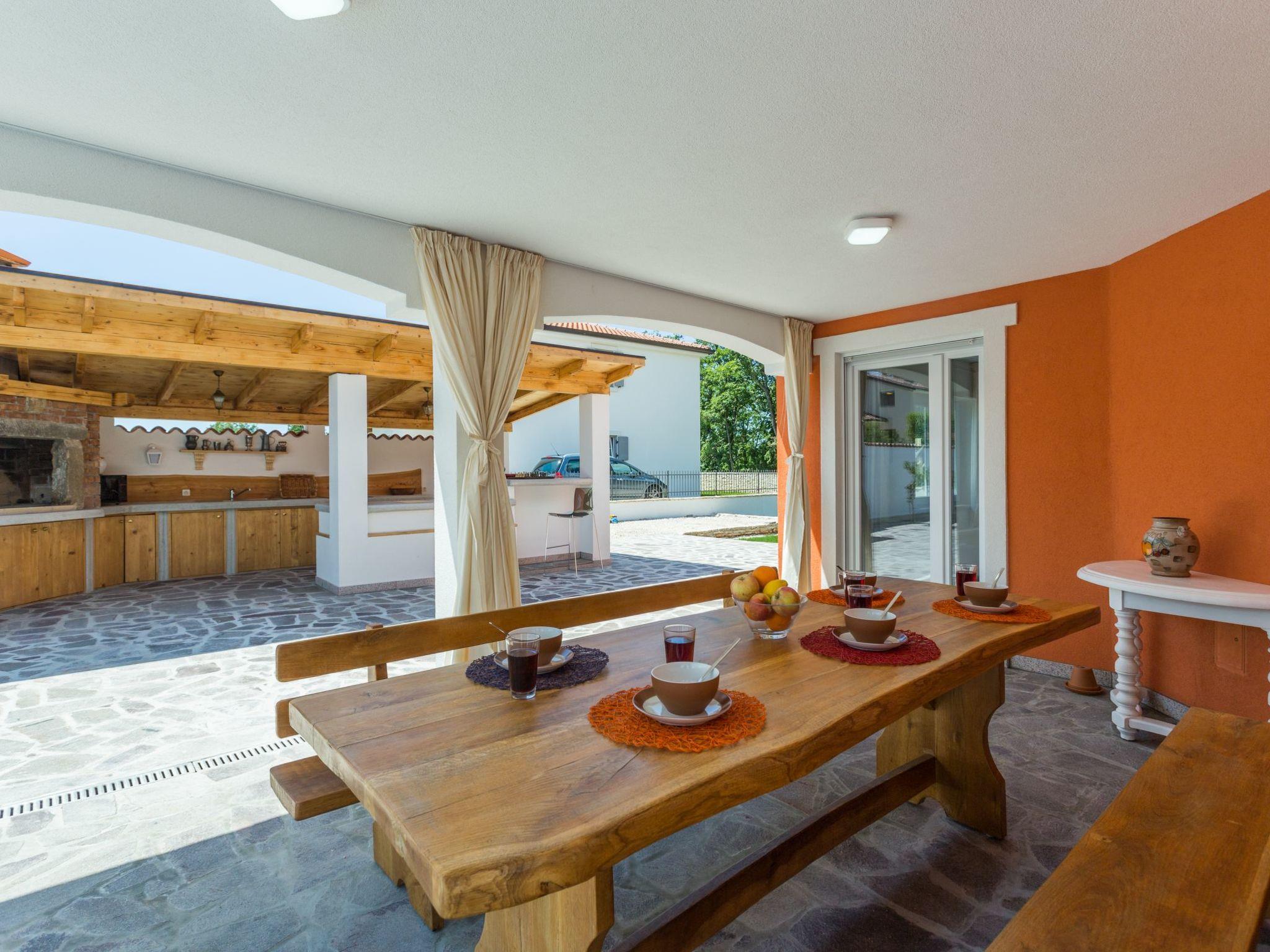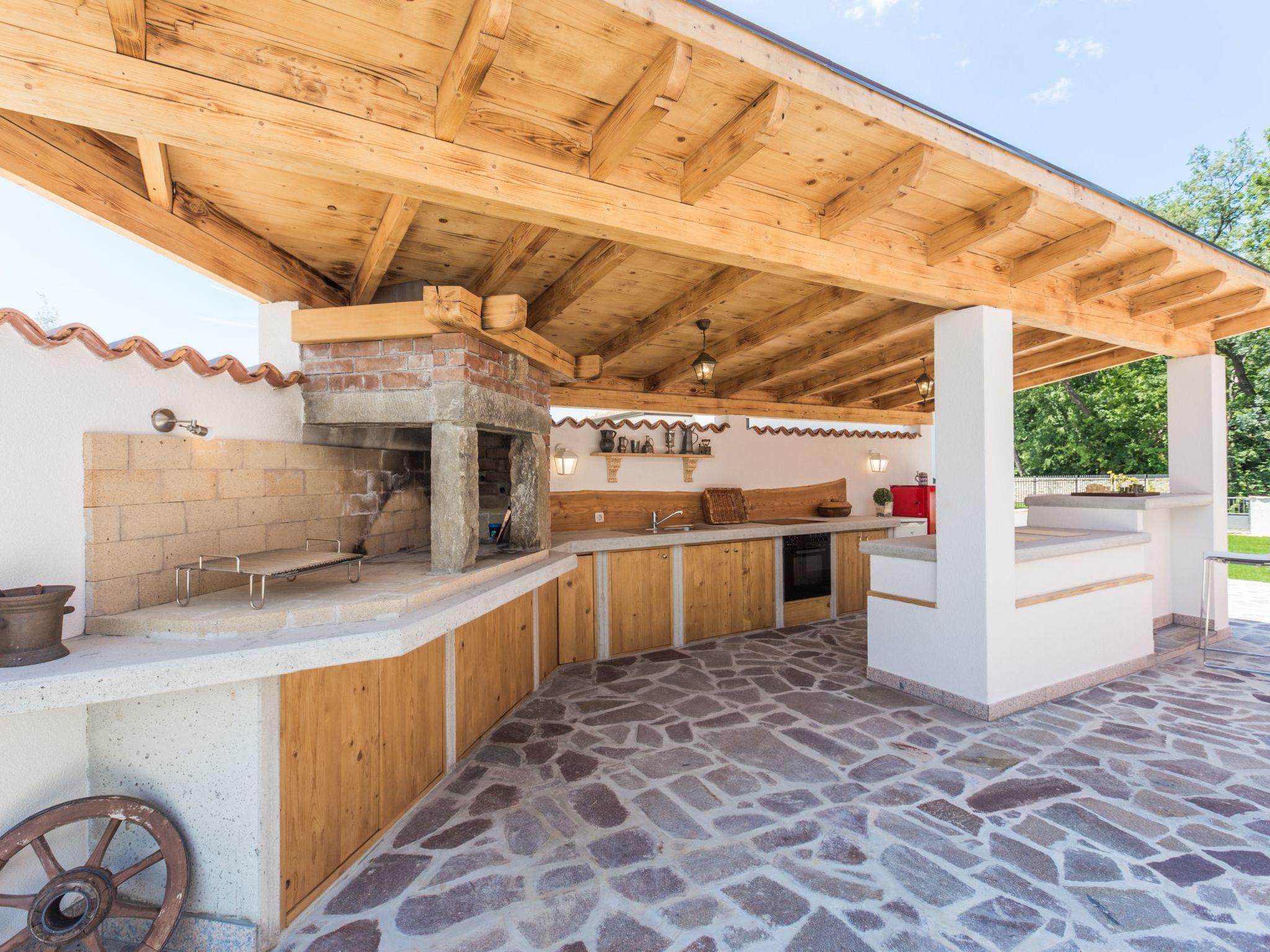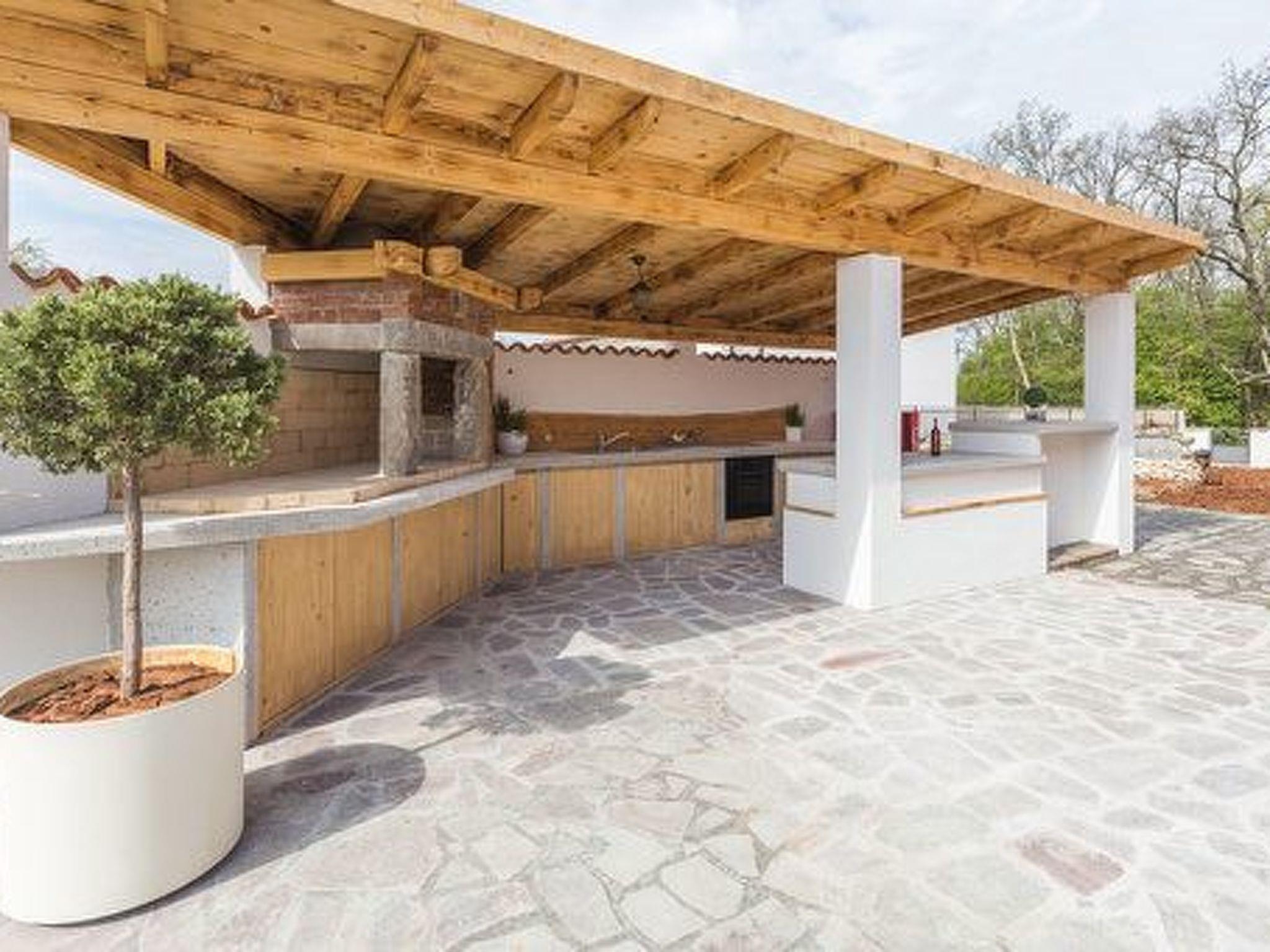 The outdoor area of the villa, which is fenced and therefore ideal for children and pets, offers an oasis of relaxation: a lawn with sun loungers and parasols invites you to sunbathe, while a covered seating area and a terrace with an outdoor dining area invite you to linger outdoors. An outdoor kitchen and barbecue are available to make dining under the Istrian sky a special experience.