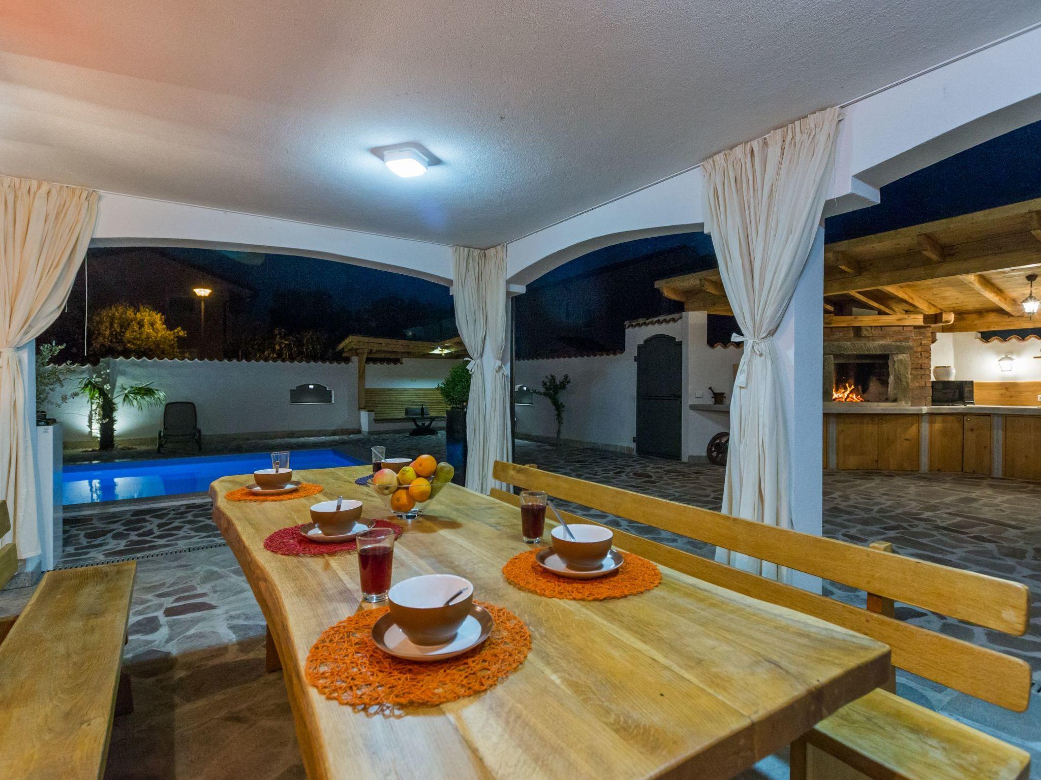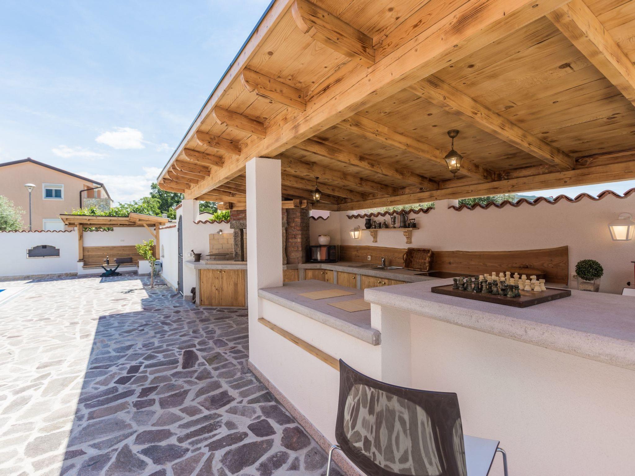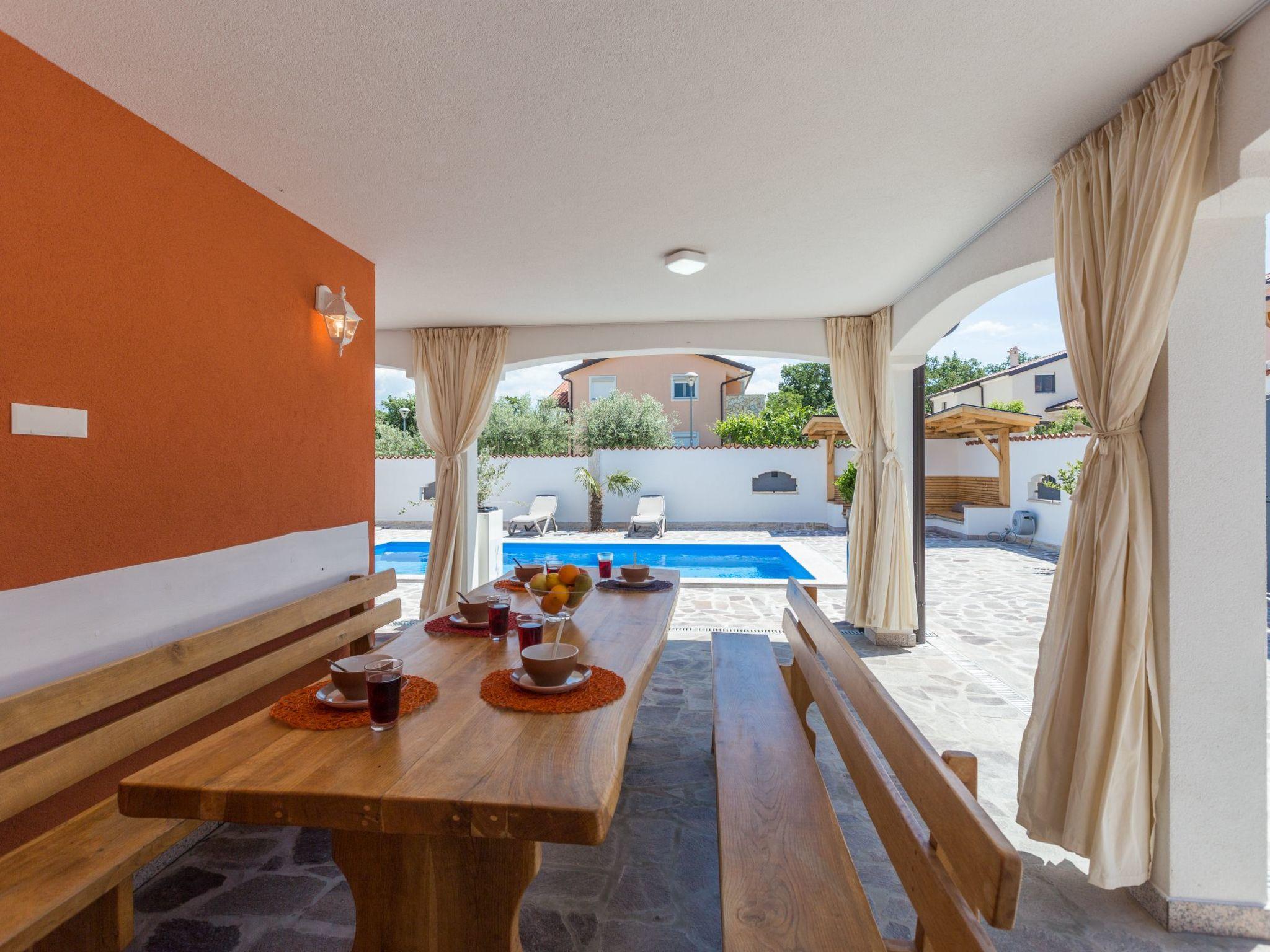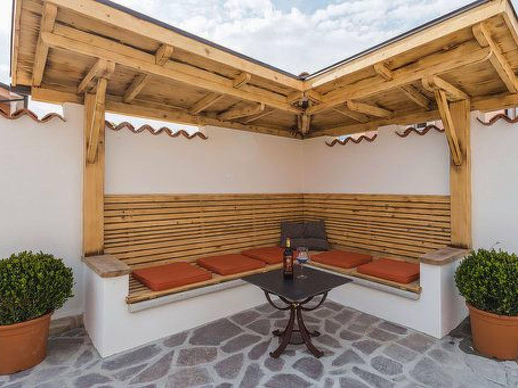 The outdoor area of the villa, which is fenced and therefore ideal for children and pets, offers an oasis of relaxation: a lawn with sun loungers and parasols invites you to sunbathe, while a covered seating area and a terrace with an outdoor dining area invite you to linger outdoors. An outdoor kitchen and barbecue are available to make dining under the Istrian sky a special experience.
