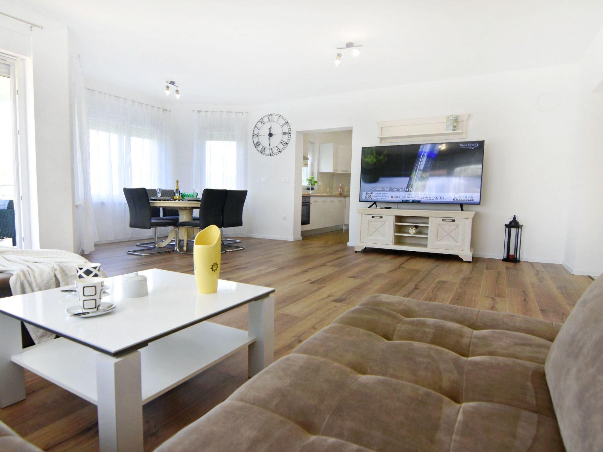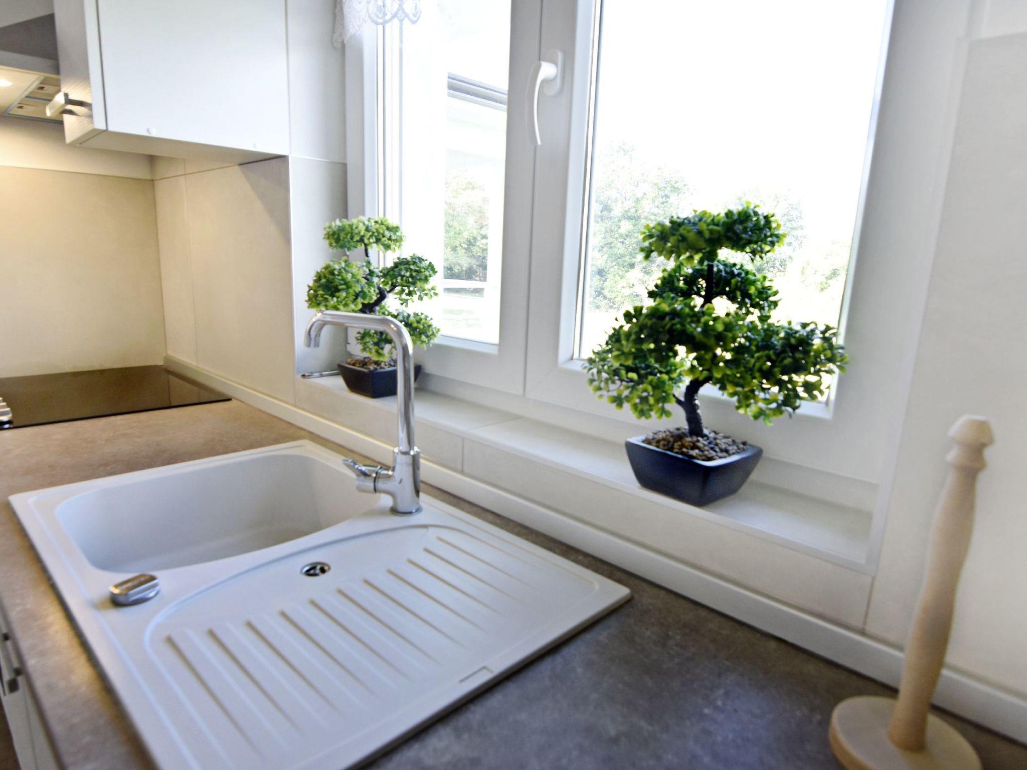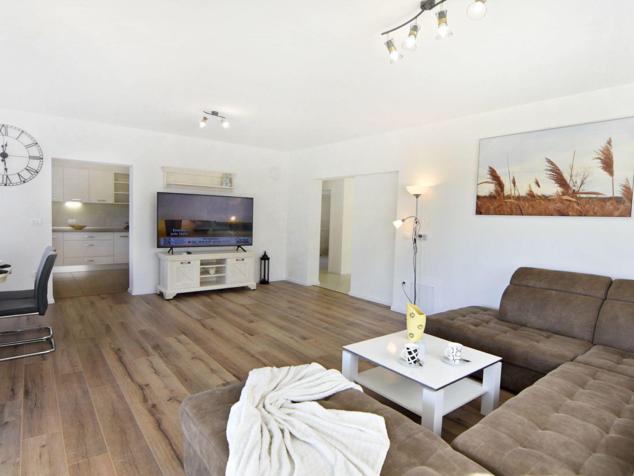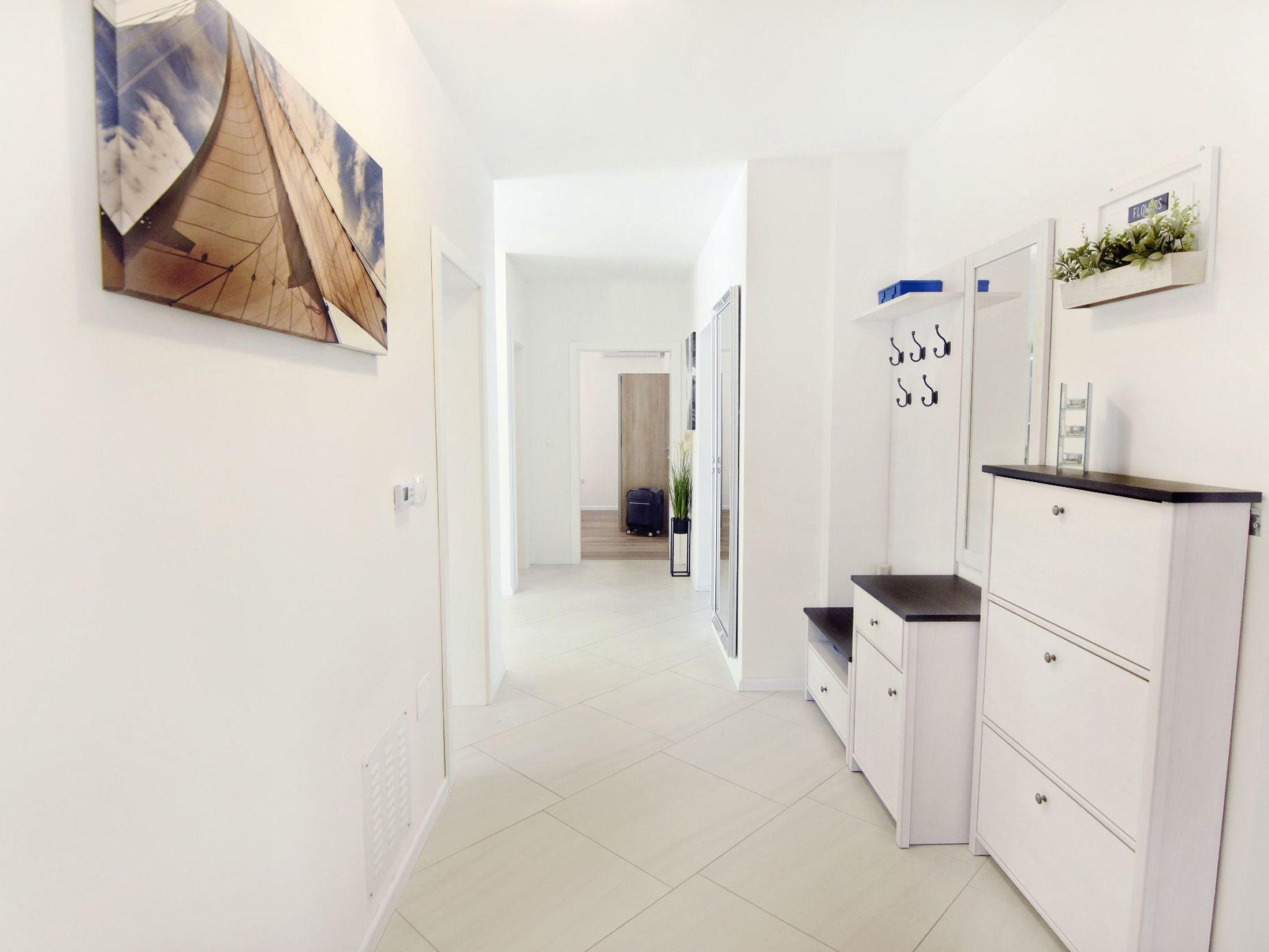 The interior of the house invites you to linger. The entrance corridor leads to the individually air-conditioned bedrooms - two with double beds and one with two single beds, all equipped with wardrobes, bedside tables and lamps. There are two bathrooms, one with a bathtub, the other with a shower, both offering comfort and privacy. The large living room, furnished with a comfortable sofa bed for two people, flat-screen satellite TV, Wi-Fi and board games, leads into the dining area and the modern kitchen, which is equipped with everything you need to prepare delicious meals.