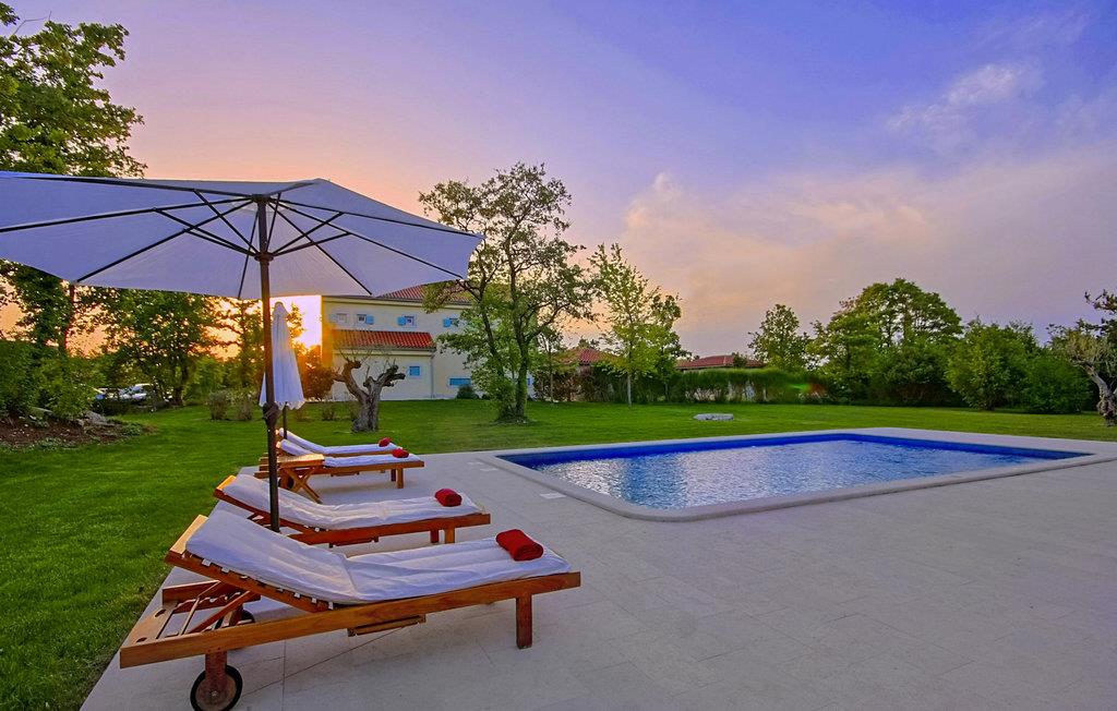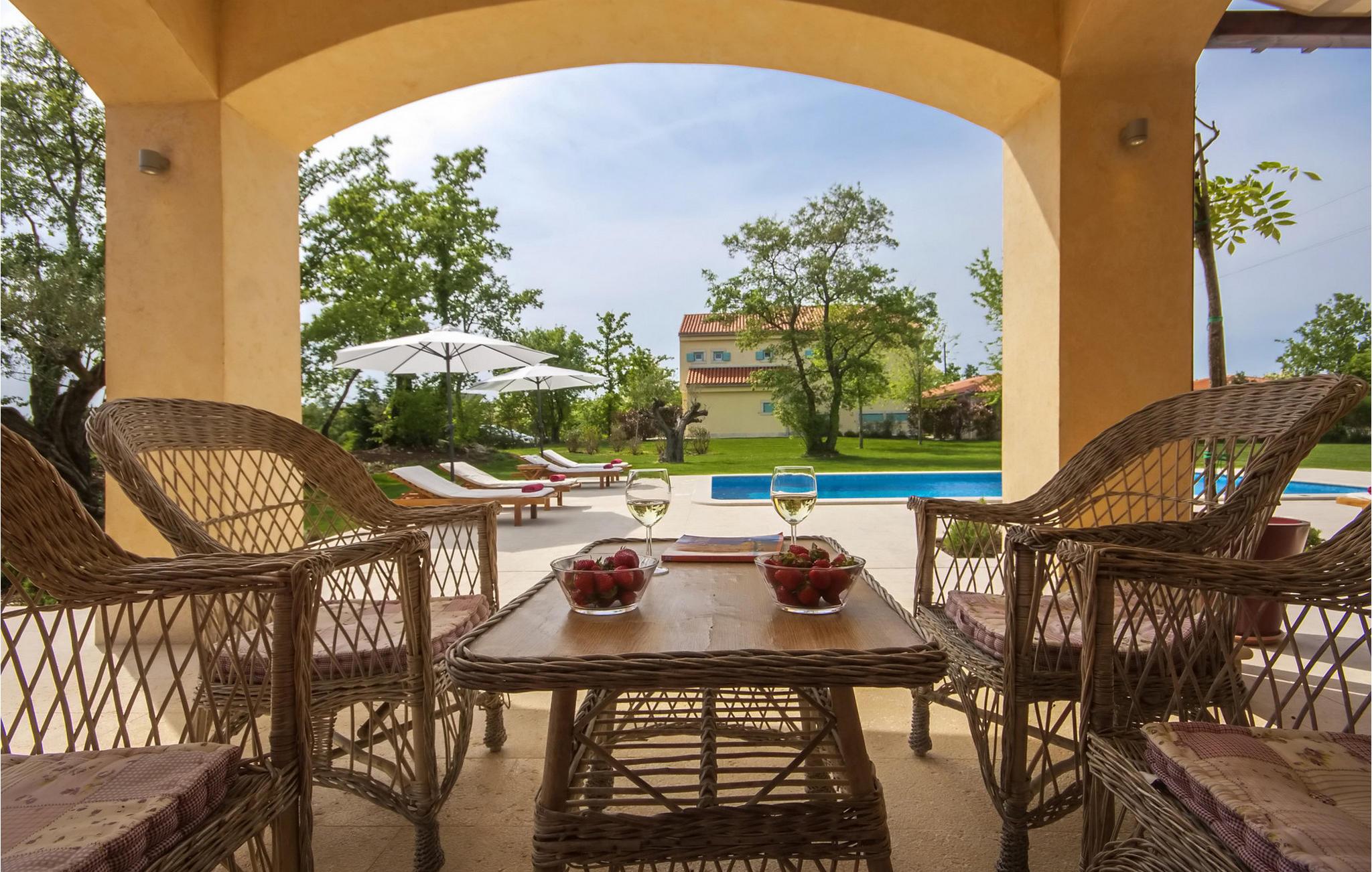 Den smukke Villa Mirna ligger helt i den sydlige del af Istrien i byen Svetvincenat, som forbløffer med sit rige turist- og gastronomiske tilbud samt talrige kulturelle og historiske seværdigheder og steder. Omgivet af enge og duftende middelhavsvegetation, er Villa Mirna det perfekte valg for dem, der leder efter en virkelig afslappende ferie. Med et boligareal på 318 m2 består Villa Mirna af 4 soveværelser, hvoraf to er på første sal og hver har sin egen terrasse med bord og to stole. Det tredje soveværelse på første sal har franske vinduer, det sidste værelse er i stueetagen af villaen. Dette har direkte adgang til poolen. Tre soveværelser er indrettet med dobbeltsenge, det ene har to enkeltsenge, der kan skubbes sammen, hvis det ønskes, og et galleri med en dobbeltseng. Hvert soveværelse har eget badeværelse med gulvvarme og radiator. Der er også et ekstra badeværelse i annekset nær saunaen og poolen. Gæsterne på Villa Mirna har også til deres rådighed et separat toilet, et fuldt udstyret køkken med spiseplads og en stue med tv, PlayStation-konsol og pejs. Villa Mirna ligger på en 25000 m2 stor grund sammen med 3 andre villaer. Alle villaer deler 2 tennisbaner, halv basketballbane (1 bøjle), 2 legepladser og bowlingområde. Gæsterne på Villa Mirna er garanteret fuldstændigt privatliv takket være de hække og træer, der omgiver hver villa. Den 3000 m² store have har en swimmingpool (50 m²) med mulighed for opvarmning og massage, omgivet af liggestole. Der er også en spiseplads med grill, hvor du kan tilberede friske måltider til din familie og venner hver dag. Villa Mirnas rige underholdningstilbud omfatter 5 cykler, bordtennis, bordfodbold, billard og dart i villaens kælder, samt en vinkælder med et udvalg af kvalitetsvine fra Istrien. Gæsterne har også til rådighed et stereoanlæg med eksterne højttalere, som er placeret i anlægget ved siden af grillen. Villa Mirna har 3 private parkeringspladser og der er mulighed for at parkere yderligere to køretøjer. Der opkræves et gebyr på 10 € i timen for at bruge tennisbanen om natten, der skal betales lokalt. Daglig brug er gratis. Poolen er lukket fra november til april. Kæledyr er tilladt på denne ejendom efter ejerens skøn eller mod et gebyr.