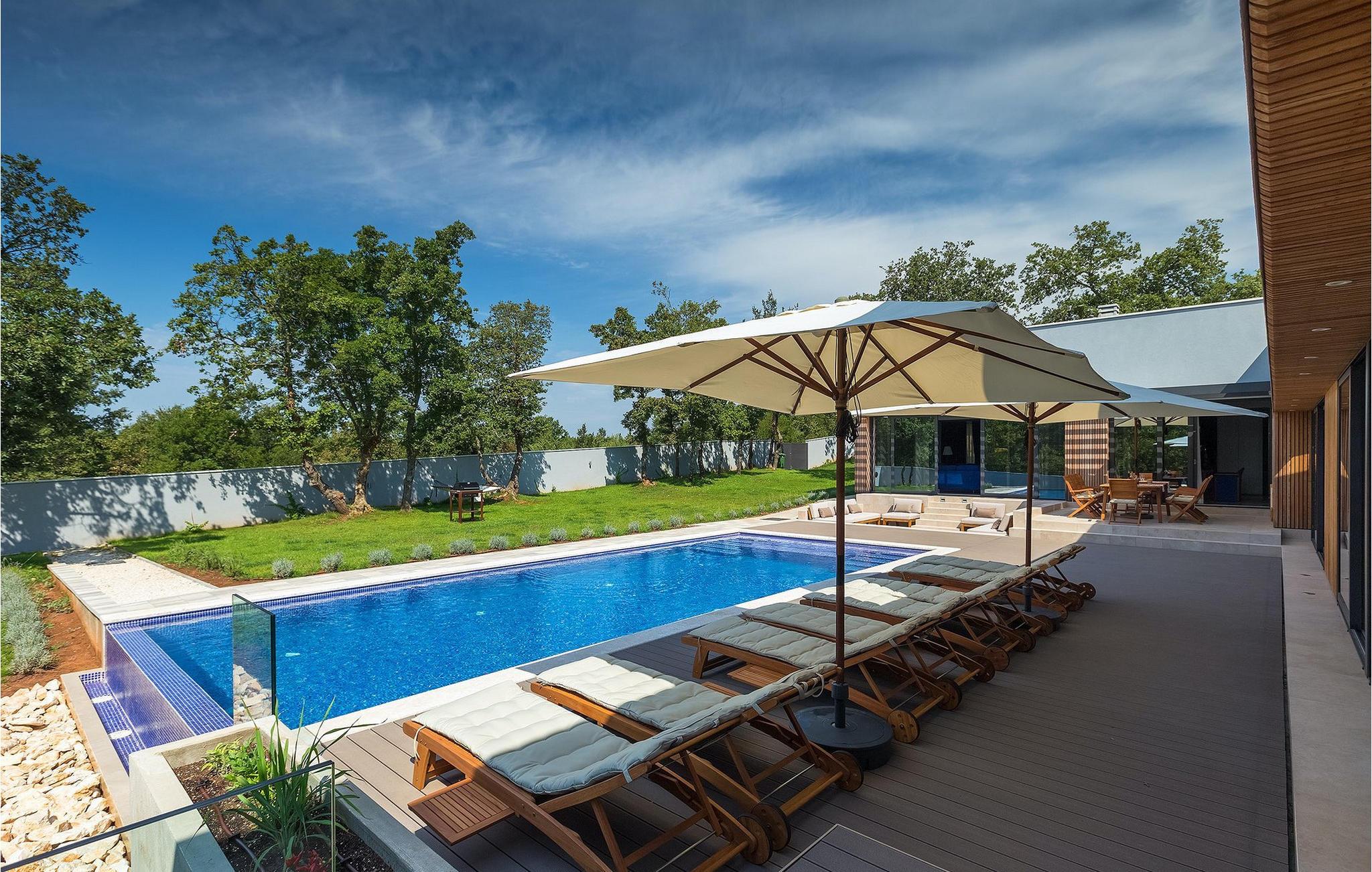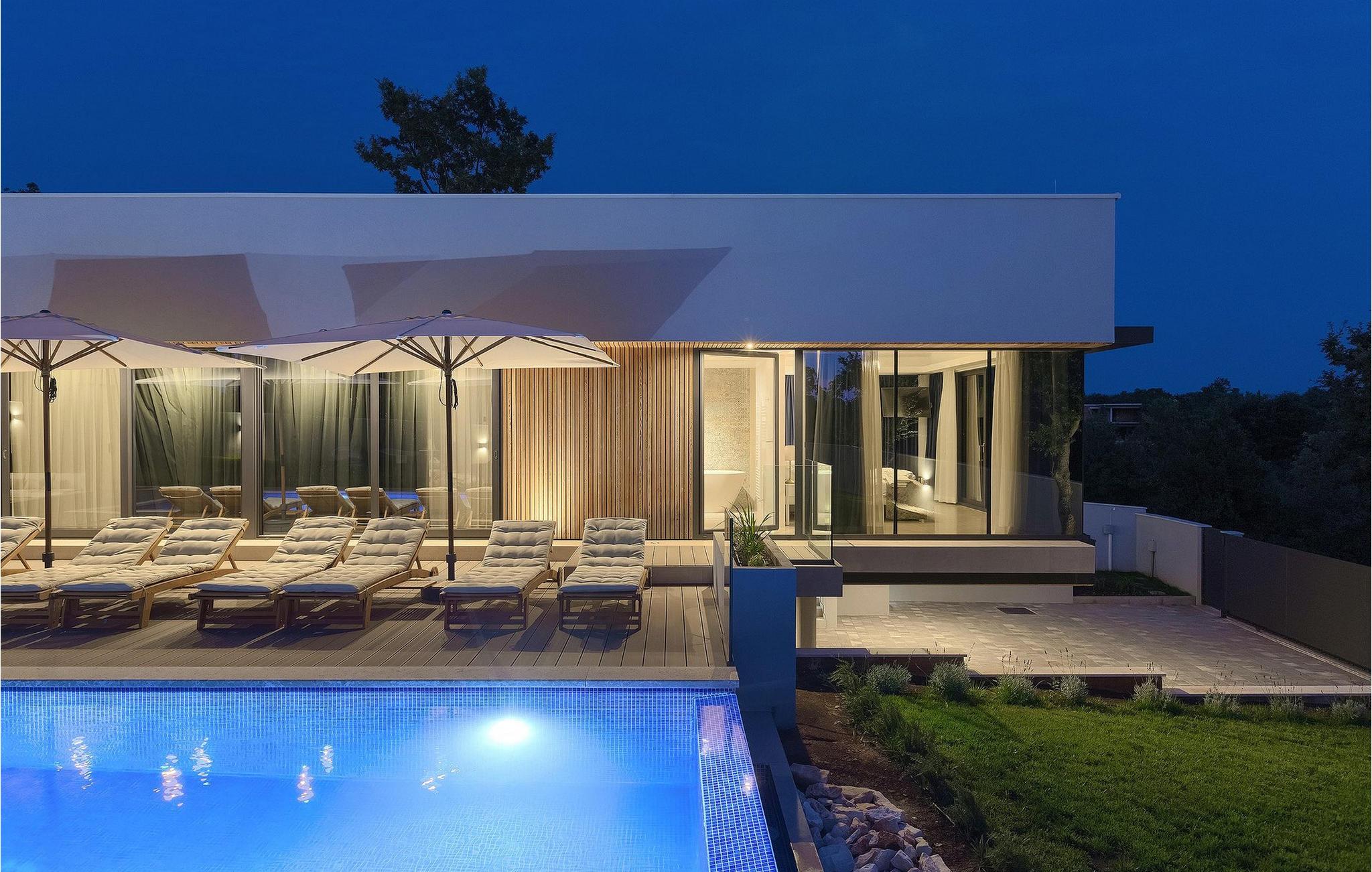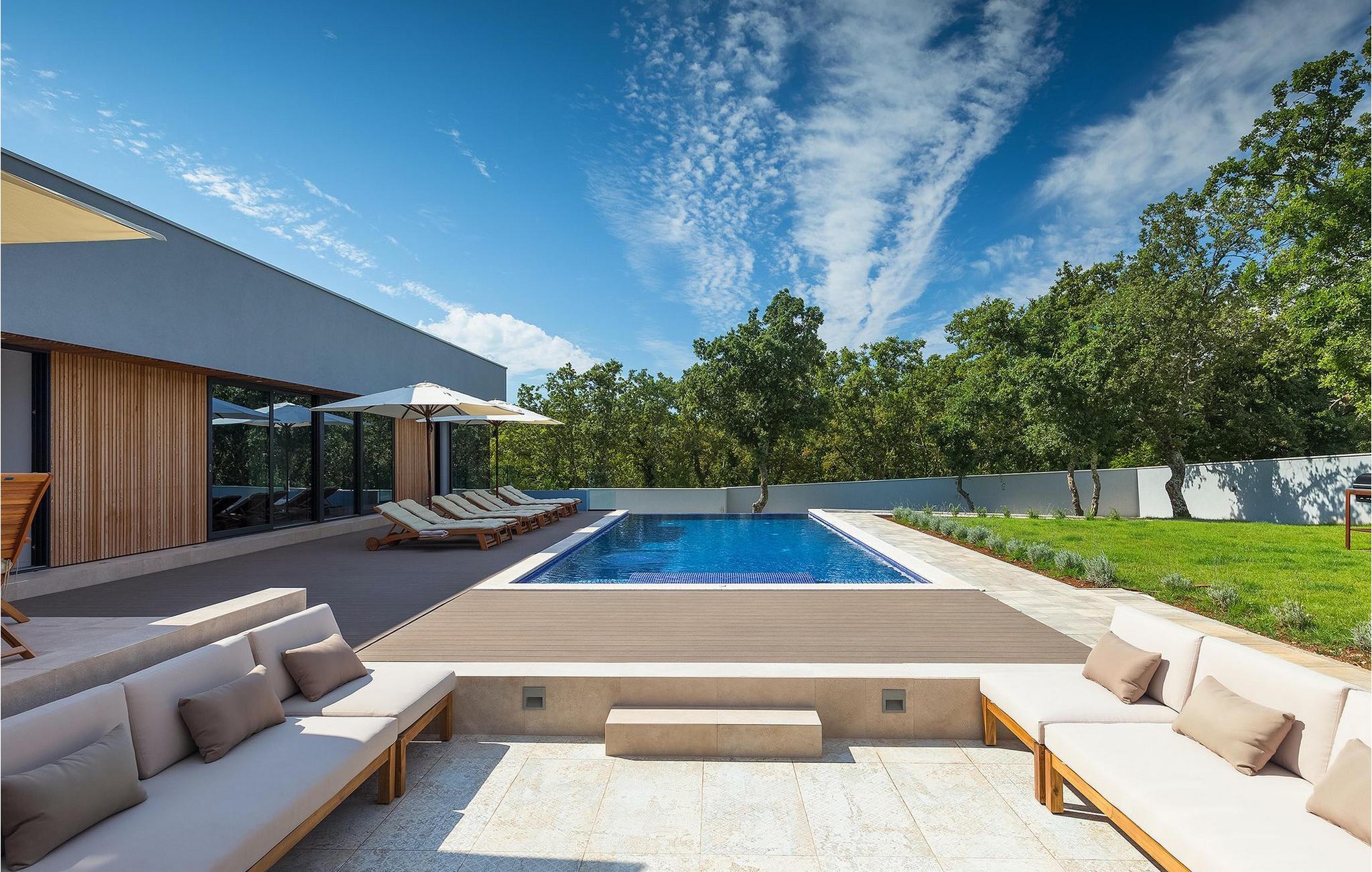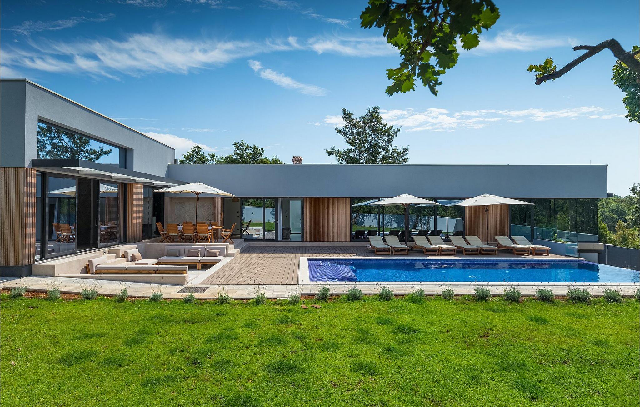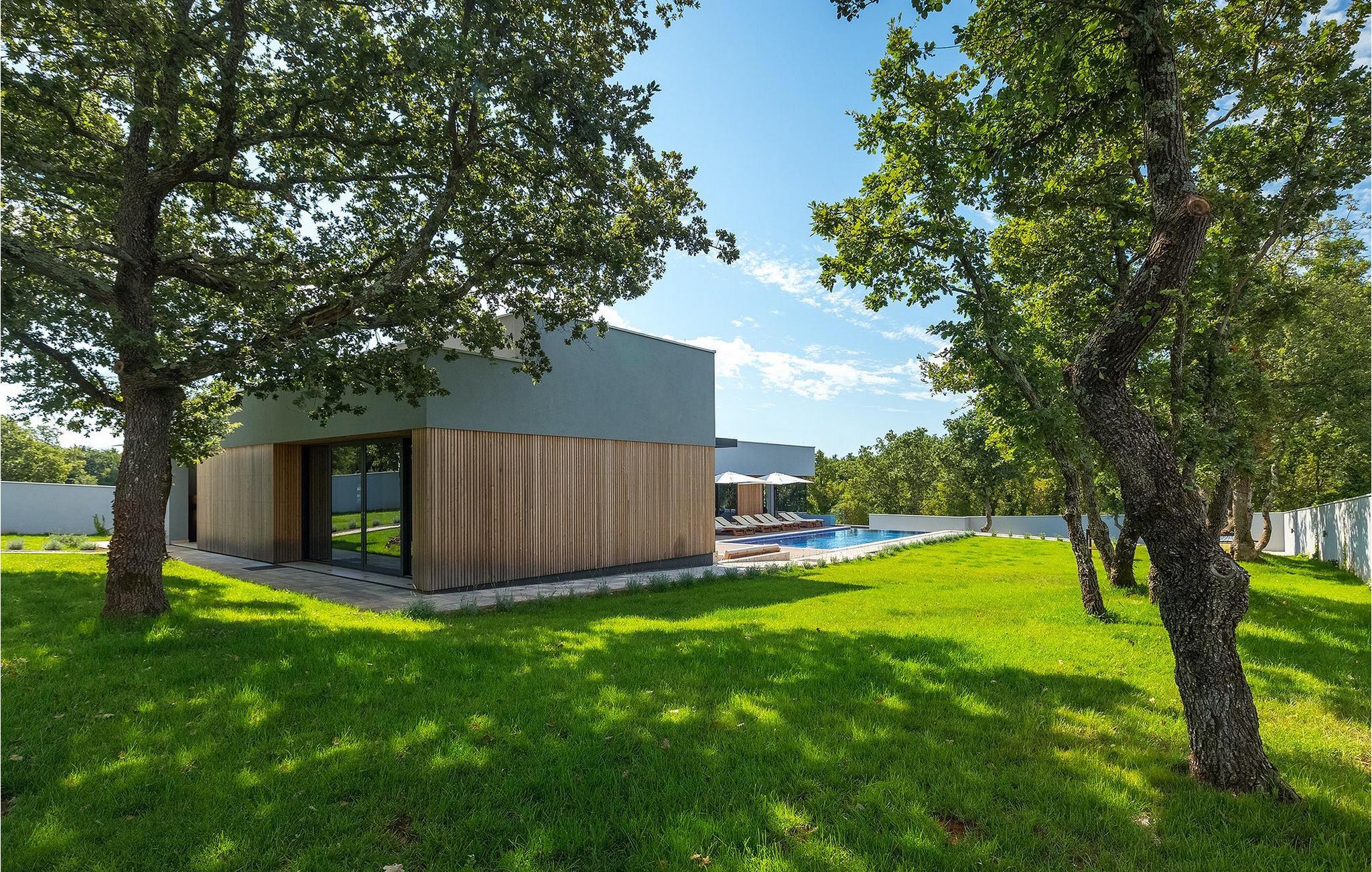 Den fascinerende Villa Agnes ligger i det rolige Istriens landskab i en lille landsby ved navn Butkovici. Dette smukke stykke moderne arkitektonisk design er omgivet af en skov og byder på en 60 kvadratmeter privat pool samt en 2500 kvadratmeter grøn have med grill og et hængenet.