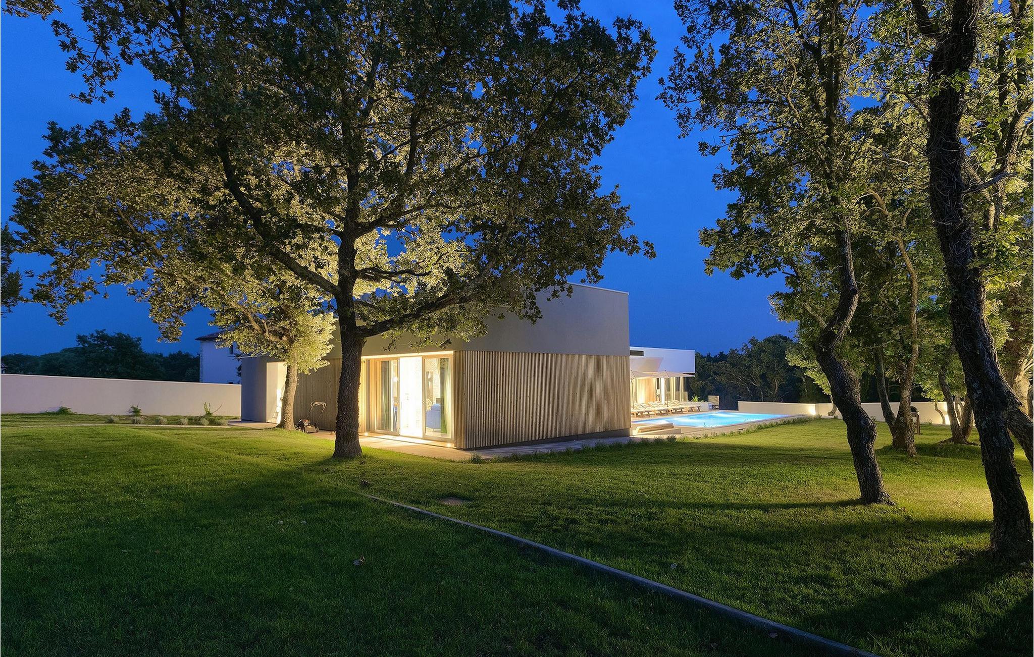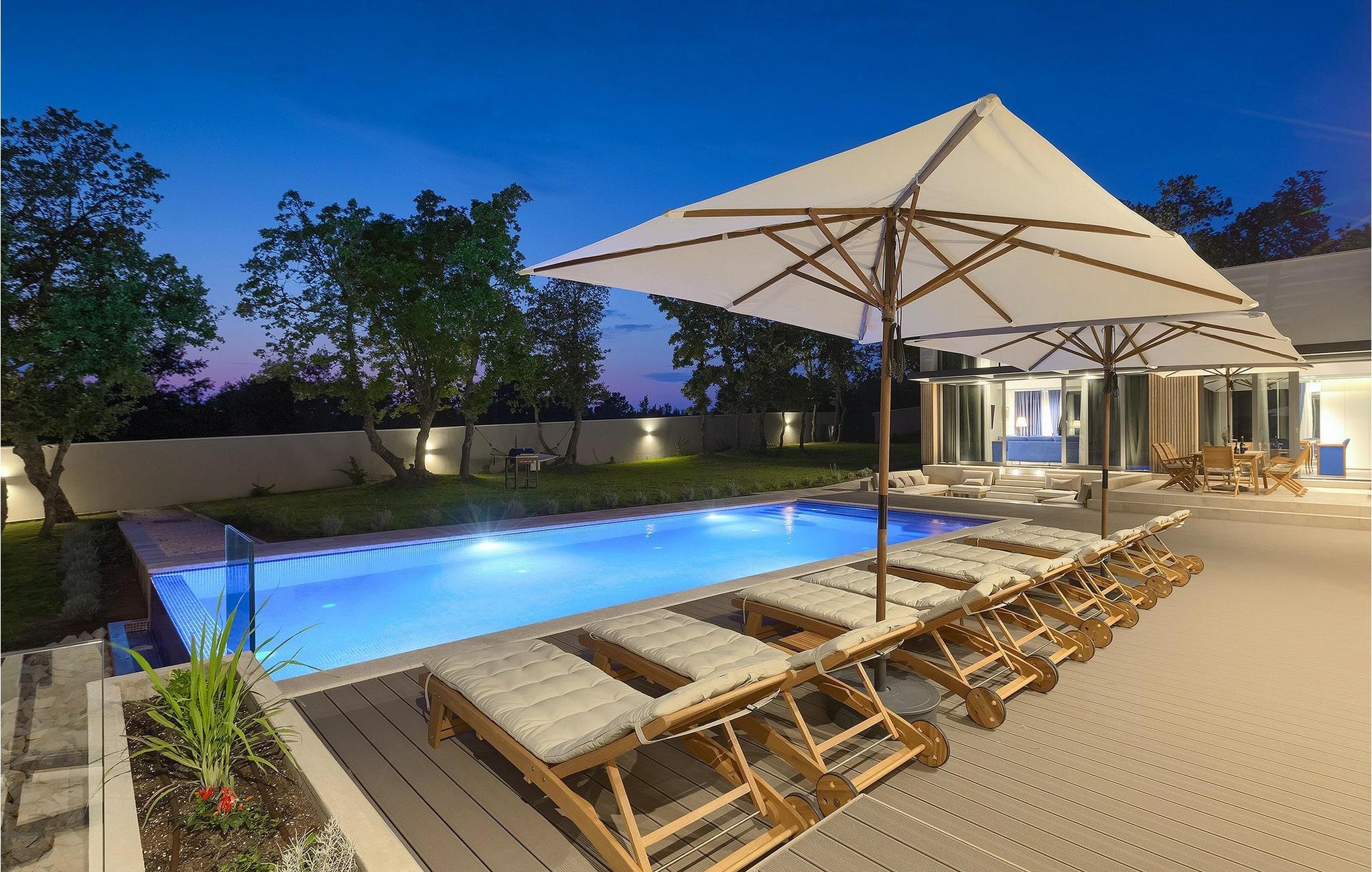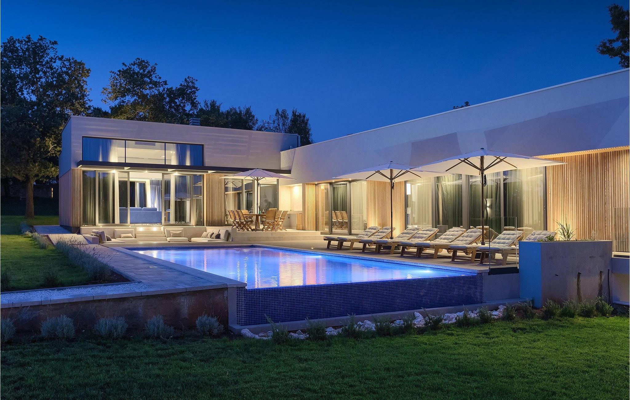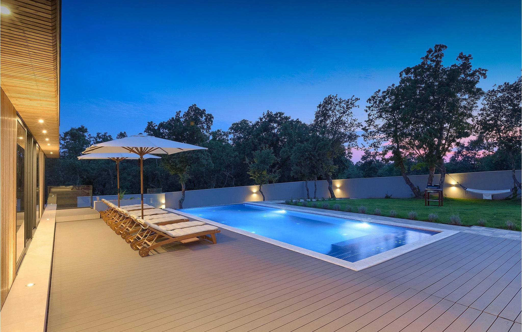 Den fascinerende Villa Agnes ligger i det rolige Istriens landskab i en lille landsby ved navn Butkovici. Dette smukke stykke moderne arkitektonisk design er omgivet af en skov og byder på en 60 kvadratmeter privat pool samt en 2500 kvadratmeter grøn have med grill og et hængenet.