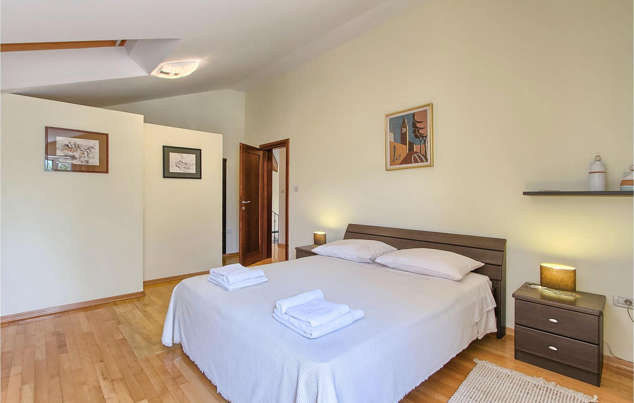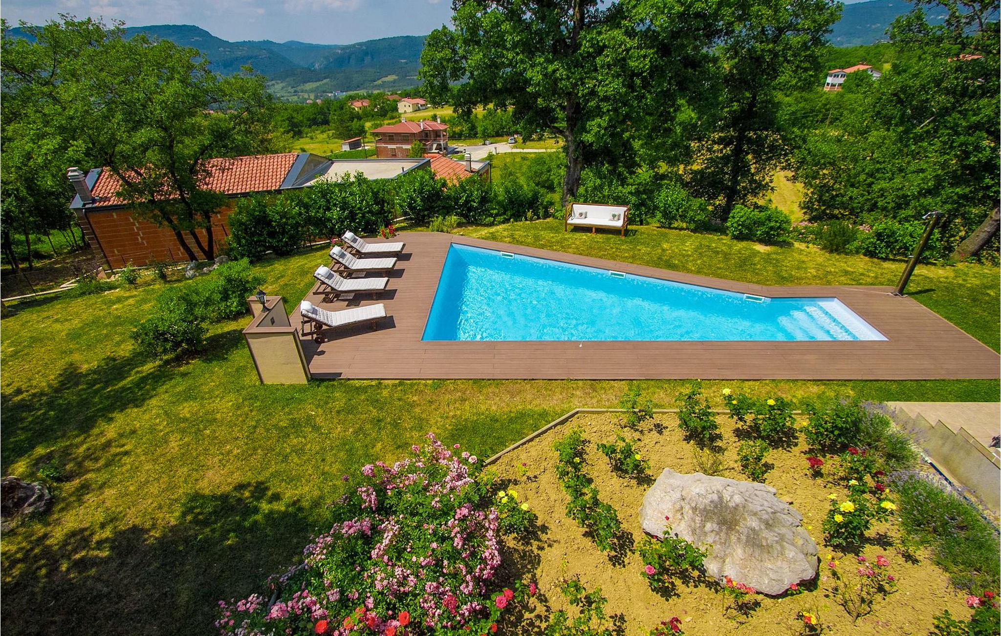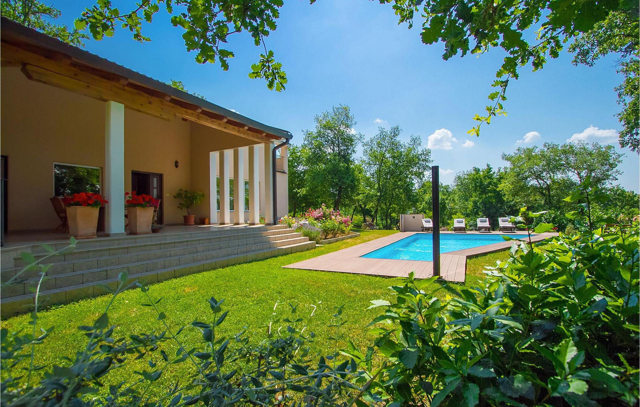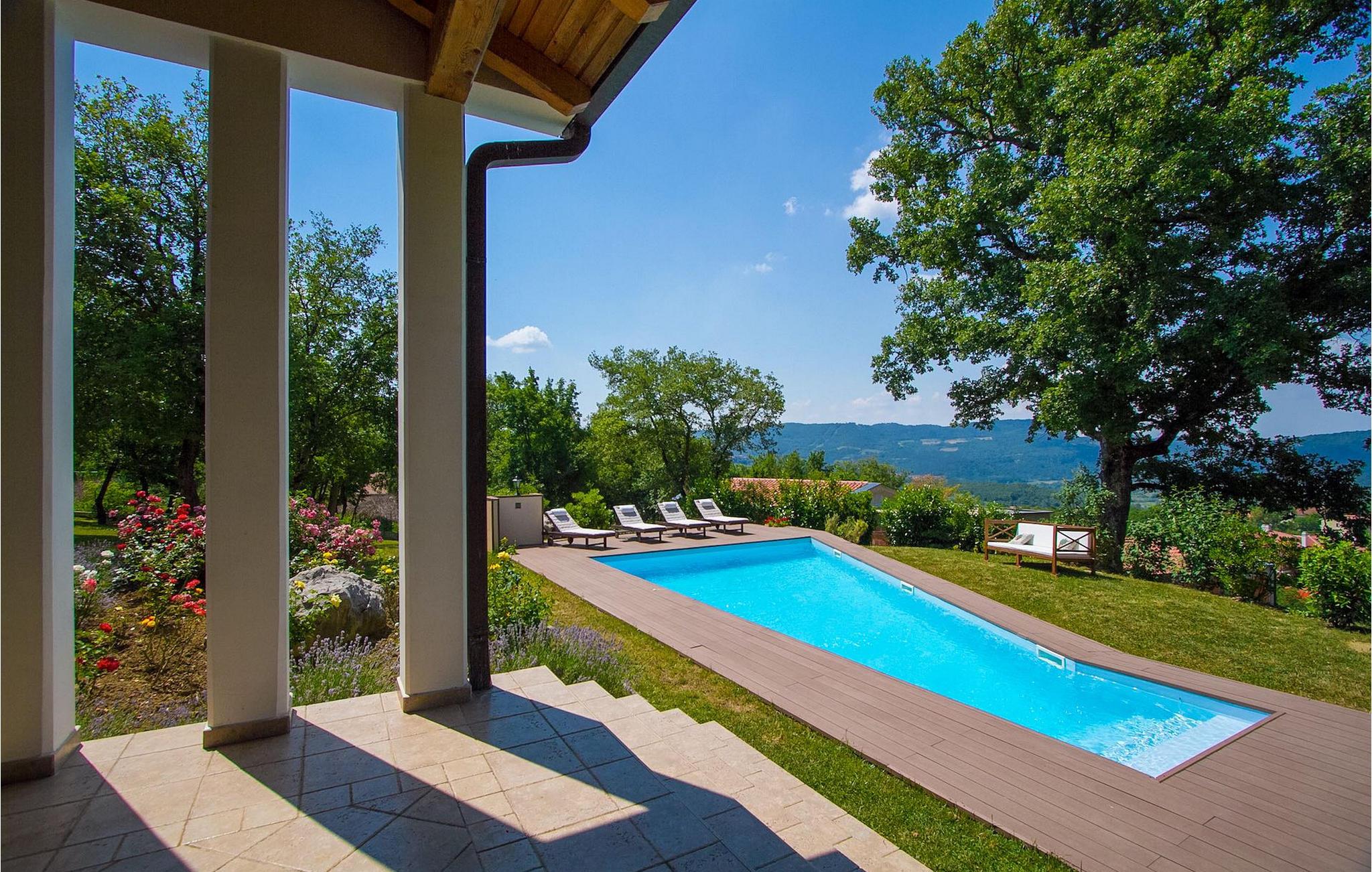 Dette er en ejendom ideel til familieferier, der giver privatliv og sikrer afslapning. Villa Vesna er en smuk moderne ejendom, der tilbyder indkvartering for op til 8 gæster. Villaen har i alt 4 soveværelser, 3 med dobbeltsenge og et med 2 enkeltsenge. I stueetagen er der en rummelig stue/spisestue/køkken med direkte adgang til den private swimmingpool i haven, hvor du også finder et loungeområde. Den store swimmingpool er 40m2 stor og dens moderne form giver en længde på over 10 meter, mens den smukke middelhavshave byder på privatliv og fred. Der er en garage til 2 køretøjer og en typisk istrisk konoba - et sted, hvor du sandsynligvis vil tilbringe det meste af din tid, mens du bor på Villa Vesna. Dette er et rummeligt værelse med åben pejs og et stort bord, hvor hele selskabet kan samles og hygge sig. Villa Vesna ligger i en lille og rolig landsby kaldet Majcani lige uden for Buzet. I dag er Buzet almindeligt kendt som 'trøflernes by', da skovene langs Mirna-floden er særligt rige på trøfler. Buzet, en by placeret på en bakke midt i Mirna-flodens frugtbare dal var beboet i forhistorien, den blev befæstet under det romerske styre. Den centrale plads med sognekirken Jomfru Marias himmelfart er selve kernen i den gamle bydel. Mens du er her, så sørg for ikke at gå glip af et besøg på County Museum of Buzet og dets omgivelser. I Buzets omgivelser er der nogle meget velbevarede middelalderbyer. Villa Vesna tilbyder privatlivets fred og fred i en lille landsby, og alligevel er alt kun et par minutters kørsel væk, markedet, restauranter og barer.