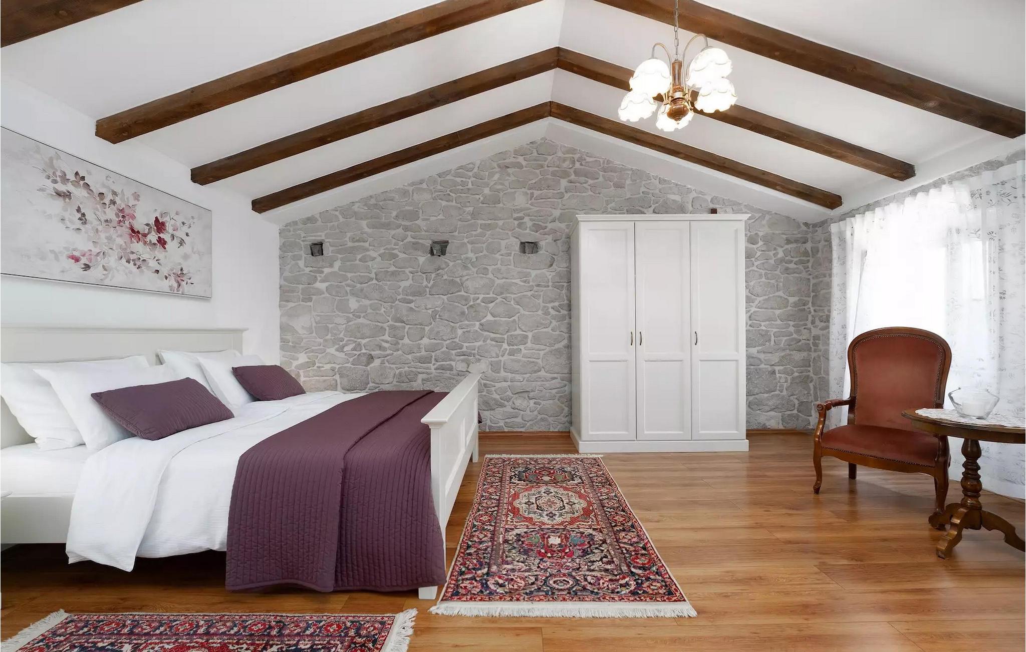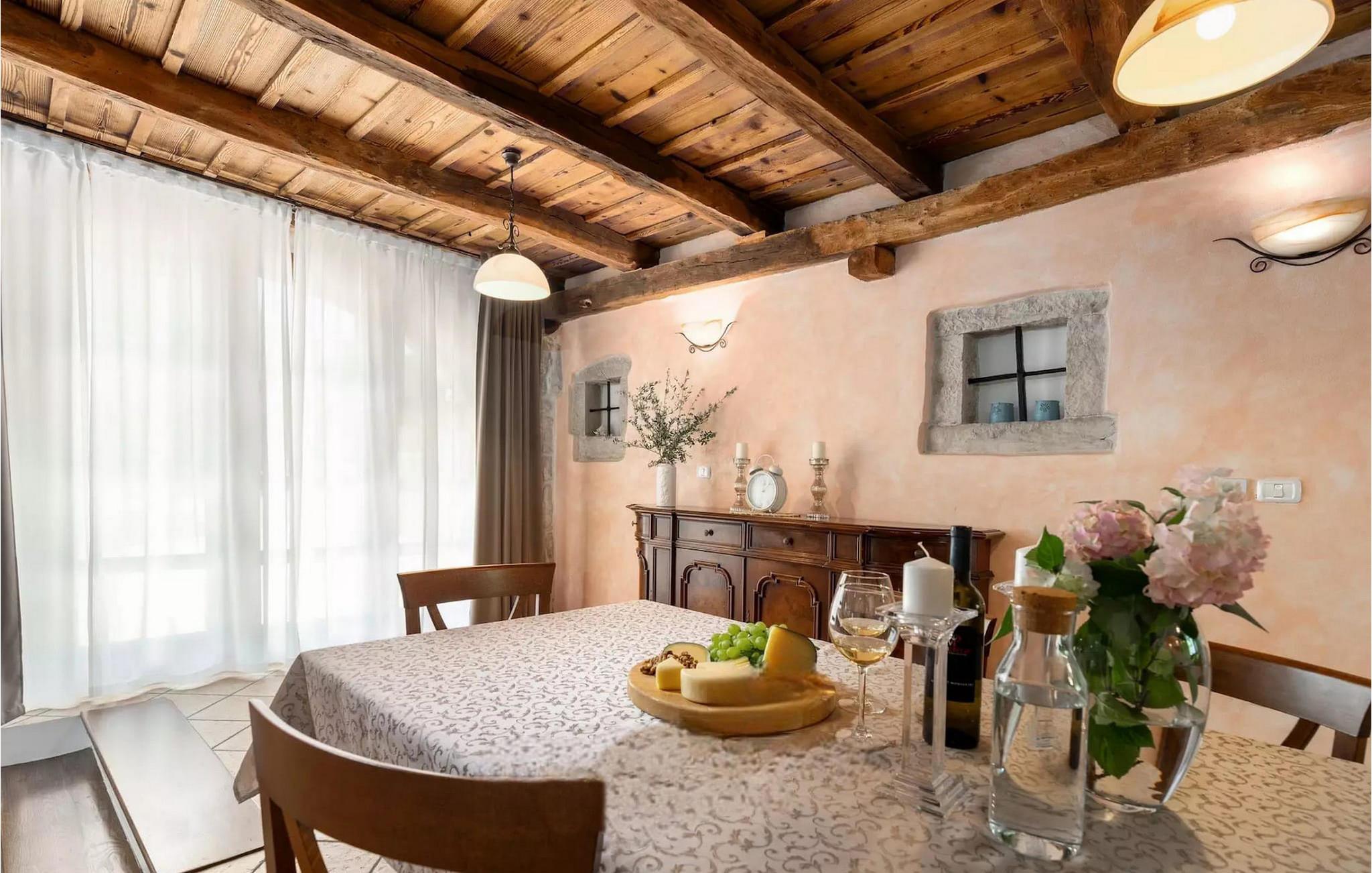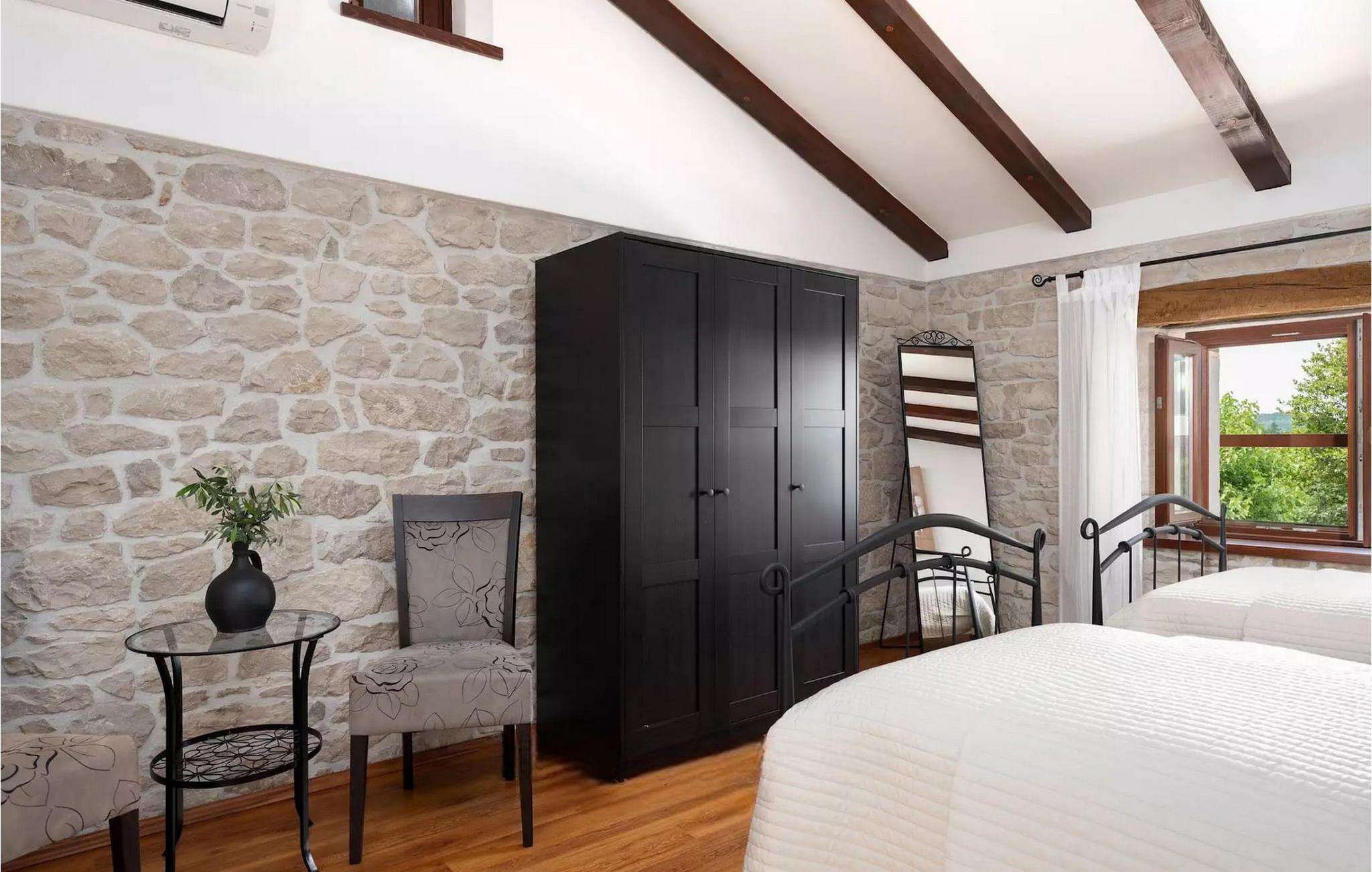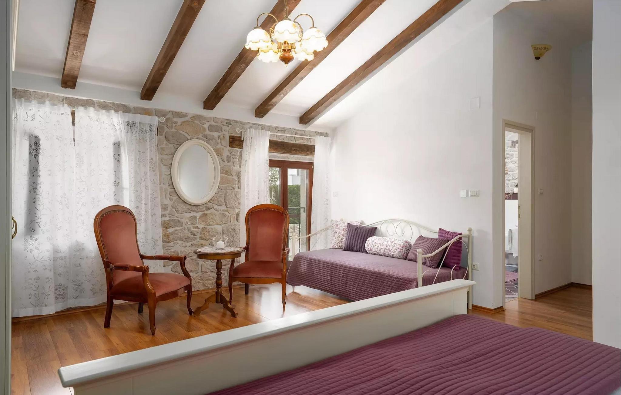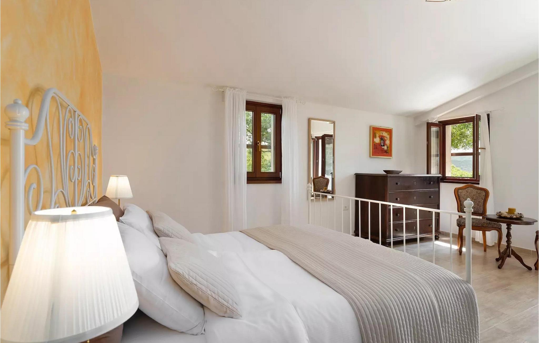 Omgivet af maleriske skove, ikke langt fra byen Buzet, ligger den charmerende Villa Garibaldi. Tiden ser ud til at stå stille her. Nostalgikere og elskere af svundne tider vil være glade her. Træets varme nuance i kontrast til den lyse sten og det hyggelige interiør, der til dels består af historiske møbler, skaber en smuk atmosfære, der inviterer til ophold. I alt tre komfortable soveværelser kan op til 8 personer finde afslapning. Det åbne opholds- og spiseområde overbeviser med sin enkle elegance. I det fuldt udstyrede køkken kan du tilberede lækre retter ligesom derhjemme. Spis i den rummelige spiseplads med direkte udgang til den overdækkede terrasse med opholdsstue. Villaens lille, men fine højdepunkt ligger på første sal. Drik din morgenkaffe på balkonen, som vil fortrylle dig med sin betagende udsigt over den omkringliggende natur. Udendørsområdet byder på et fuldt udstyret sommerkøkken med en kulgrill, hvor du kan tilbringe dejlige sommeraftener med din familie og venner, og byder på masser af plads til rekreation. Forfrisk dig selv i den private pool og nyd den store have. Villaen er beliggende lige uden for den antikke by Buzet. Buzet ligger i den nordlige del af Istrien nær grænsen til Slovenien. Dens historiske kerne, der stammer fra middelalderen, ligger på en bakketop over en frugtbar dal af den længste flod i Istrien - Mirna. I dag er Buzet almindeligt kendt som 'trøflernes by', da skovene langs Mirna-floden er særligt rige på denne guddommelige knold. Ifølge nogle synspunkter er den hvide trøffel i Istrien lige så god som den mest berømte hvide trøffel fra den italienske region Alba. Til ære for denne trøffel arrangeres hvert år Trøffeldage i september og oktober. Den anden weekend i september finder der også en stor folkefest i Buzet sted med en særlig attraktion – en kæmpe omelet (almindeligvis kendt som 'fritada' eller 'fritaja') med over 2.000 æg og 10 kg trøfler er tilberedt i en enorm pande. Denne begivenhed markerer officielt begyndelsen på Trøffeldage i Istrien. I Buzets omgivelser er der nogle meget velbevarede middelalderbyer. Villa Garibaldi er et perfekt tilflugtssted for dem, der ønsker at flygte fra hverdagens hektiske tempo. En bil anbefales.