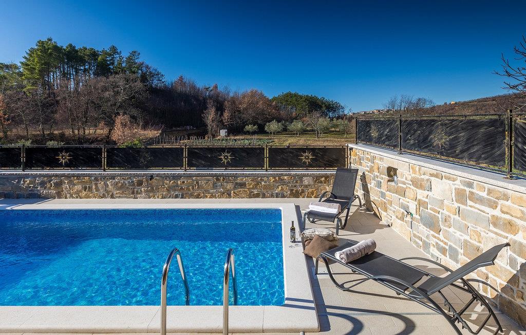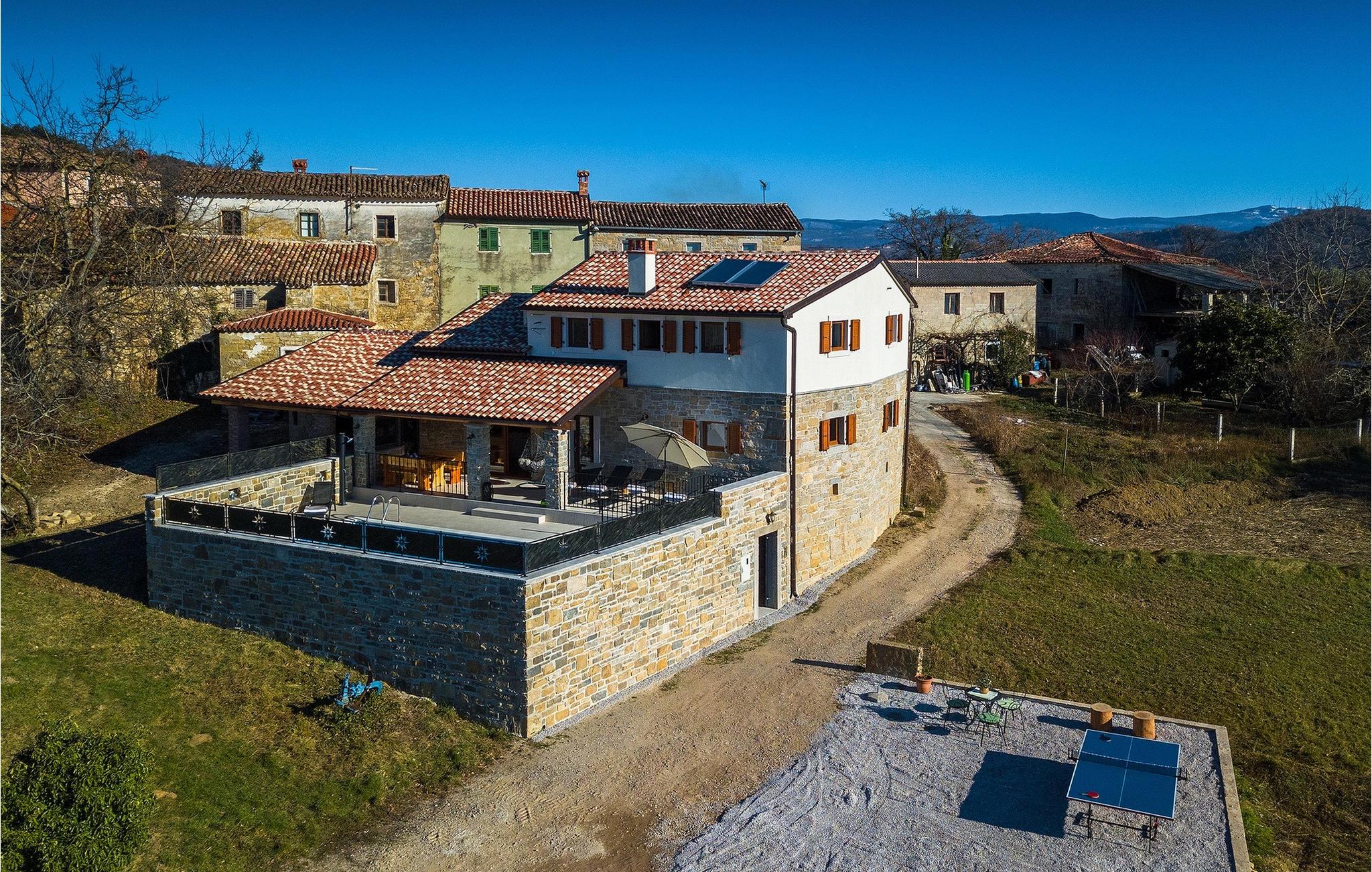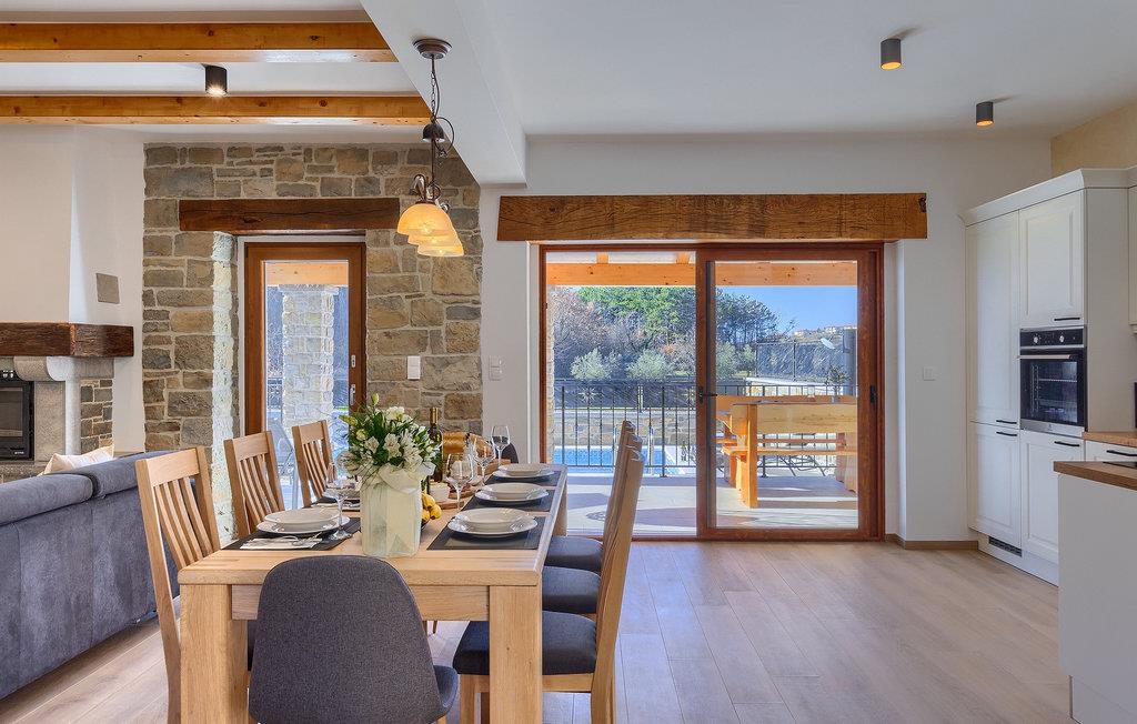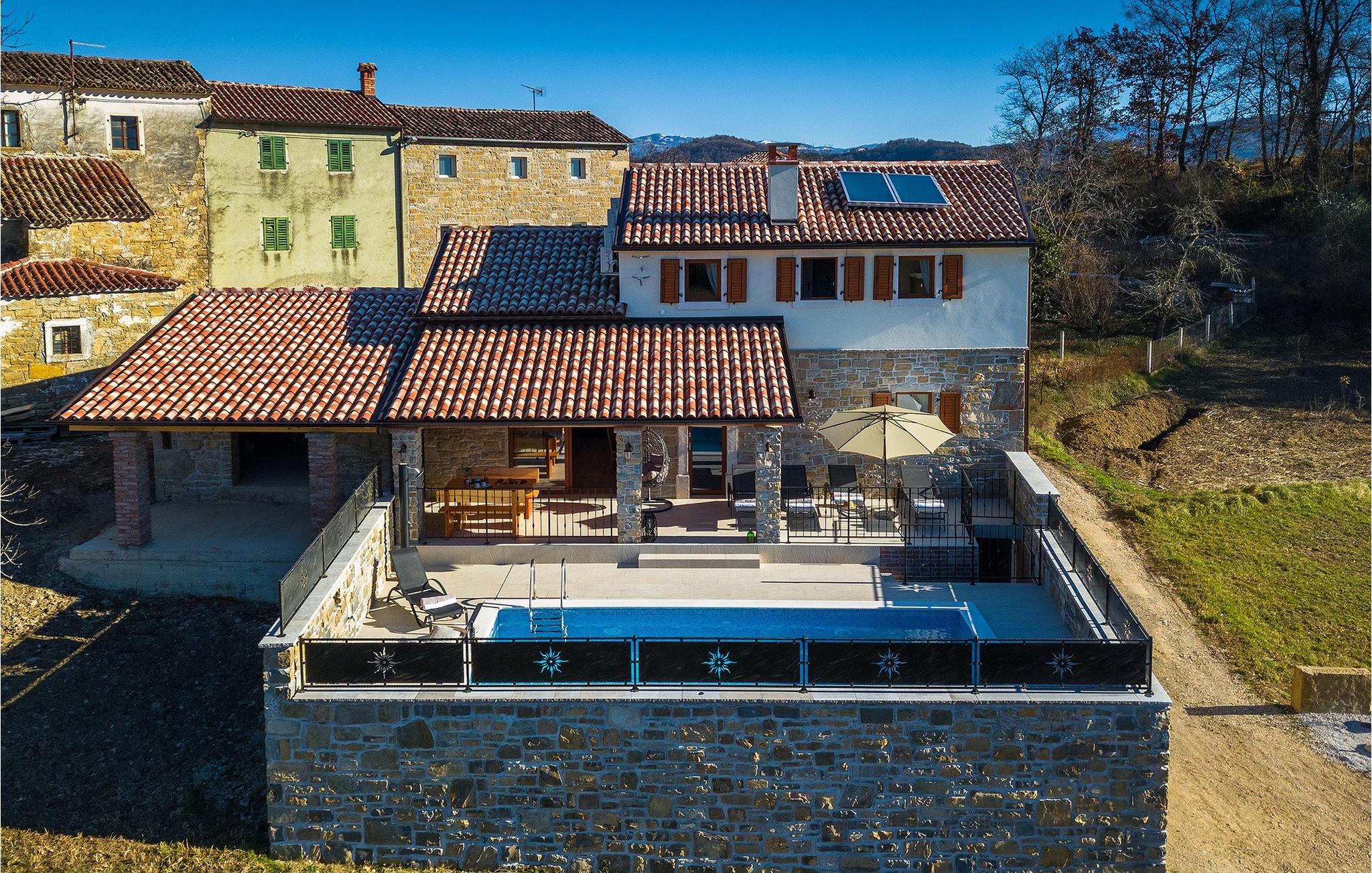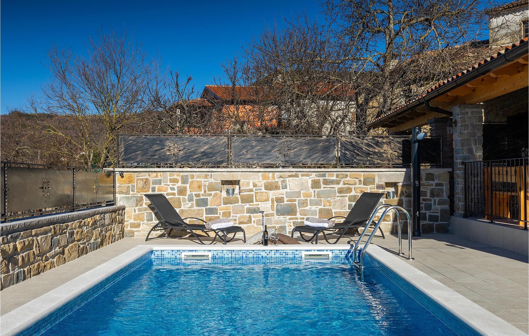 Villa Poji er en charmerende villa i den lille landsby Marceneško polje i Buzet kommune. Villaen er fuldstændig restaureret og vil få dig til at føle dig hjemme. Med i alt 215 kvadratmeter boligareal og 3 nænsomt indrettede soveværelser kan den rumme op til 6+2 personer. Stueetagen af villaen består af en meget lys og luftig stue og spisestue, et fuldt udstyret køkken og et soveværelse med eget badeværelse. Ovenpå finder du yderligere to soveværelser. Det store soveværelse med dobbeltseng har eget badeværelse med badekar, mens det andet soveværelse har to enkeltsenge og også har eget badeværelse med bruser. Fra opholdsrummet har I direkte adgang til den overdækkede udendørs spiseplads, hvor I kan nyde en hyggelig middag med familien og en storslået udsigt over omgivelserne. Kun få skridt væk ligger den indbydende private pool, det perfekte sted at forfriske dig selv eller slappe af på de komfortable liggestole. I slutningen af dagen skal du lade alle dine bekymringer ligge i spa-området og slappe af i jacuzzien og saunaen. Cykler er også til din rådighed for at udforske og opdage det bredere område. Hvis du leder efter en rolig og afslappende ferie, er Villa Poji det rigtige valg for dig. Gå ikke glip af denne mulighed og bestil Villa Poji lige nu! Familievillaen Poji ligger i en lille landsby i Buzet kommune i det centrale Istrien. Villaen er omgivet af olivenlunde og kun få naboer. Hvis du leder efter en afslappende og fredelig ferie, er denne villa det perfekte sted. Buzet er den første større by, hvor du kan købe dagligvarer. Hvis du leder efter restauranter, er der nogle af de bedste restauranter i Istrien i området, der serverer traditionelle retter som hjemmelavet pasta med trøfler, istrisk oksekød, alt sammen toppet med et glas af det bedste Malvasia. Det centrale Istrien er kendt for sine mange cykel- og vandrestier, hvor du kan nyde naturen og opdage små bakkebyer som Buzet, Motovun og Groznjan. For kulturelskere anbefaler vi et besøg i byen Pula med dets amfiteater og Porec med Eufrazier-basilikaen. Hvis du vil tilbringe din ferie på stranden, er Novigrad den første strand, men gå ikke glip af at opdage mange andre skjulte bugter og strande i Istrien.