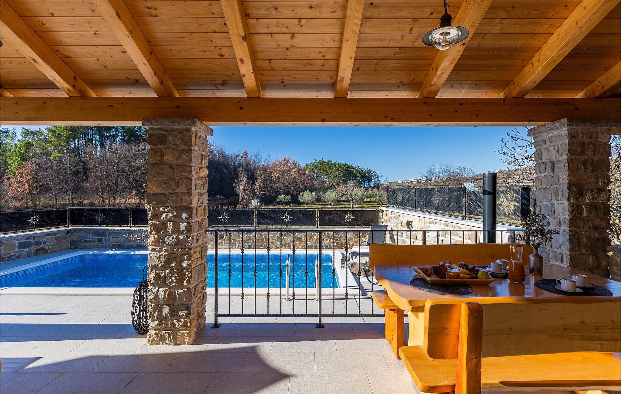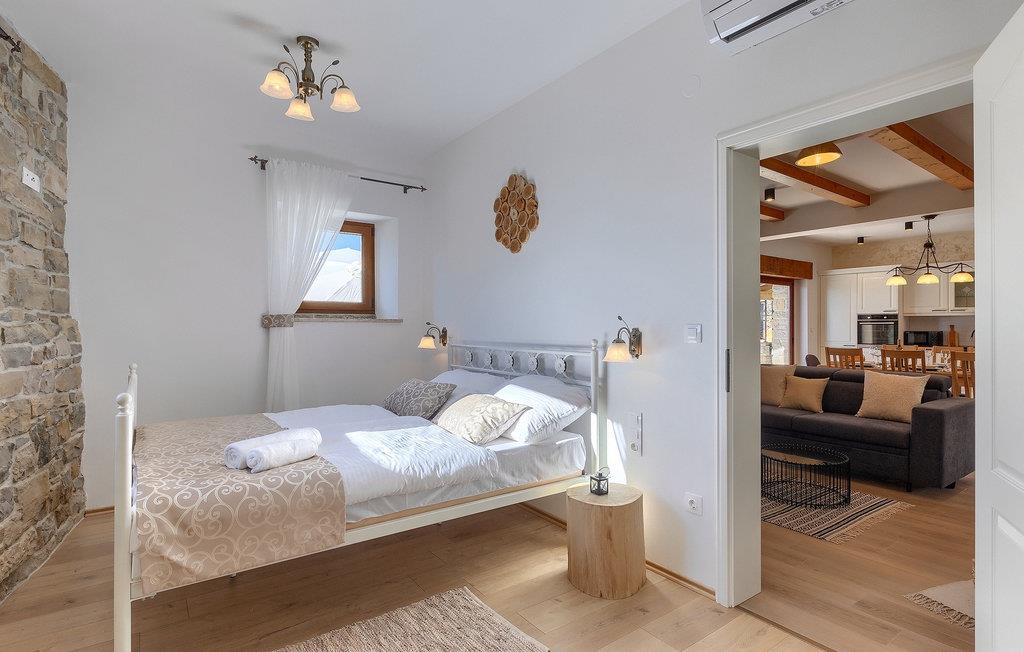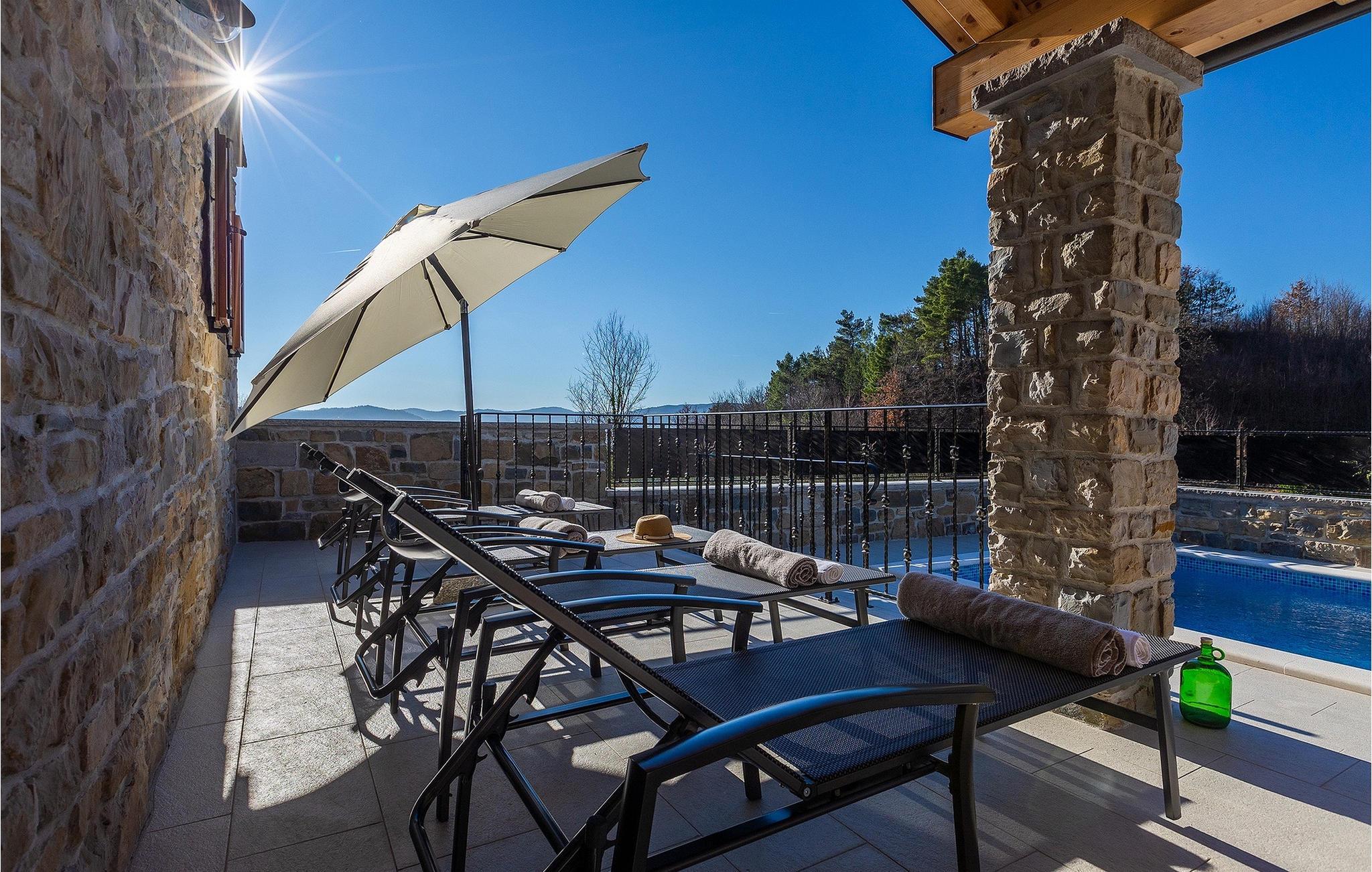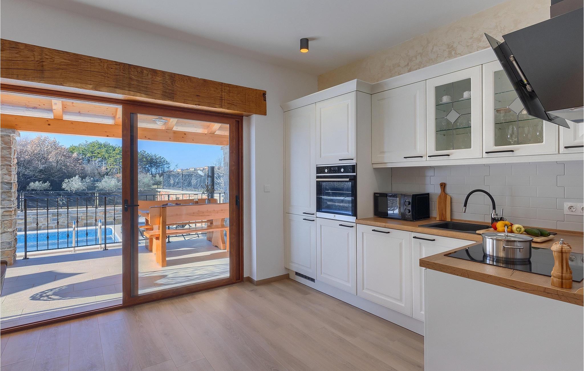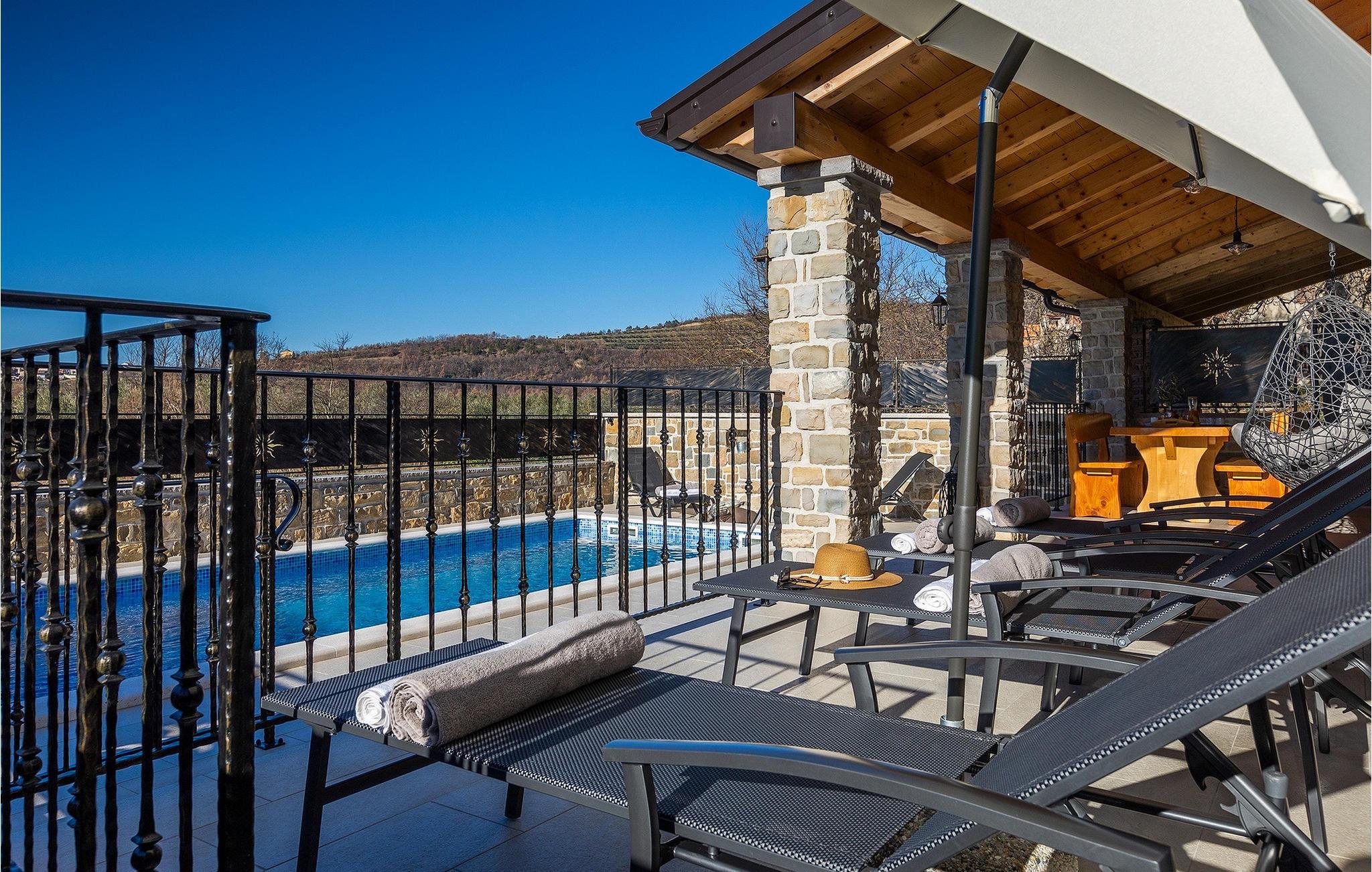 Villa Poji er en charmerende villa i den lille landsby Marceneško polje i Buzet kommune. Villaen er fuldstændig restaureret og vil få dig til at føle dig hjemme. Med i alt 215 kvadratmeter boligareal og 3 nænsomt indrettede soveværelser kan den rumme op til 6+2 personer. Stueetagen af villaen består af en meget lys og luftig stue og spisestue, et fuldt udstyret køkken og et soveværelse med eget badeværelse. Ovenpå finder du yderligere to soveværelser. Det store soveværelse med dobbeltseng har eget badeværelse med badekar, mens det andet soveværelse har to enkeltsenge og også har eget badeværelse med bruser. Fra opholdsrummet har I direkte adgang til den overdækkede udendørs spiseplads, hvor I kan nyde en hyggelig middag med familien og en storslået udsigt over omgivelserne. Kun få skridt væk ligger den indbydende private pool, det perfekte sted at forfriske dig selv eller slappe af på de komfortable liggestole. I slutningen af dagen skal du lade alle dine bekymringer ligge i spa-området og slappe af i jacuzzien og saunaen. Cykler er også til din rådighed for at udforske og opdage det bredere område. Hvis du leder efter en rolig og afslappende ferie, er Villa Poji det rigtige valg for dig. Gå ikke glip af denne mulighed og bestil Villa Poji lige nu! Familievillaen Poji ligger i en lille landsby i Buzet kommune i det centrale Istrien. Villaen er omgivet af olivenlunde og kun få naboer. Hvis du leder efter en afslappende og fredelig ferie, er denne villa det perfekte sted. Buzet er den første større by, hvor du kan købe dagligvarer. Hvis du leder efter restauranter, er der nogle af de bedste restauranter i Istrien i området, der serverer traditionelle retter som hjemmelavet pasta med trøfler, istrisk oksekød, alt sammen toppet med et glas af det bedste Malvasia. Det centrale Istrien er kendt for sine mange cykel- og vandrestier, hvor du kan nyde naturen og opdage små bakkebyer som Buzet, Motovun og Groznjan. For kulturelskere anbefaler vi et besøg i byen Pula med dets amfiteater og Porec med Eufrazier-basilikaen. Hvis du vil tilbringe din ferie på stranden, er Novigrad den første strand, men gå ikke glip af at opdage mange andre skjulte bugter og strande i Istrien.