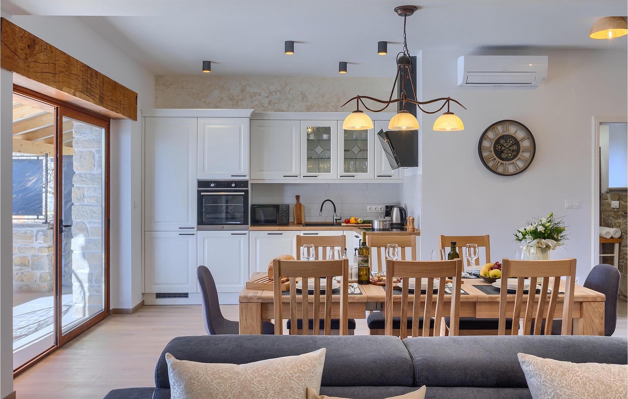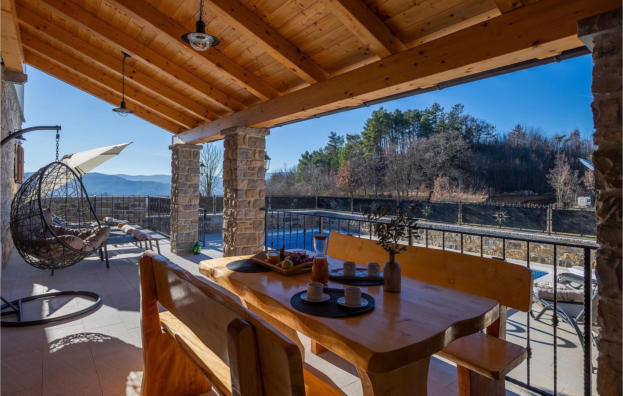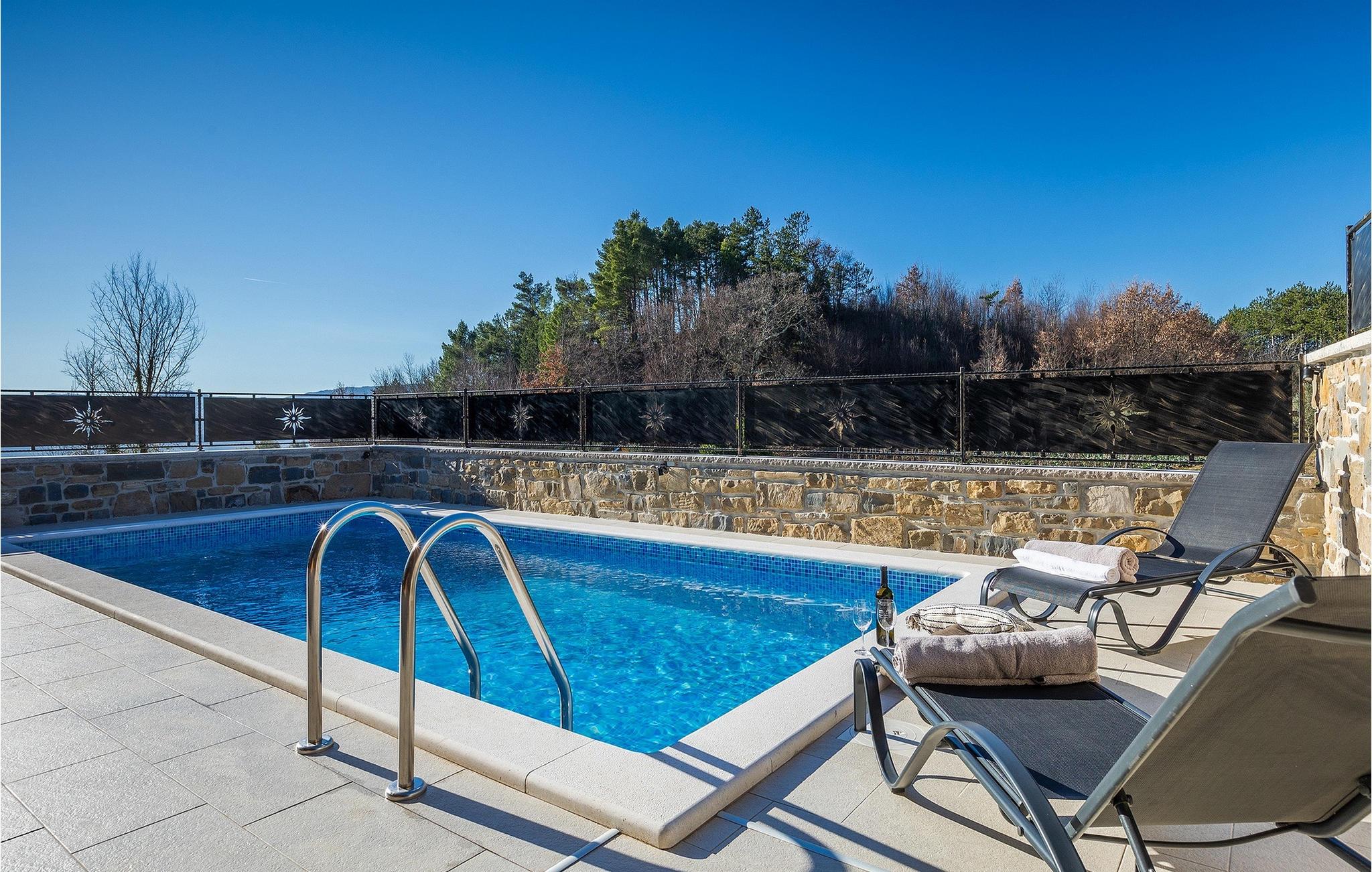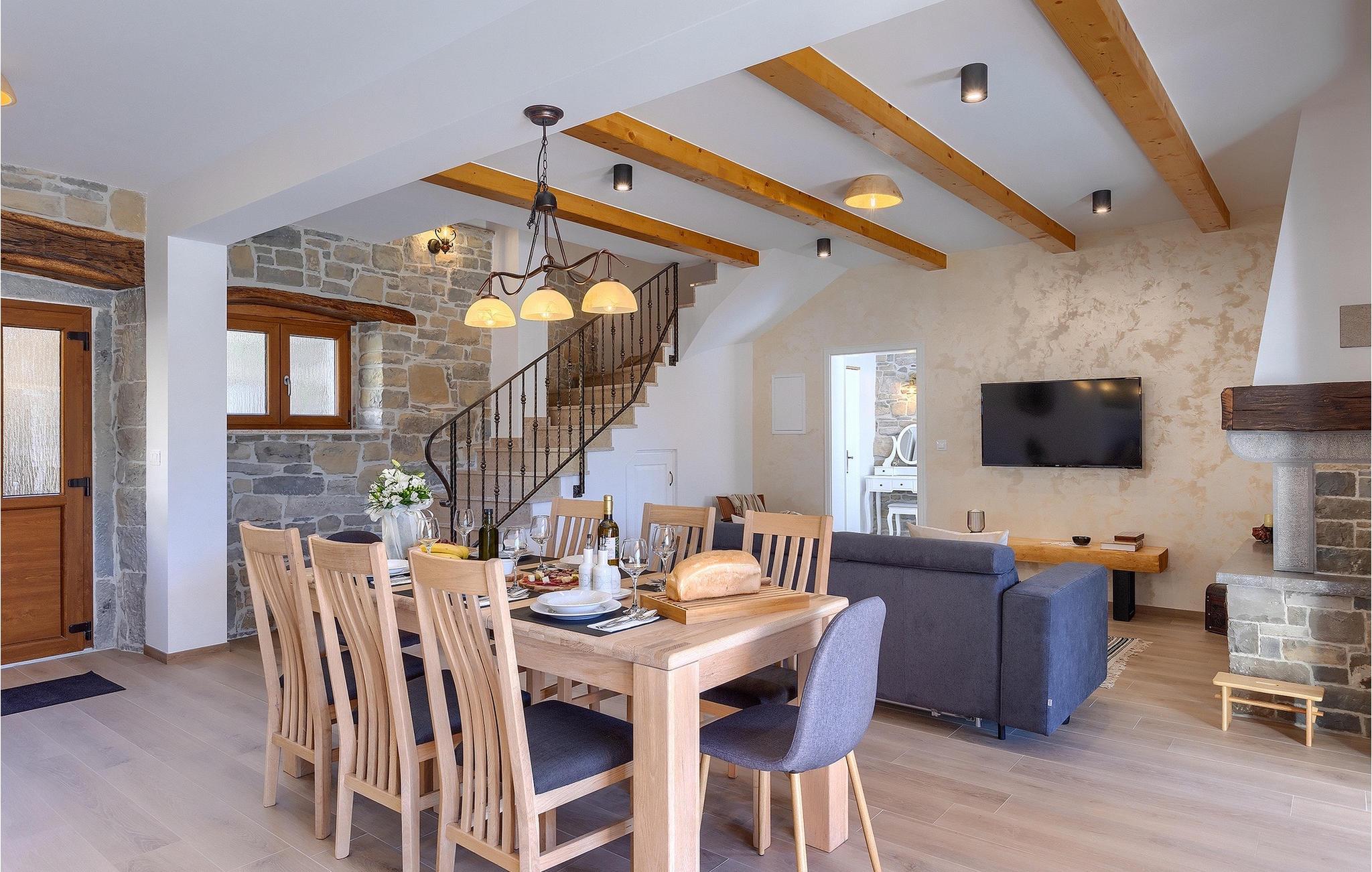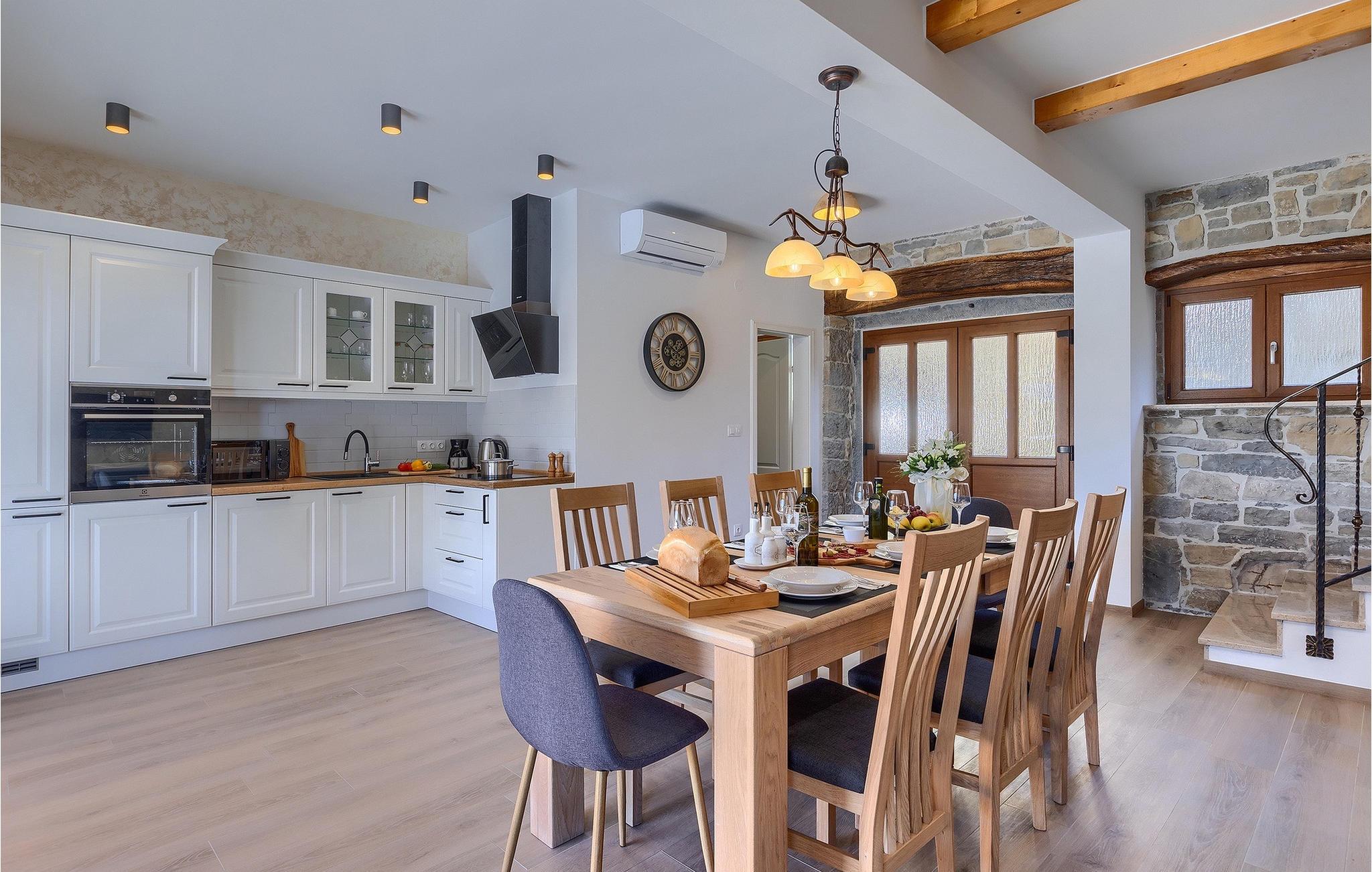 Villa Poji er en charmerende villa i den lille landsby Marceneško polje i Buzet kommune. Villaen er fuldstændig restaureret og vil få dig til at føle dig hjemme. Med i alt 215 kvadratmeter boligareal og 3 nænsomt indrettede soveværelser kan den rumme op til 6+2 personer. Stueetagen af villaen består af en meget lys og luftig stue og spisestue, et fuldt udstyret køkken og et soveværelse med eget badeværelse. Ovenpå finder du yderligere to soveværelser. Det store soveværelse med dobbeltseng har eget badeværelse med badekar, mens det andet soveværelse har to enkeltsenge og også har eget badeværelse med bruser. Fra opholdsrummet har I direkte adgang til den overdækkede udendørs spiseplads, hvor I kan nyde en hyggelig middag med familien og en storslået udsigt over omgivelserne. Kun få skridt væk ligger den indbydende private pool, det perfekte sted at forfriske dig selv eller slappe af på de komfortable liggestole. I slutningen af dagen skal du lade alle dine bekymringer ligge i spa-området og slappe af i jacuzzien og saunaen. Cykler er også til din rådighed for at udforske og opdage det bredere område. Hvis du leder efter en rolig og afslappende ferie, er Villa Poji det rigtige valg for dig. Gå ikke glip af denne mulighed og bestil Villa Poji lige nu! Familievillaen Poji ligger i en lille landsby i Buzet kommune i det centrale Istrien. Villaen er omgivet af olivenlunde og kun få naboer. Hvis du leder efter en afslappende og fredelig ferie, er denne villa det perfekte sted. Buzet er den første større by, hvor du kan købe dagligvarer. Hvis du leder efter restauranter, er der nogle af de bedste restauranter i Istrien i området, der serverer traditionelle retter som hjemmelavet pasta med trøfler, istrisk oksekød, alt sammen toppet med et glas af det bedste Malvasia. Det centrale Istrien er kendt for sine mange cykel- og vandrestier, hvor du kan nyde naturen og opdage små bakkebyer som Buzet, Motovun og Groznjan. For kulturelskere anbefaler vi et besøg i byen Pula med dets amfiteater og Porec med Eufrazier-basilikaen. Hvis du vil tilbringe din ferie på stranden, er Novigrad den første strand, men gå ikke glip af at opdage mange andre skjulte bugter og strande i Istrien.