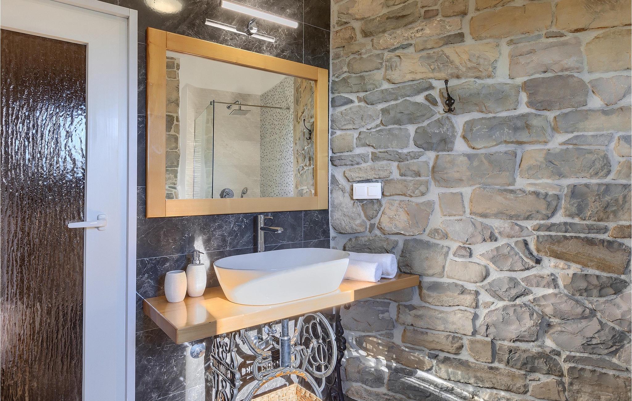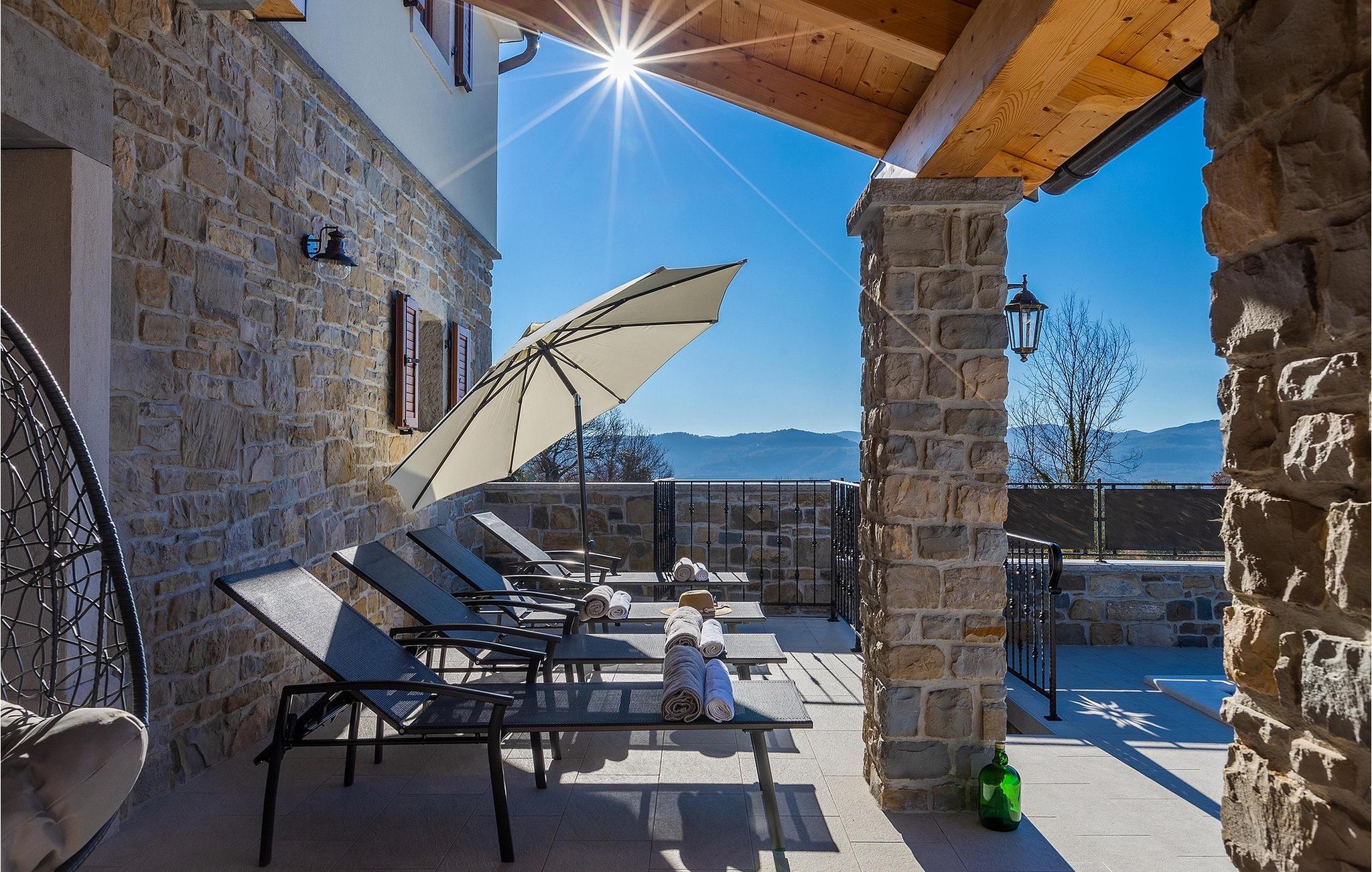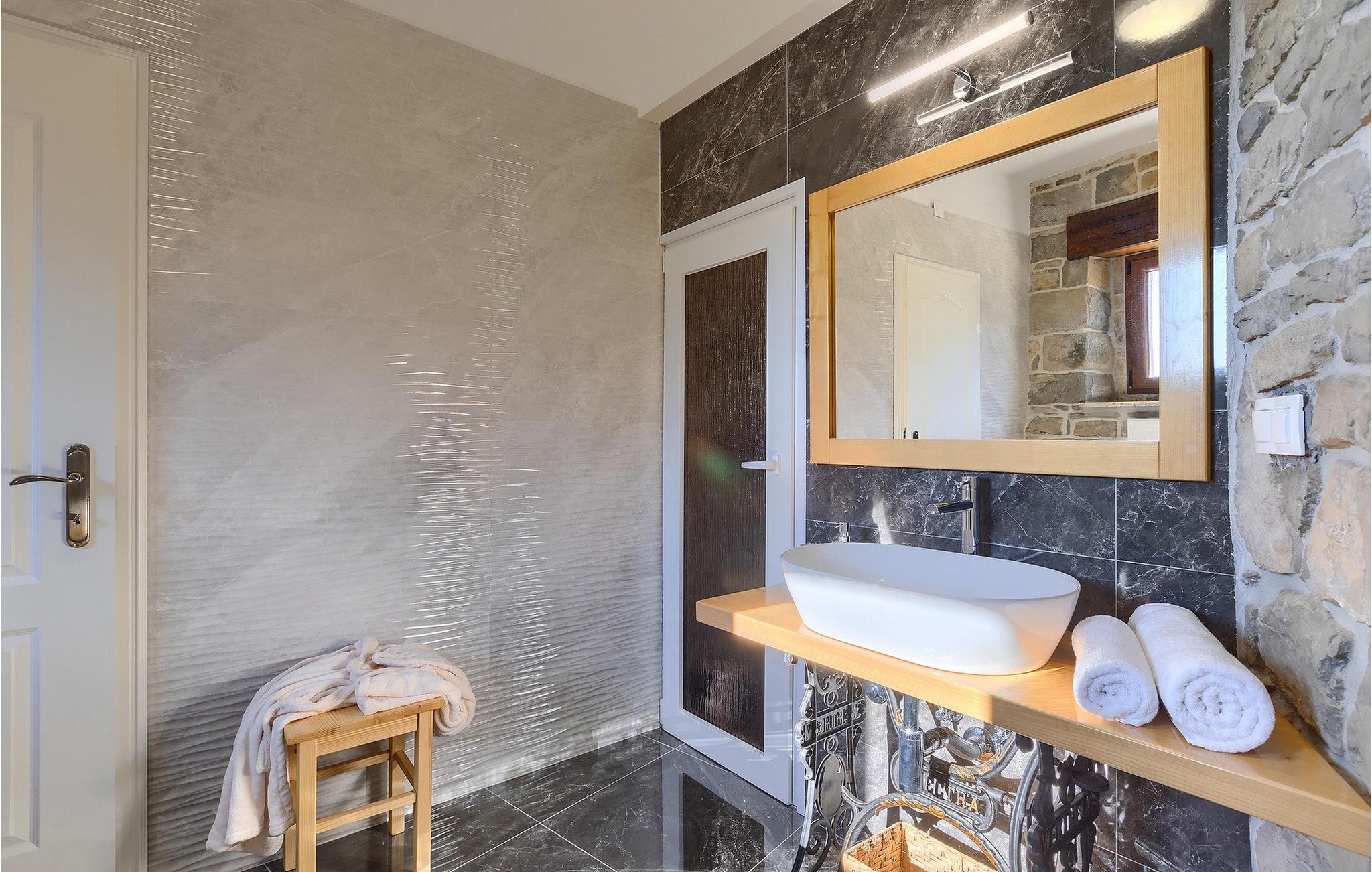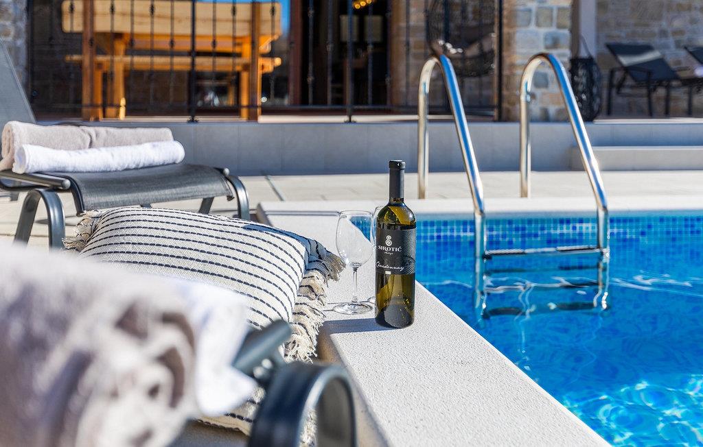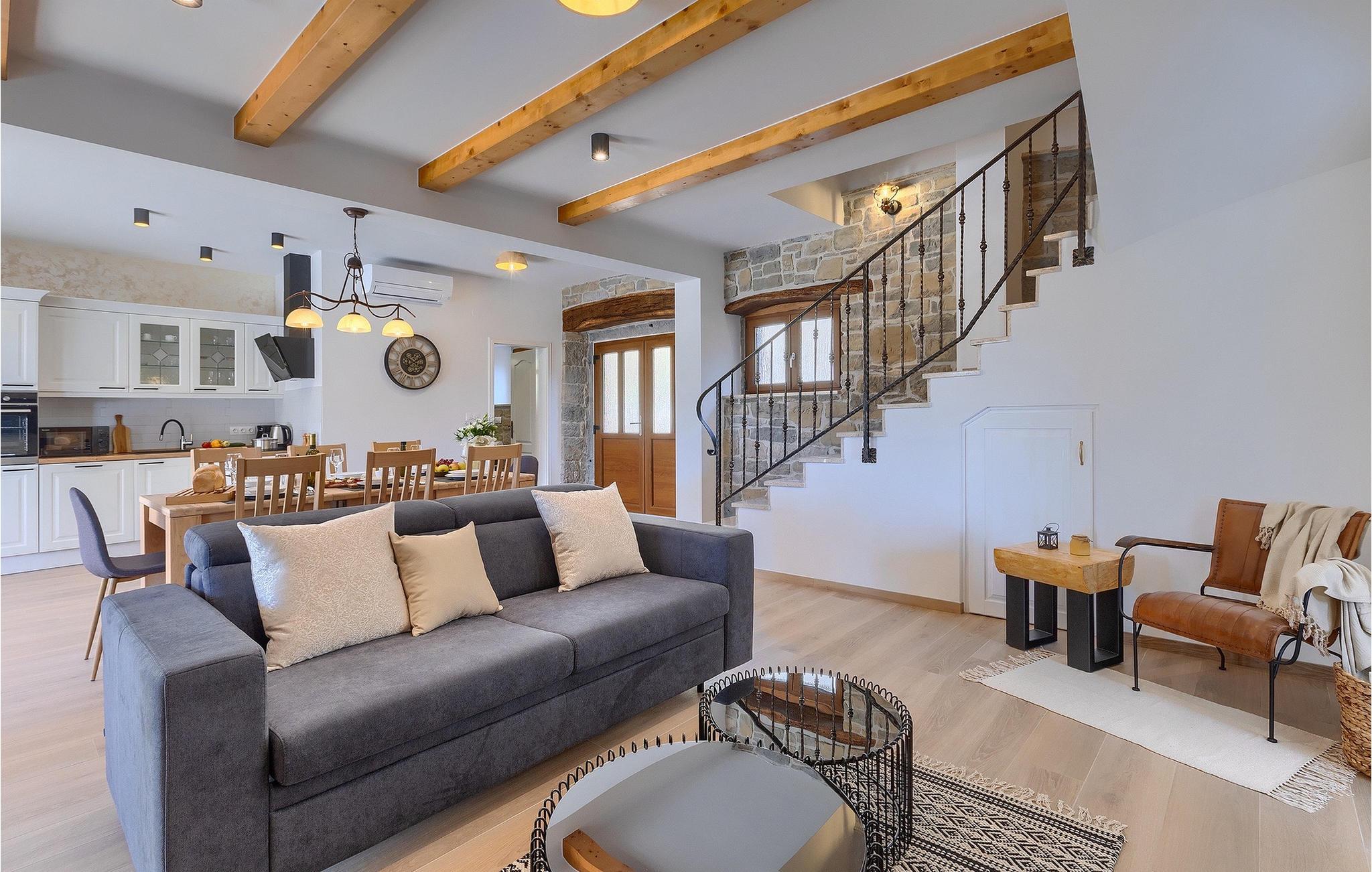 Villa Poji er en charmerende villa i den lille landsby Marceneško polje i Buzet kommune. Villaen er fuldstændig restaureret og vil få dig til at føle dig hjemme. Med i alt 215 kvadratmeter boligareal og 3 nænsomt indrettede soveværelser kan den rumme op til 6+2 personer. Stueetagen af villaen består af en meget lys og luftig stue og spisestue, et fuldt udstyret køkken og et soveværelse med eget badeværelse. Ovenpå finder du yderligere to soveværelser. Det store soveværelse med dobbeltseng har eget badeværelse med badekar, mens det andet soveværelse har to enkeltsenge og også har eget badeværelse med bruser. Fra opholdsrummet har I direkte adgang til den overdækkede udendørs spiseplads, hvor I kan nyde en hyggelig middag med familien og en storslået udsigt over omgivelserne. Kun få skridt væk ligger den indbydende private pool, det perfekte sted at forfriske dig selv eller slappe af på de komfortable liggestole. I slutningen af dagen skal du lade alle dine bekymringer ligge i spa-området og slappe af i jacuzzien og saunaen. Cykler er også til din rådighed for at udforske og opdage det bredere område. Hvis du leder efter en rolig og afslappende ferie, er Villa Poji det rigtige valg for dig. Gå ikke glip af denne mulighed og bestil Villa Poji lige nu! Familievillaen Poji ligger i en lille landsby i Buzet kommune i det centrale Istrien. Villaen er omgivet af olivenlunde og kun få naboer. Hvis du leder efter en afslappende og fredelig ferie, er denne villa det perfekte sted. Buzet er den første større by, hvor du kan købe dagligvarer. Hvis du leder efter restauranter, er der nogle af de bedste restauranter i Istrien i området, der serverer traditionelle retter som hjemmelavet pasta med trøfler, istrisk oksekød, alt sammen toppet med et glas af det bedste Malvasia. Det centrale Istrien er kendt for sine mange cykel- og vandrestier, hvor du kan nyde naturen og opdage små bakkebyer som Buzet, Motovun og Groznjan. For kulturelskere anbefaler vi et besøg i byen Pula med dets amfiteater og Porec med Eufrazier-basilikaen. Hvis du vil tilbringe din ferie på stranden, er Novigrad den første strand, men gå ikke glip af at opdage mange andre skjulte bugter og strande i Istrien.