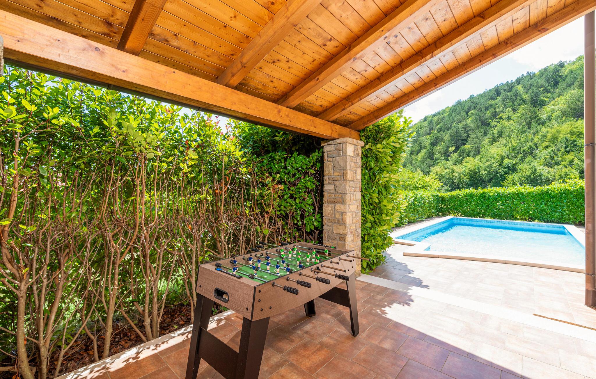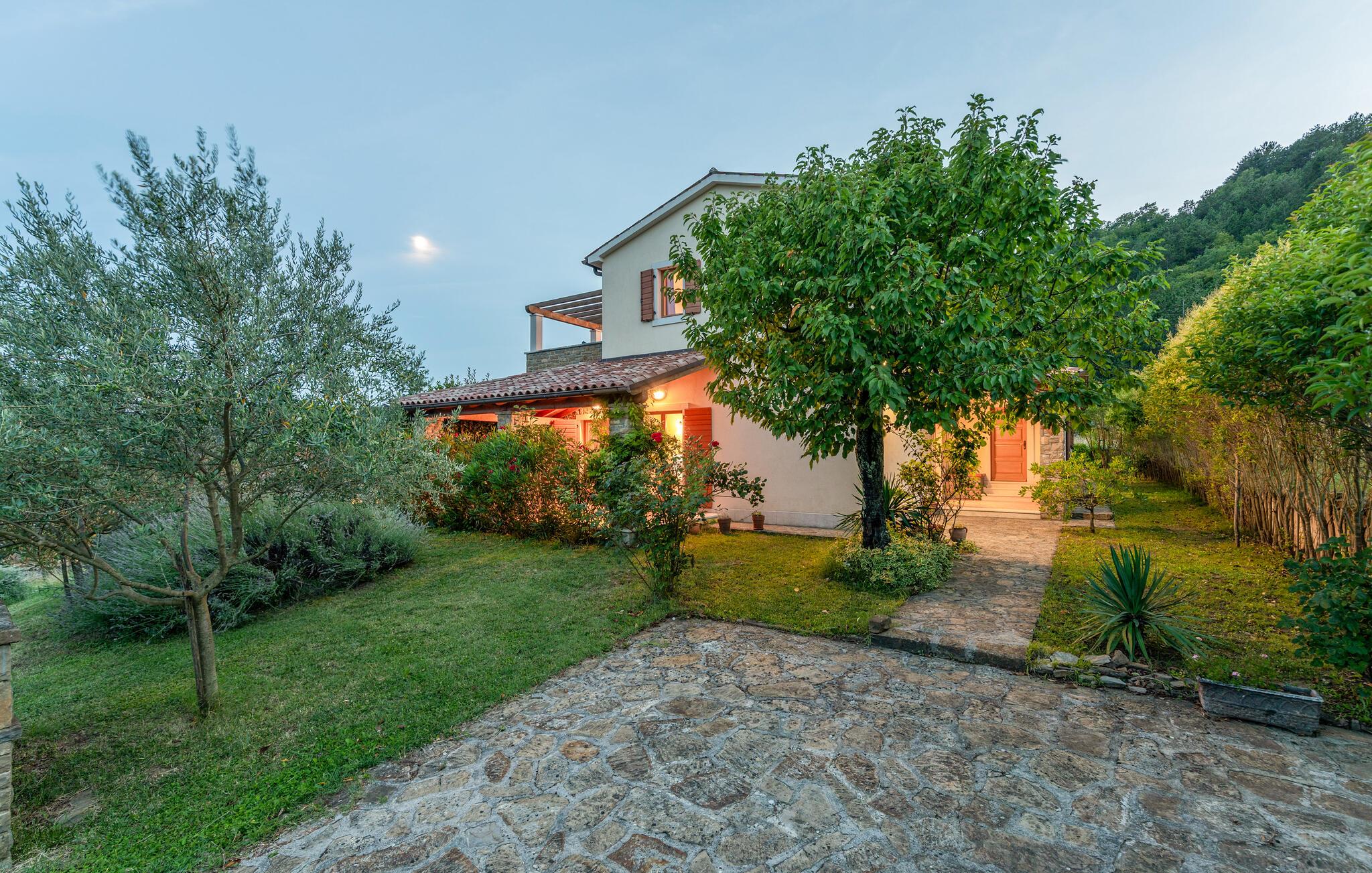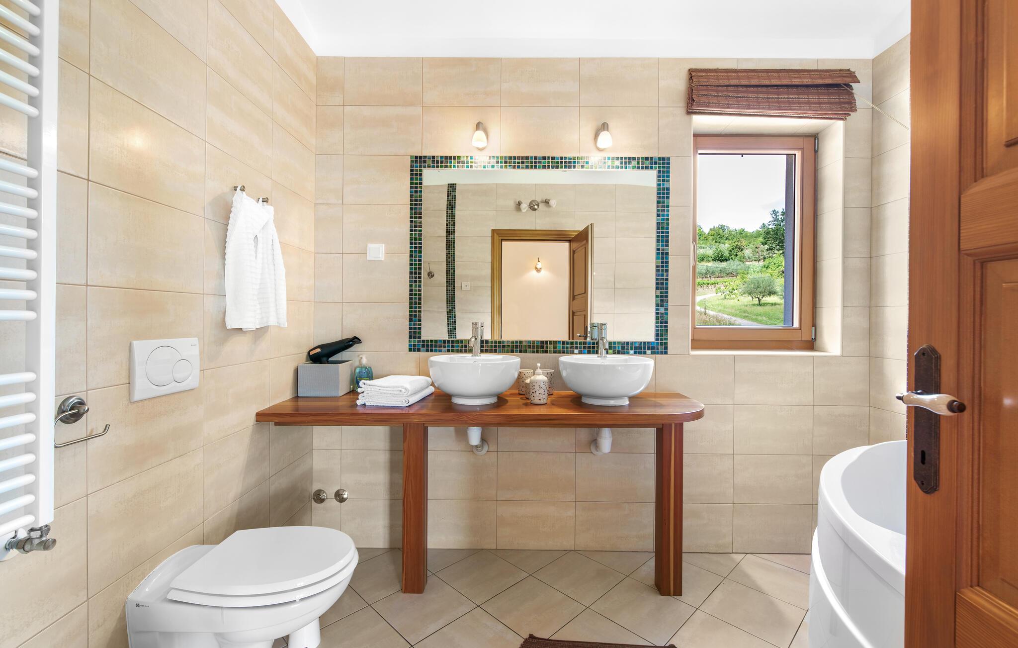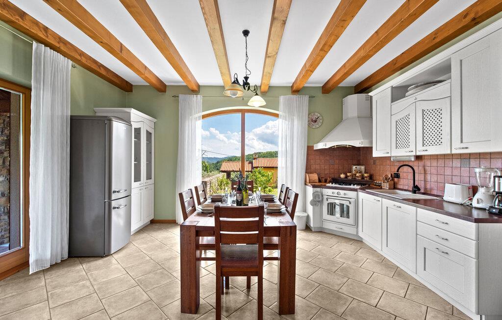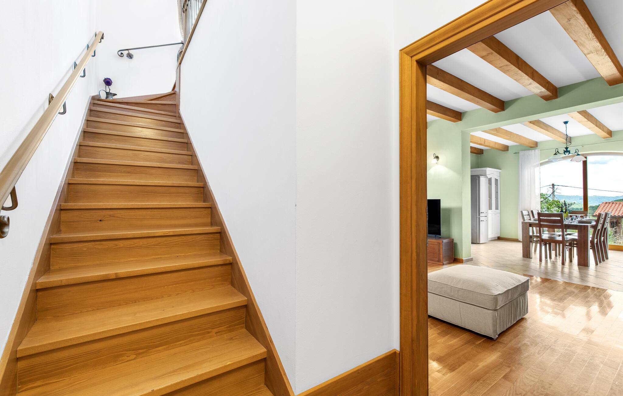 Villa Dol er et charmerende, rustikt oase i rolige omgivelser, perfekt til afslapning. Villaens udendørsområde omfatter en swimmingpool, tre overdækkede terrasser til udendørs spisning, en anlagt have og to parkeringspladser. Indvendigt møder komfort rustik charme på tværs af to etager med aircondition. Stueetagen indeholder en hyggelig stue med pejs, et veludstyret køkken med spiseplads og to soveværelser - det ene med dobbeltseng og det andet med separate senge - hver med eget badeværelse og et ekstra separat toilet. Ovenpå finder du et rummeligt soveværelse med dobbeltseng med en-suite badeværelse, som fører til en stor terrasse med en fantastisk panoramaudsigt over det omkringliggende landskab. Villa Dol ligger i udkanten af en stille landsby i det grønne indre af Istrien. Den nærmeste restaurant ligger 7 km væk i Sovinjak, og byen Buzet, 12 km væk, byder på supermarkeder, bagerier, pengeautomater, apoteker og meget mere. Den nærmeste strand er i Novigrad. Området er kendt for sine trøfler, som du kan nyde på lokale restauranter. Bemærk venligst, at denne ejendom ikke accepterer ungdomsgrupper eller polterabender. En ungdomsgruppe på denne ejendom består af personer på 26 år eller derunder.