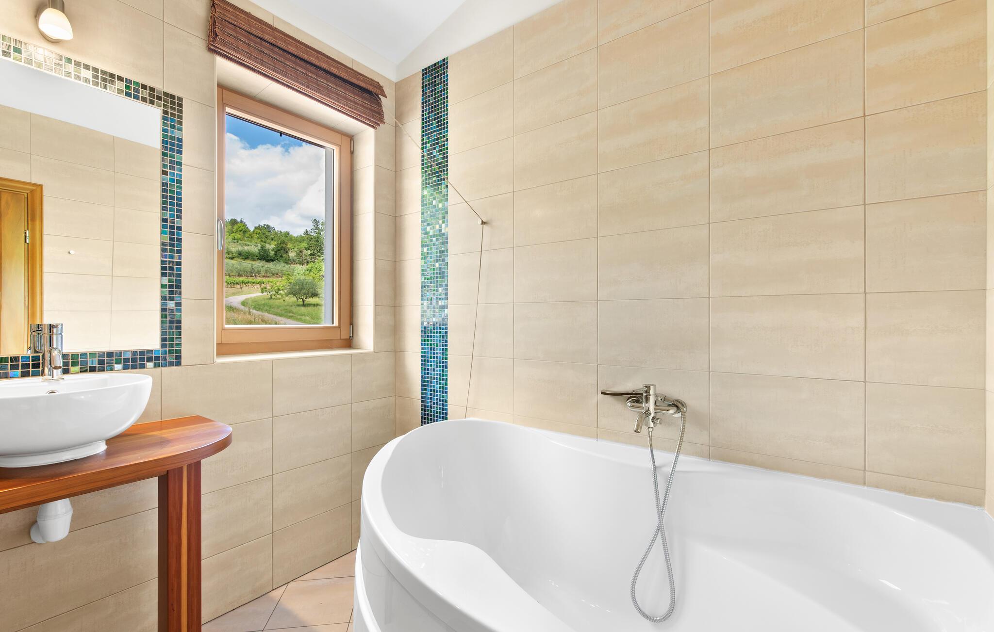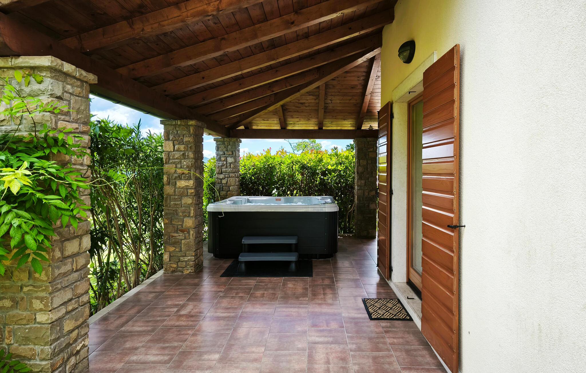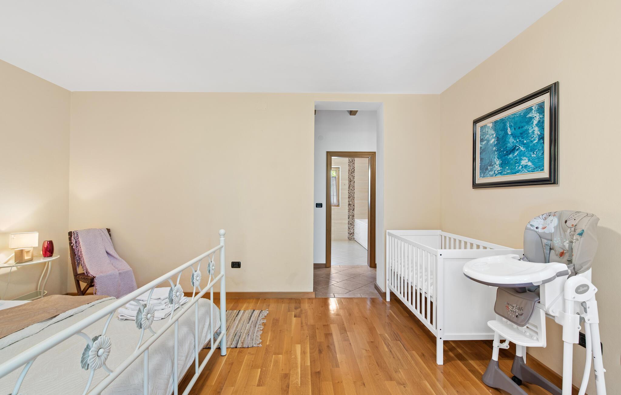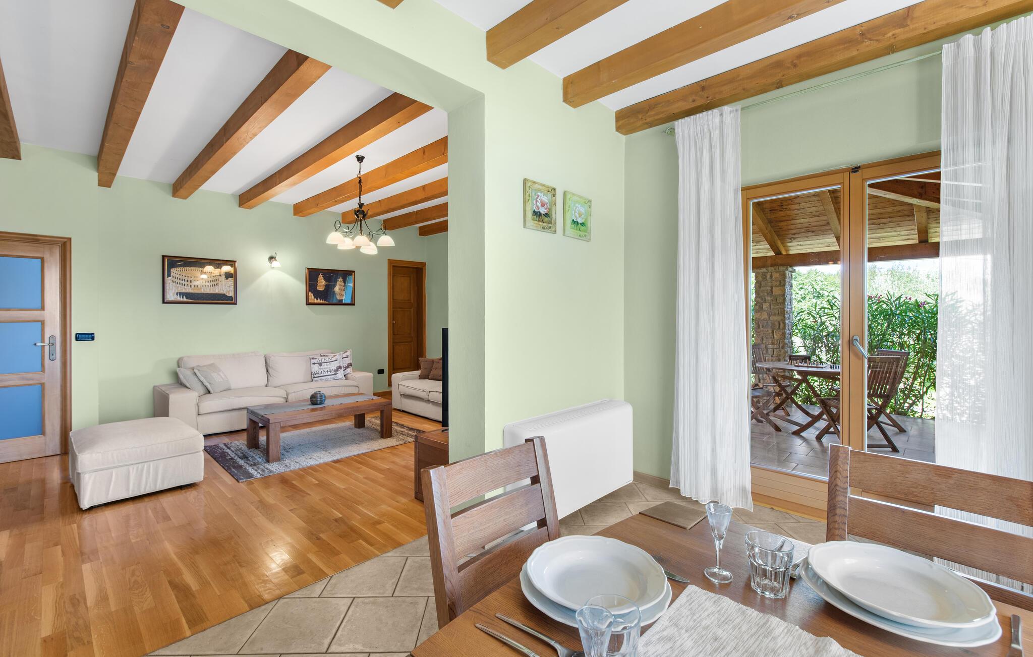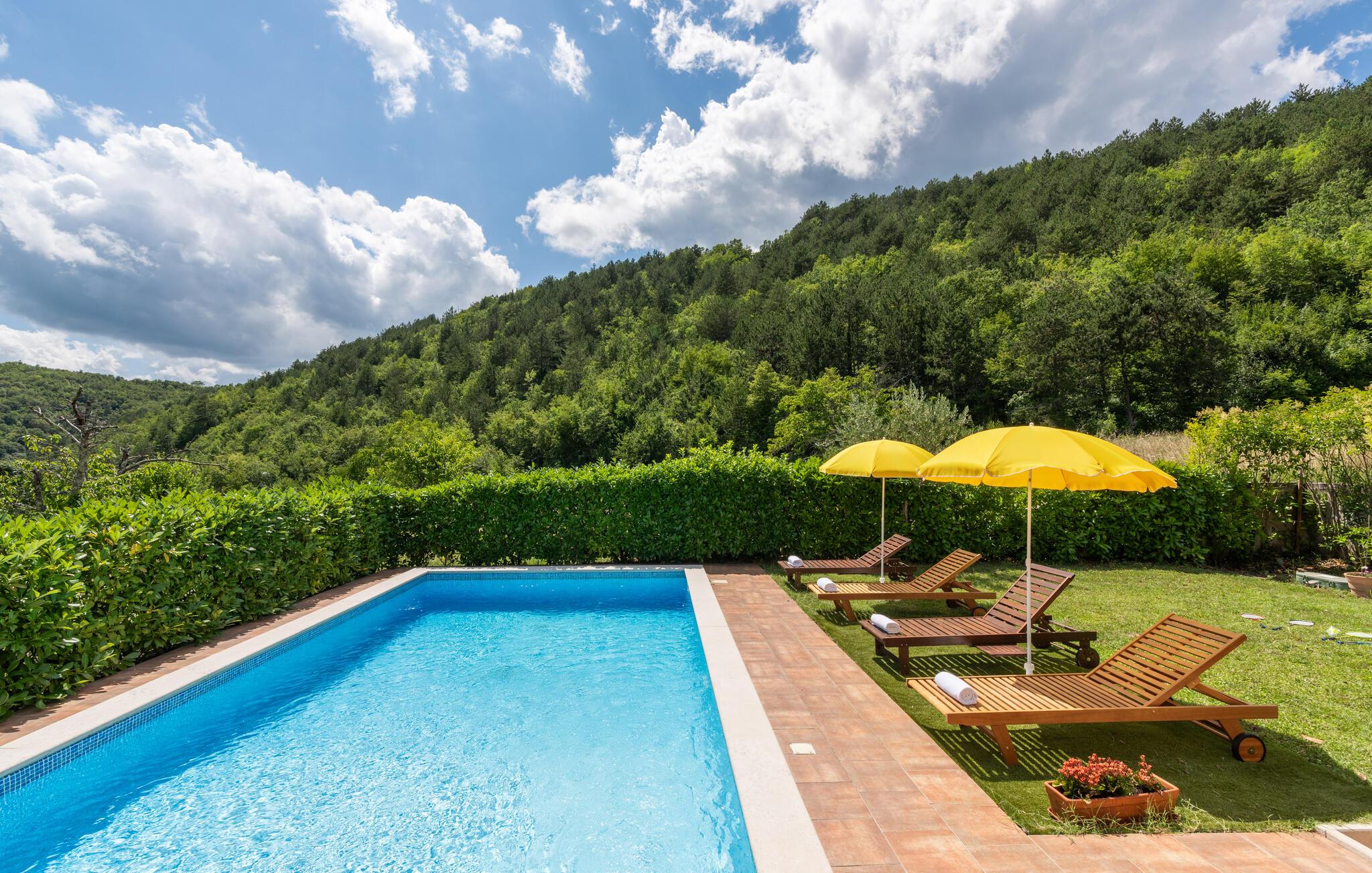 Villa Dol er et charmerende, rustikt oase i rolige omgivelser, perfekt til afslapning. Villaens udendørsområde omfatter en swimmingpool, tre overdækkede terrasser til udendørs spisning, en anlagt have og to parkeringspladser. Indvendigt møder komfort rustik charme på tværs af to etager med aircondition. Stueetagen indeholder en hyggelig stue med pejs, et veludstyret køkken med spiseplads og to soveværelser - det ene med dobbeltseng og det andet med separate senge - hver med eget badeværelse og et ekstra separat toilet. Ovenpå finder du et rummeligt soveværelse med dobbeltseng med en-suite badeværelse, som fører til en stor terrasse med en fantastisk panoramaudsigt over det omkringliggende landskab. Villa Dol ligger i udkanten af en stille landsby i det grønne indre af Istrien. Den nærmeste restaurant ligger 7 km væk i Sovinjak, og byen Buzet, 12 km væk, byder på supermarkeder, bagerier, pengeautomater, apoteker og meget mere. Den nærmeste strand er i Novigrad. Området er kendt for sine trøfler, som du kan nyde på lokale restauranter. Bemærk venligst, at denne ejendom ikke accepterer ungdomsgrupper eller polterabender. En ungdomsgruppe på denne ejendom består af personer på 26 år eller derunder.