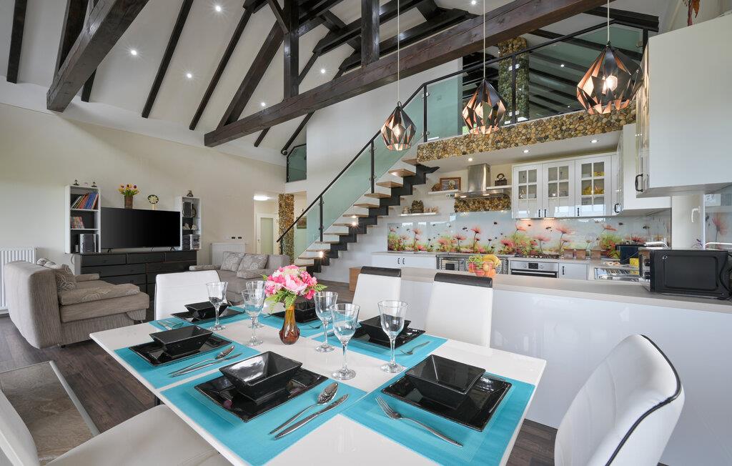 Nyd en harmonisk kombination af lyse rum og mørke loftsbjælker, der fremmer afslapning. Nyd den smukke udsigt og spis måltider sammen, mens I kigger ud i det fri. Efter en spændende dag kan I finde jer til rette i sofaen og skabe en hyggelig atmosfære med ild i pejsen.