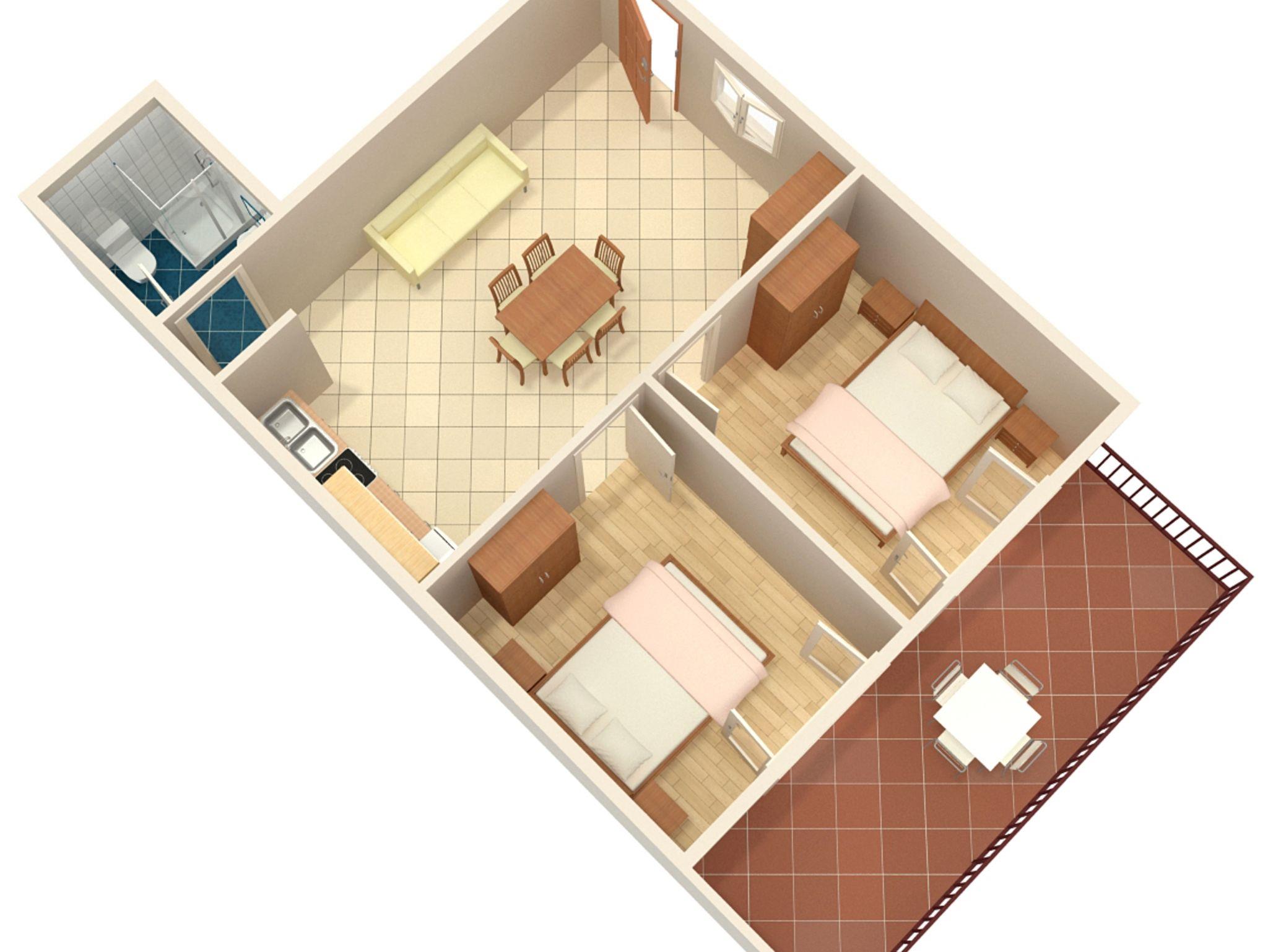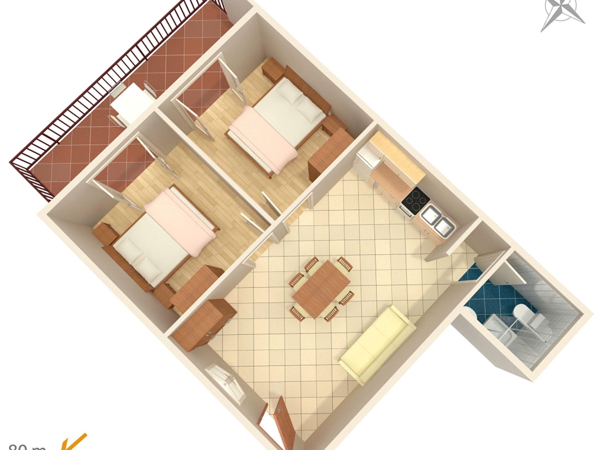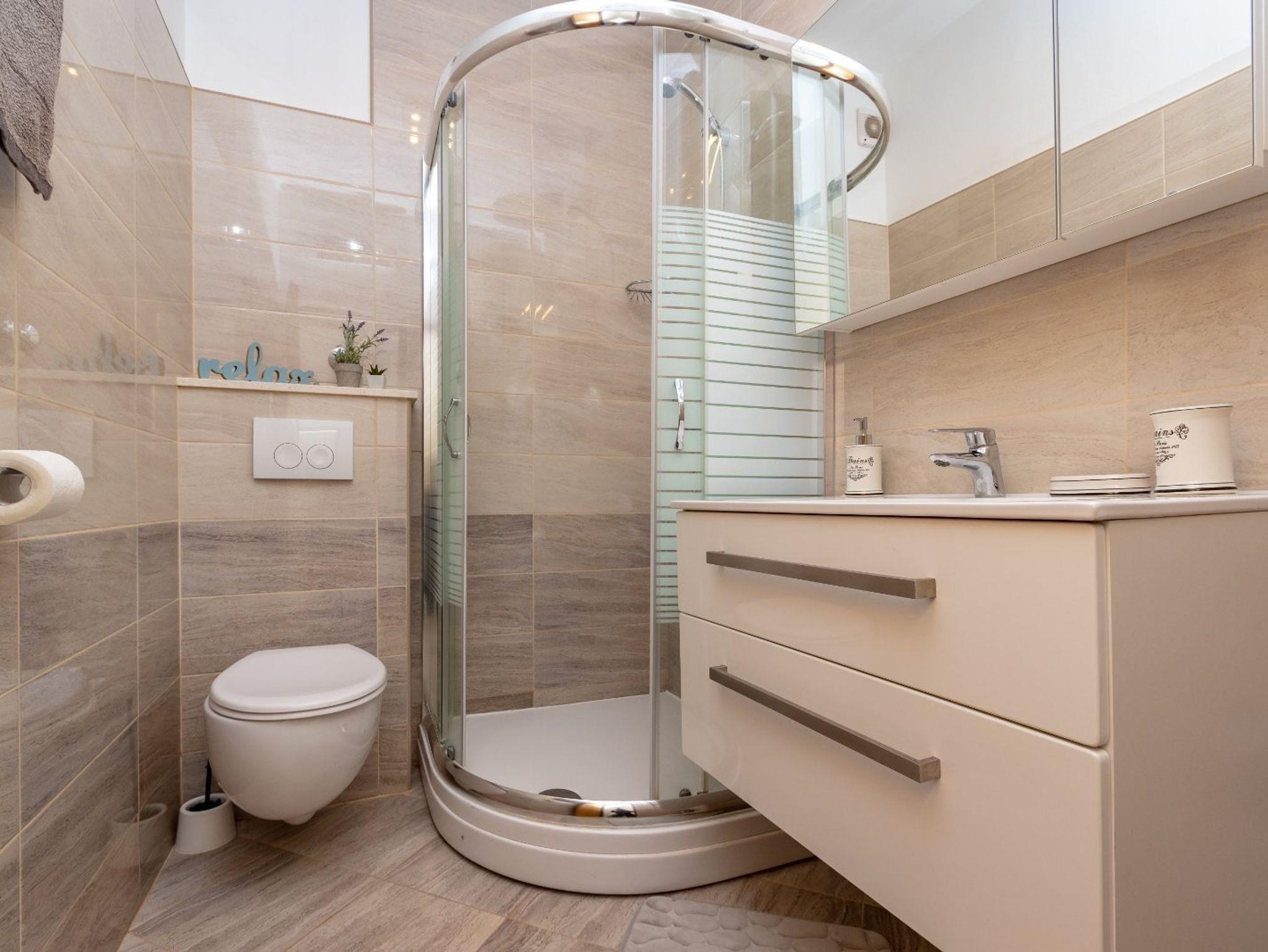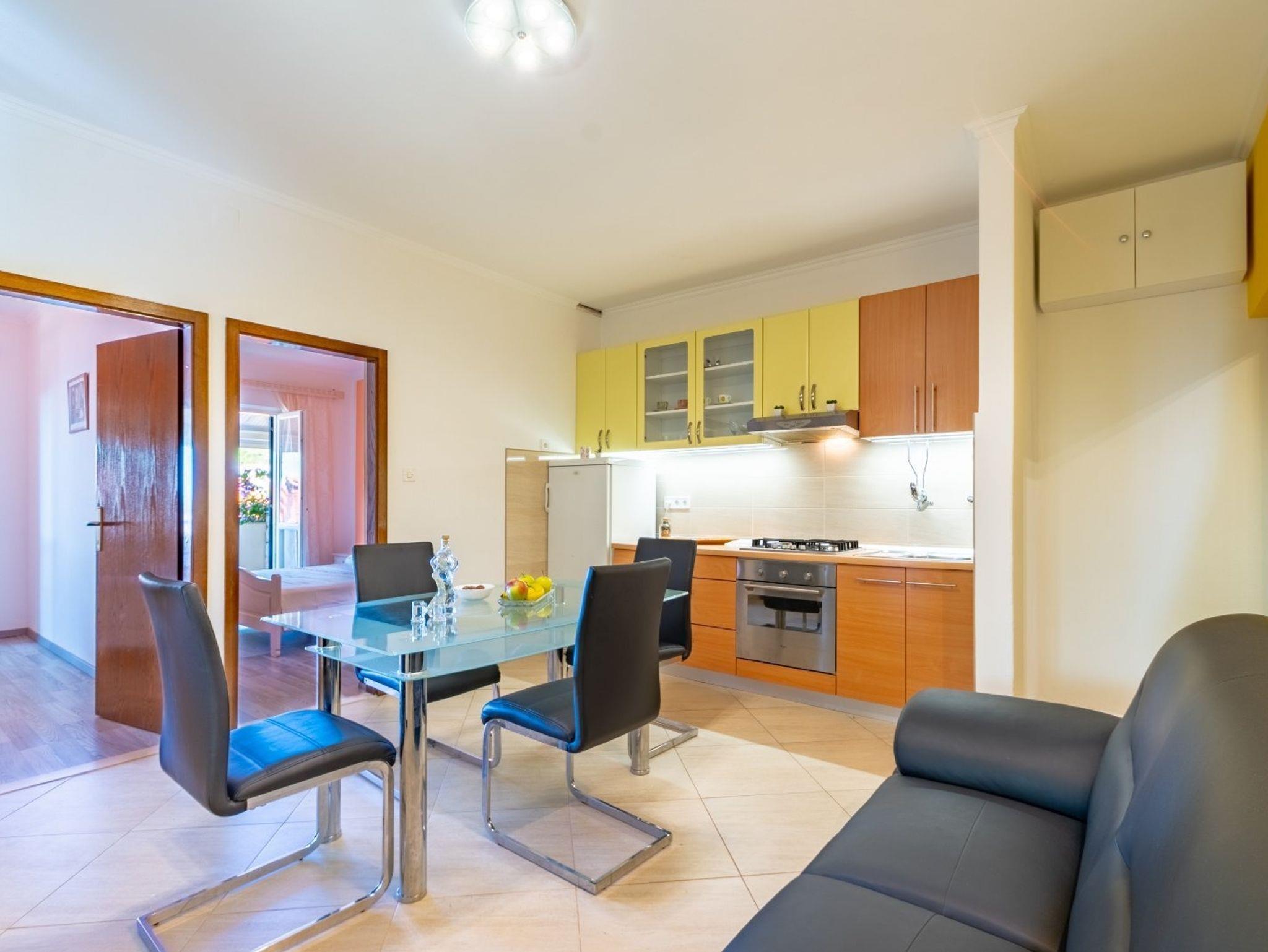 Ferienwohnung bietet Platz für 4 Gäste. Die Betten sind in Schlafzimmern, die es 2 gibt, innerhalb einer Gesamtfläche von 46m2, angeordnet. Die Gäste haben eine eigene Terrasse zur Verfügung, auf der sie in warmen Sommernächten genießen können. Das Apartment bietet Meerblick. Es ist erlaubt, Speisen auf dem Gemeinschafts-Grill vorzubereiten. IM PREIS INBEGRIFFEN: Kurtaxe, Endreinigung, Klimatisierung, Parkplatz, Internet. VERBINDLICHE ZUSÄTZLICHE KOSTEN: Aufzahlung für Kurzaufenthalte (prozentualer Zuschlag pro Nächtigungsanzahl: 30% - 1, 20% - 2, 10% - 3). Die Verfügbarkeit zusätzlicher Dienstleistungen in Ihrem reservierten Termin und die Preise derselben (falls nicht aufgeführt) müssen im Voraus überprüft werden. Zusätzliche Dienstleistungen die in der Zahlungsaufforderung nicht aufgeführt sind werden direkt beim Vermieter bezahlt, angenommen der Gast nutzt auch diese. Ermäßigung auf den Grundpreis: Gratistag 14=13 (bei einem Aufenthalt von 14 Tagen oder mehr erhalten Sie einen Gratistag für den Aufenthalt bis 31.12.26).