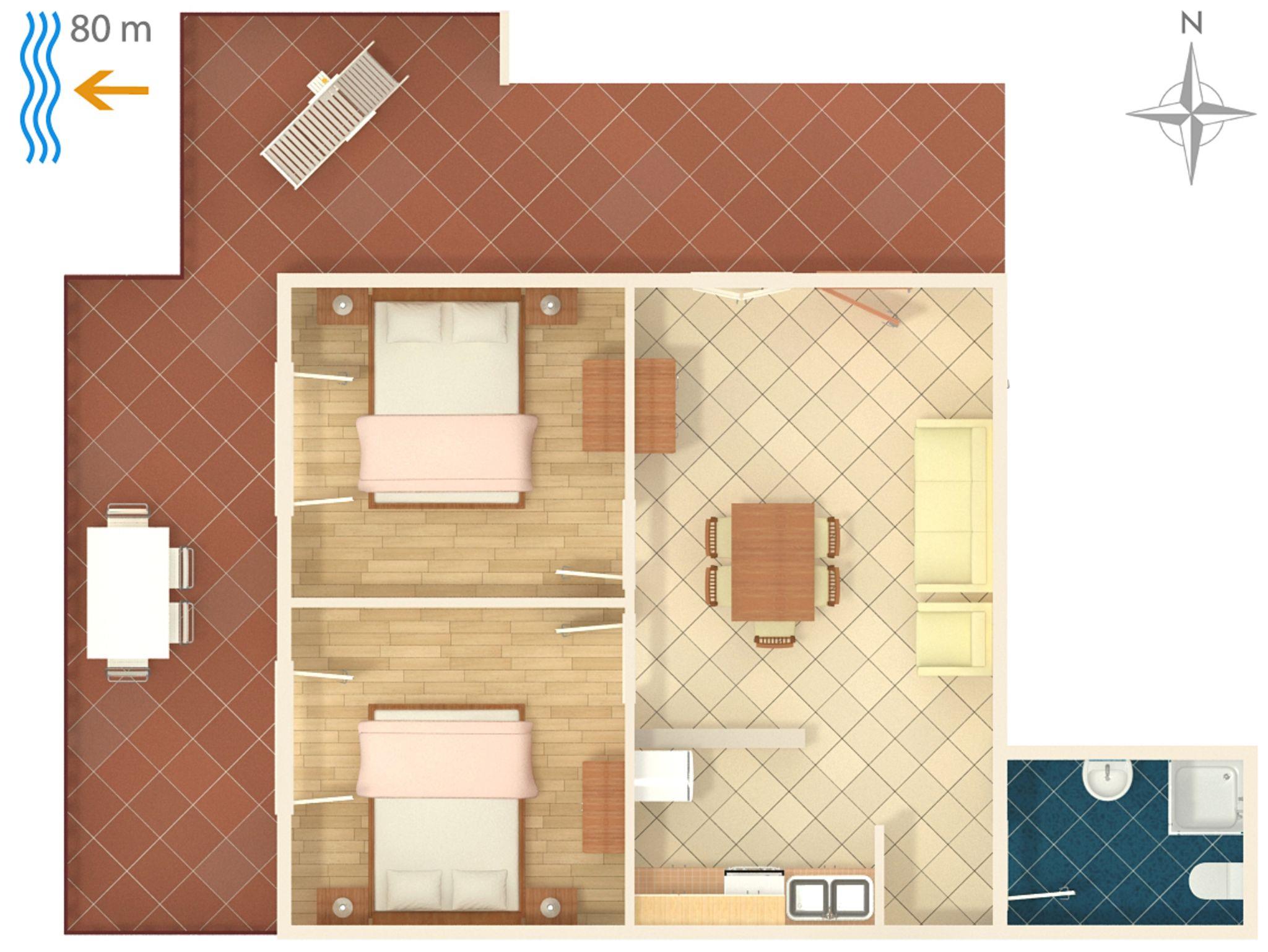 Ferienwohnung bietet Platz für 4 Gäste. Die Betten sind in Schlafzimmern, die es 2 gibt, innerhalb einer Gesamtfläche von 50m2, angeordnet. Die Gäste haben eine eigene Terrasse zur Verfügung, auf der sie in warmen Sommernächten genießen können. Das Apartment bietet Meerblick. Es ist erlaubt, Speisen auf dem Gemeinschafts-Grill vorzubereiten. IM PREIS INBEGRIFFEN: Kurtaxe, Endreinigung, Klimatisierung, Parkplatz, Internet. VERBINDLICHE ZUSÄTZLICHE KOSTEN: Aufzahlung für Kurzaufenthalte (prozentualer Zuschlag pro Nächtigungsanzahl: 30% - 1, 20% - 2, 10% - 3). Die Verfügbarkeit zusätzlicher Dienstleistungen in Ihrem reservierten Termin und die Preise derselben (falls nicht aufgeführt) müssen im Voraus überprüft werden. Zusätzliche Dienstleistungen die in der Zahlungsaufforderung nicht aufgeführt sind werden direkt beim Vermieter bezahlt, angenommen der Gast nutzt auch diese. Ermäßigung auf den Grundpreis: Gratistag 14=13 (bei einem Aufenthalt von 14 Tagen oder mehr erhalten Sie einen Gratistag für den Aufenthalt bis 31.12.26).