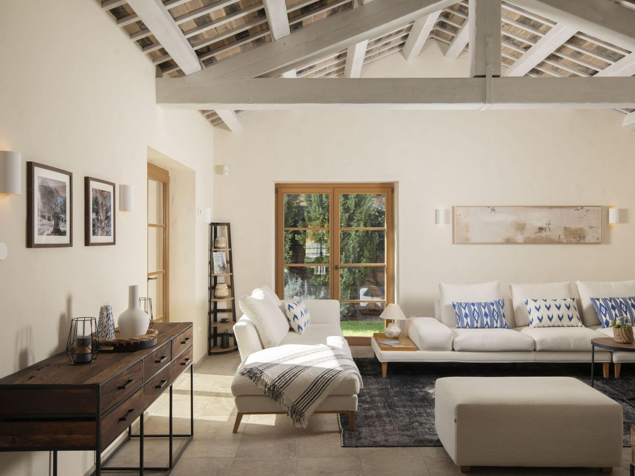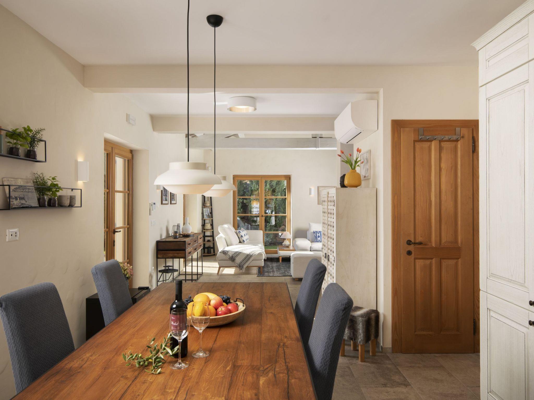 Inside the villa, guests will find all the modern amenities needed for a comfortable stay. A cozy indoor fireplace, three air conditioning units, and satellite TV with Netflix with streaming functions and entertainment. The fully equipped kitchen is perfect for preparing meals. The villa includes two bathrooms: one with a bathtub and shower, the other with a guest toilet.