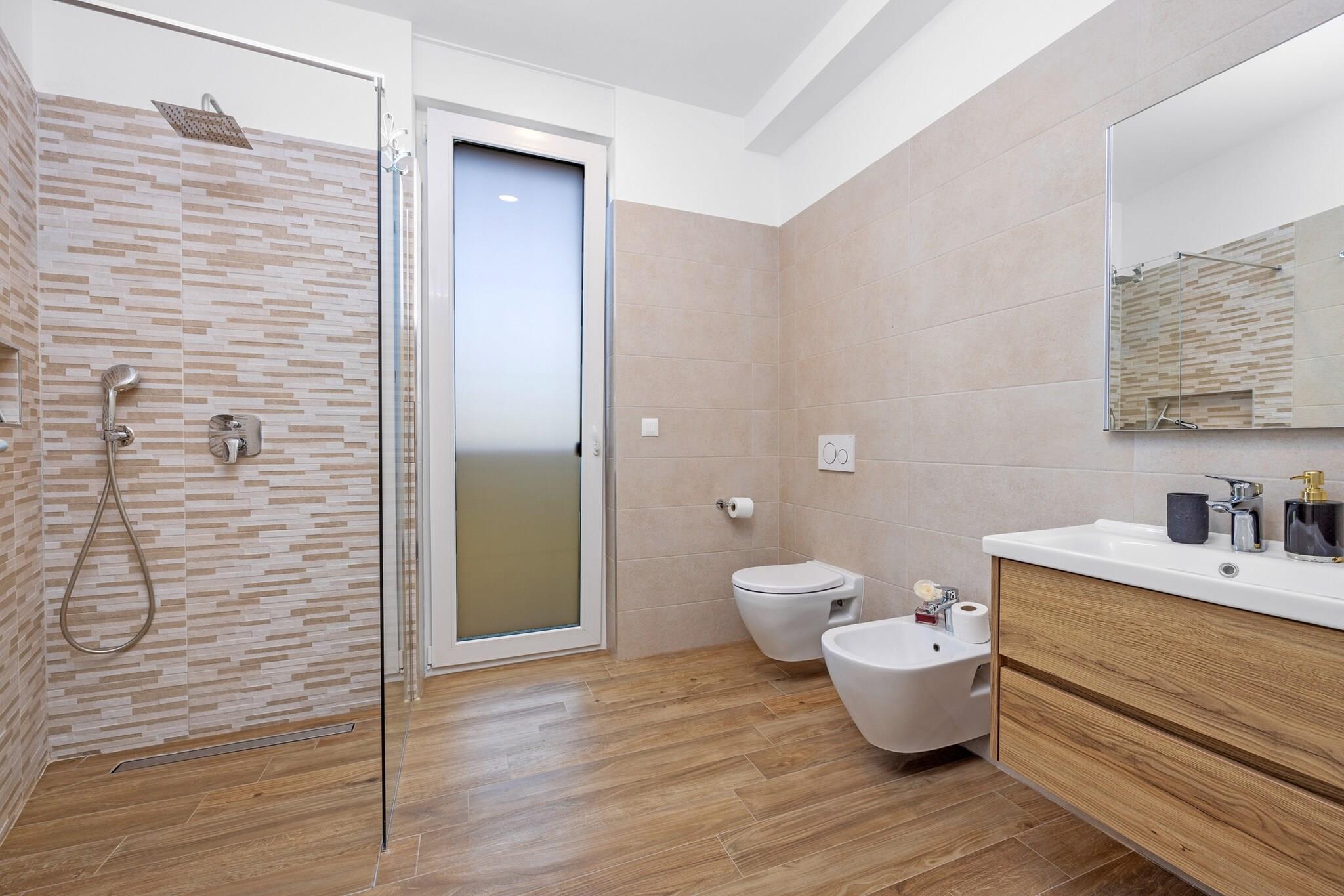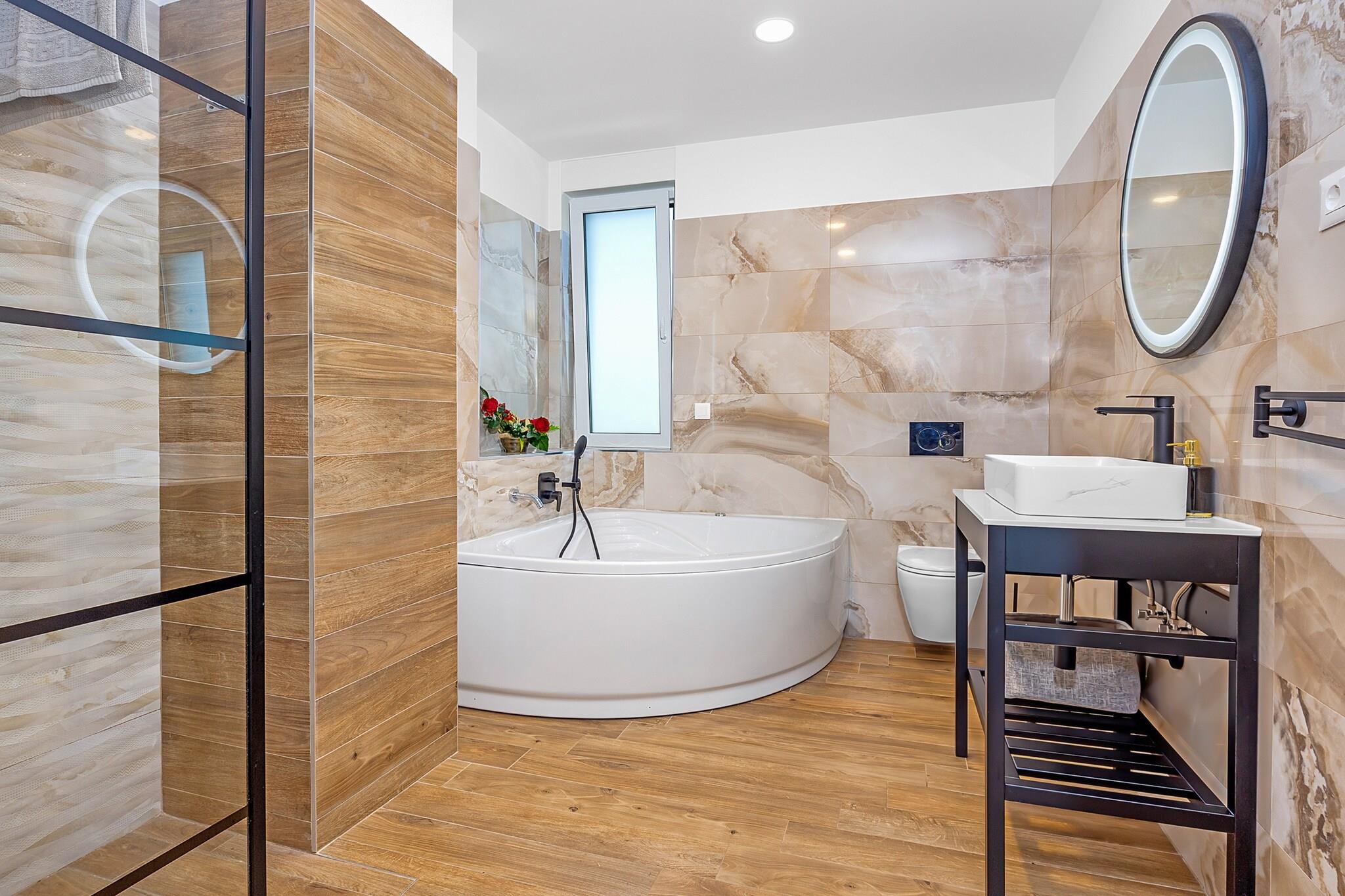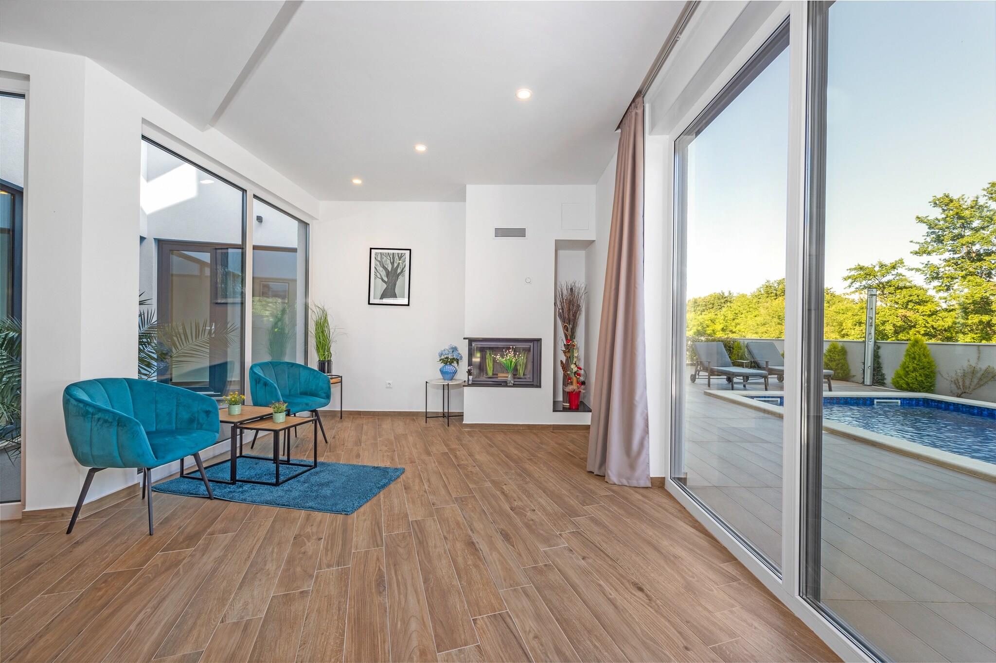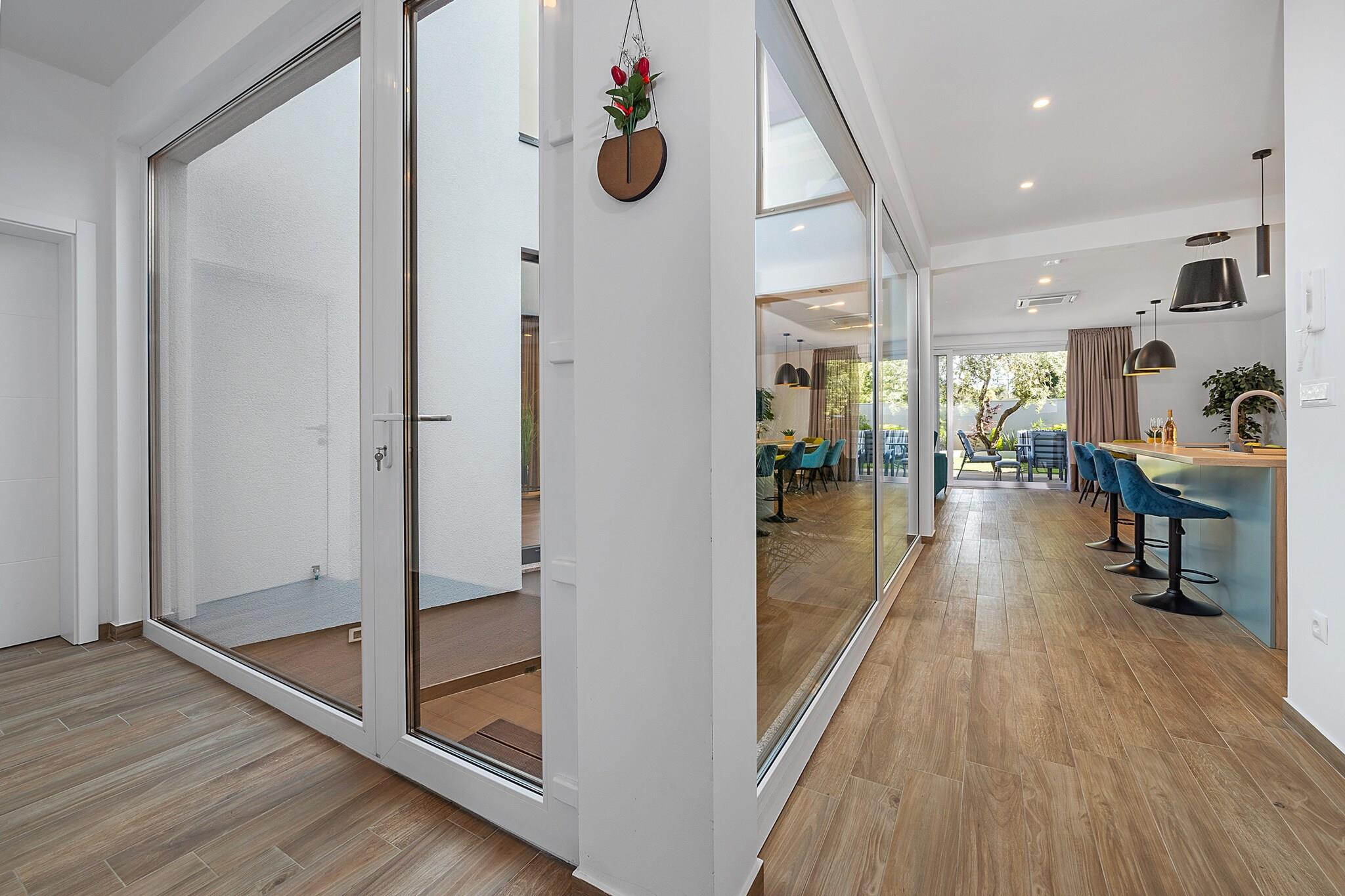 Oplev opfyldelsen af dine drømme i denne udsøgte villa, perfekt beliggende nær den fantastiske by Porec i den charmerende landsby Cervar. Tilbyder det ultimative tilflugtssted, inviterer dette tilflugtssted dig til at nyde afslappede dage ved poolen eller jacuzzien, samtidig med at det giver mulighed for sjove aktiviteter som billard og bordfodbold - alt sammen uden behov for vanskelige valg. Villaen er omgivet af smukt anlagte grunde og er et paradis for afslapning, der inviterer dig til at nyde solen på liggestole under træernes blide skygge eller nyde dejlige grillaftener i haven, hvilket skaber uforglemmelige øjeblikke med familie og venner. Træd ind for at opdage et smagfuldt indrettet opholdsrum, der problemfrit forbinder til et fuldt udstyret køkken med udsigt over poolen og haven. I stueetagen venter et komfortabelt soveværelse, komplet med eget badeværelse og tv for privatliv og bekvemmelighed. Gå til det øverste niveau for at finde en fredfyldt balkon med jacuzzi og liggestole, tilgængelig fra både gangen og et af de charmerende soveværelser, som også kan prale af en jacuzzi på badeværelset. Villaens kælder byder på endnu mere spænding med bordtennis, pool og bordfodbold til timers underholdning. Kun 1 kilometer fra en smuk stenstrand i Cervar Porat, kan du nyde svømning, beachvolley og dejlige måltider på nærliggende restauranter og caféer. Familier vil sætte pris på den lokale park kun 2 minutters gang væk, mens området er rigt på attraktioner såsom den bemærkelsesværdige Baredine-grav, Adventure Park Sky Fox og den spændende Aquapark Istralandia. Uanset om du ønsker at slappe af i naturen eller udforske pulserende omgivelser, er dette fortryllende tilflugtssted din ideelle destination for den perfekte flugt.
