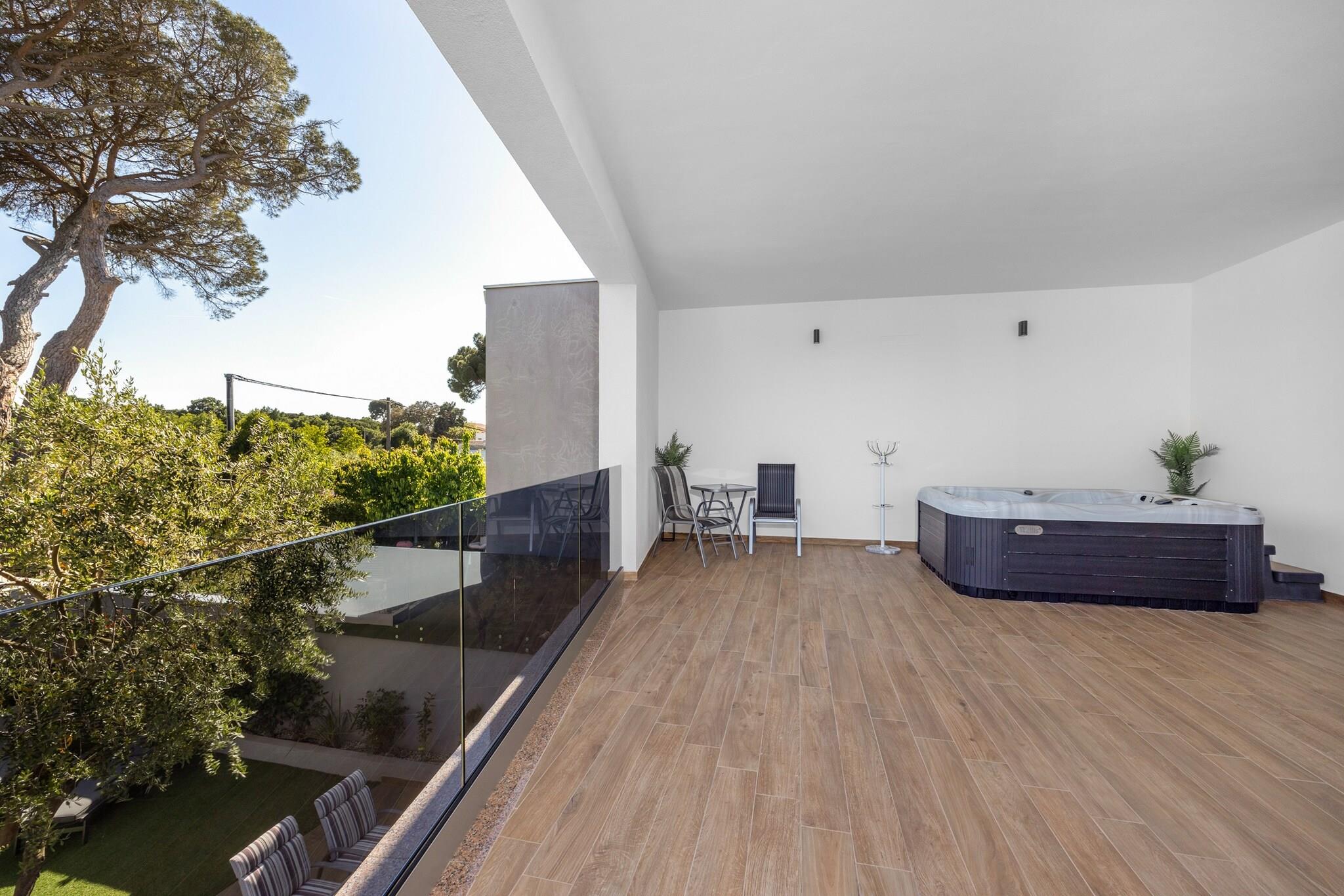 Stueetage: (Stue(enkeltsovesofa, Fjernsyn(fladskærm, parabol, Smart-TV)), åbent køkken(kogeplade, elkedel, brødrister, kaffemaskine, ovn, mikrobølgeovn, opvaskemaskine , køleskab, fryser, ()), soveværelse(king size-seng, Fjernsyn(fladskærm, parabol, Smart-TV)), badeværelse(bruser), Internetadgang) På 1. etage: (entre(balkon), soveværelse(king size-seng, Fjernsyn(fladskærm, parabol, Smart-TV)), soveværelse(king size-seng, Fjernsyn), badeværelse(bruser), badeværelse(badekar, bidet), toilet, Bubble bath) Havemøbler, hottub, bruser, vaskemaskine, balkon, varme(central), klimaanlæg, terrasse, have(indhegnet), have, cykelopbevaring, solstole, grill, parkering, swimmingpool(privat), barnestol, strygebræt, strygejern, føntørrer, tørreskab, crib(free),
