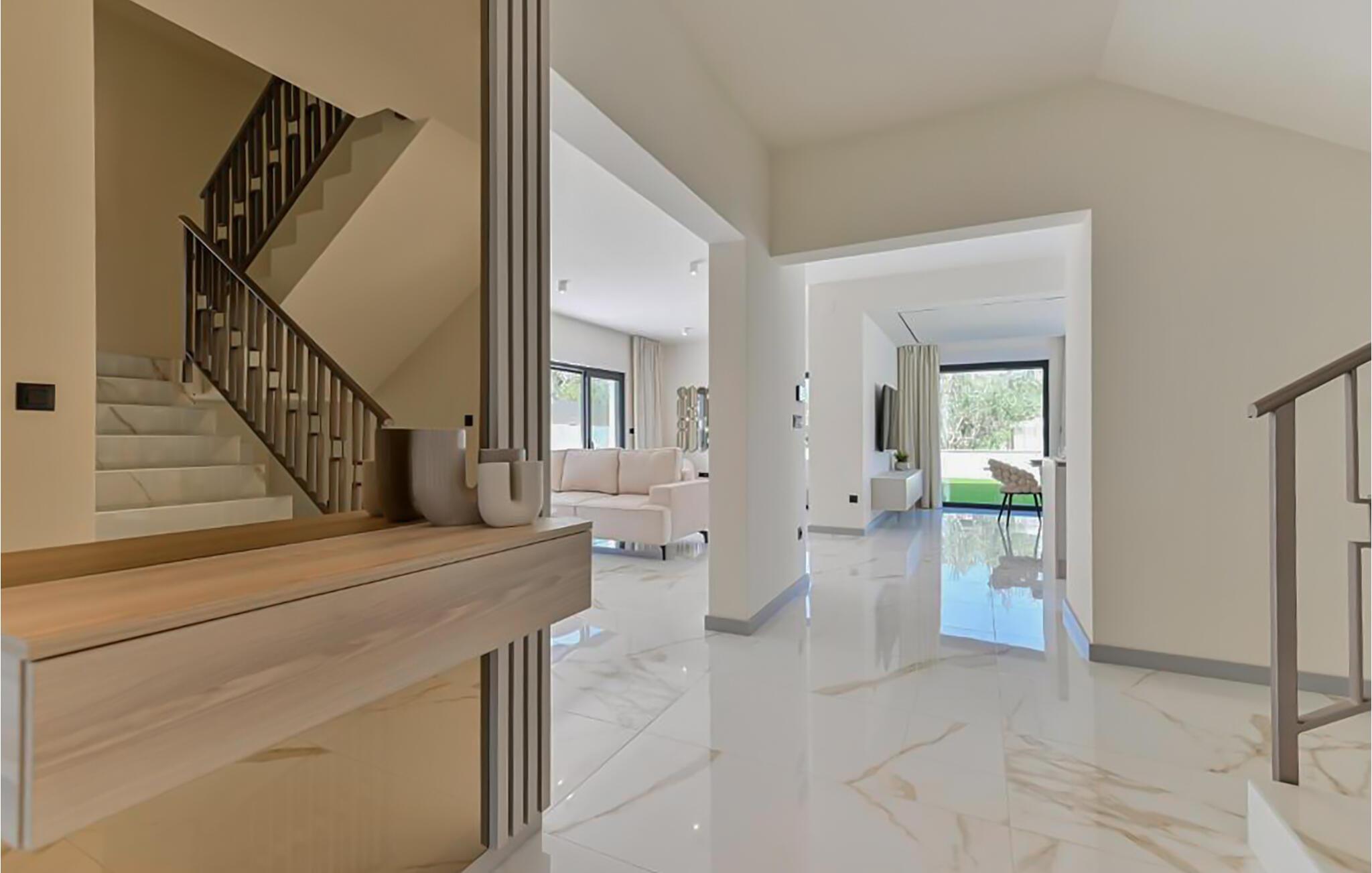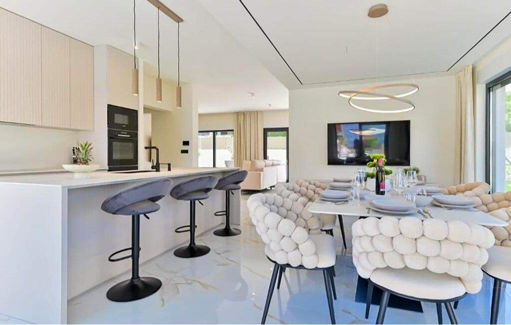 Dette feriehus, udstyret med adskillige ekstrafunktioner, ligger kun få skridt fra sandstranden og har et lyst og stilfuldt møbleret interiør. find sammen omkring det indbydende spisebord til lækre måltider, afhold sjove madlavningsaftener og hold jer i form på træningsudstyret. Efter en lang dag i solen kan I slappe af med en film eller mindes over et glas vin.