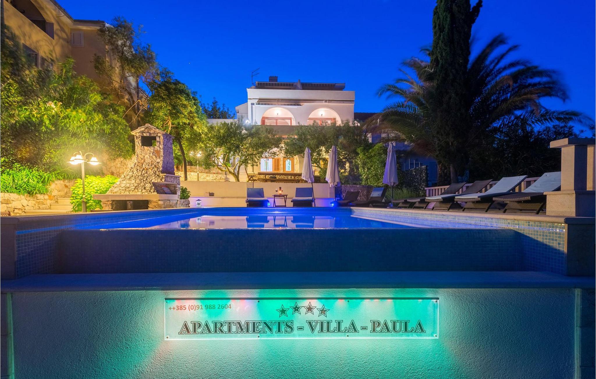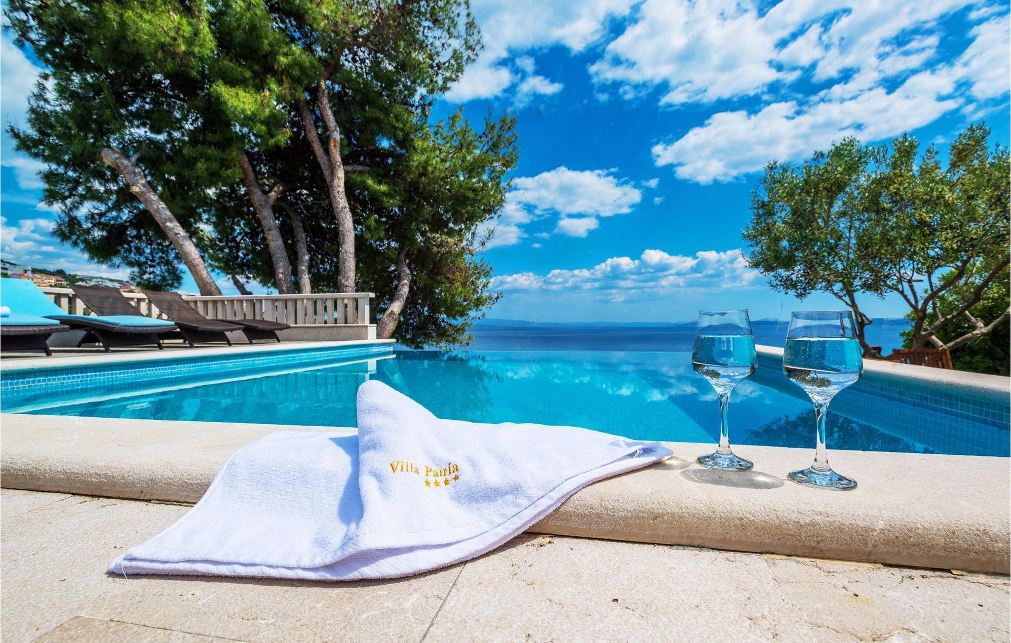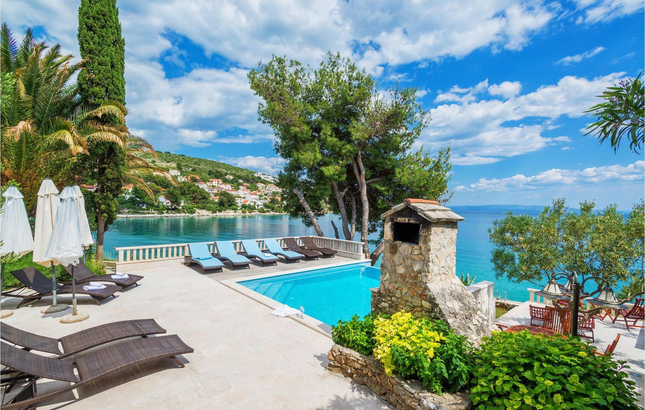 Durch seine hervorragende Lage direkt an der felsigen Küste gesegnet und perfekt positioniert, um den ganzen Tag lang die Sonne und kristallklares Meer zu genießen ist die Villa Paula geschickt ausgelegt um diesen ausgezeichneten Aussichtspunkt von jeder Ecke völlig auszunutzen. Die einladende gepflasterte Terrasse umrandet mit einem hölzernen Sonnendeck, sowie einem mediterranen Garten ist ideal für diejenigen, die Sonnen und Schwimmen vielmehr als Sehenswürdigkeiten bevorzugen, und verfügt über einen wunderschönen Infinity-Pool, dessen Rand scheint in das kobaltblaue Meer zu vergießen. Gemütliche Liegestühle und Gartenmöbel sind sorgfältig gestellt um sowohl Sonne als auch Schatten zu genießen, und von der wunderbaren Veranda, können Sie die spektakulären Sonnenuntergänge bewundern, während Sie sich mit gegrillten Steaks verwöhnen, oder frischen Fisch von lokalen Fischern besorgt. Dieses geräumige Anwesen mit allen Annehmlichkeiten der modernen Technologie (WiFi, A/C, Kabel- und SAT-TV) entfaltet sich auf drei Etagen und verfügt über 4 helle unabhängige Apartments mit 4 komplett ausgestatteten Küchen mit Essbereich, 3 komfortable Wohnzimmer mit einem Kamin für gemütliche Atmosphäre, 6 Bäder (vier davon Ensuite) und 7 Doppelzimmer, und bietet somit genug Platz um eine ruhige Ecke sowohl in einer großen Gruppe zu finden, sollten Sie sie brauchen. Jede Etage öffnet auf einen Balkon oder eine Terrasse, geschickt positioniert, so dass Sie den herrlichen Blick aufs Meer auch in der eigenen Privatsphäre bewundern können. Es ist fast unmöglich, jeden Tag die zauberhaften umliegenden Inseln von Ihrer Villa zu bestaunen, ohne versucht zu werden in einen Boot zu hüpfen und sie zu erforschen, was leicht realisierbar ist, da Sie ein Boot direkt von Ihren sehr hilfreichen Vor-Ort-Betreuern mieten können.Villa Paula besitzt die ideale Lage, um diese Ecke des Paradieses zu erforschen, mit seinen zahlreichen herrlichen Stränden, idyllischen Inseln, verborgenen Buchten und berühmt kristallklarem Wasser der Adria, während gleichzeitig in unmittelbarer Nähe der wunderbaren historischen und architektonischen Sehenswürdigkeiten der berühmten UNESCO-Welterbestätten von Trogir und Split. Der lebendige kleine Ferienort Okrug Gornji auf der pittoresken Insel Ciovo bietet eine schöne Auswahl an Restaurants, Cafés und Geschäften, aber dazu auch eine Reihe von Beach-bars, bekannt bei der jüngeren Generation für sehr gute Partys. Unzählige kleine Buchten in der näheren Umgebung bieten Ruhe und Frieden für diejenigen, die Privatsphäre bevorzugen, während wunderschöne Kiesstrände mit ausreichend seichten Stellen es zu einem perfekten Ort für Familien mit Kindern machen. Erlebnishungrige haben zu Ihrer Verfügung eine reiche Vielfalt an Sport- und Abenteuer-Anlagen, darunter ein Tauchzentrum, Tennis, Fußball und Basketball, sowie Beach-Volleyball, Surfen, Parasailing und alle Arten von Wassersportaktivitäten. Autos, Fahrräder und Boote können direkt in der Villa gemietet werden.