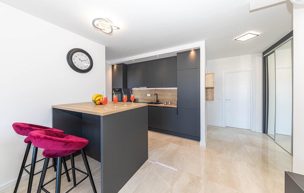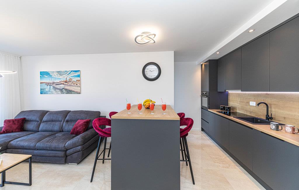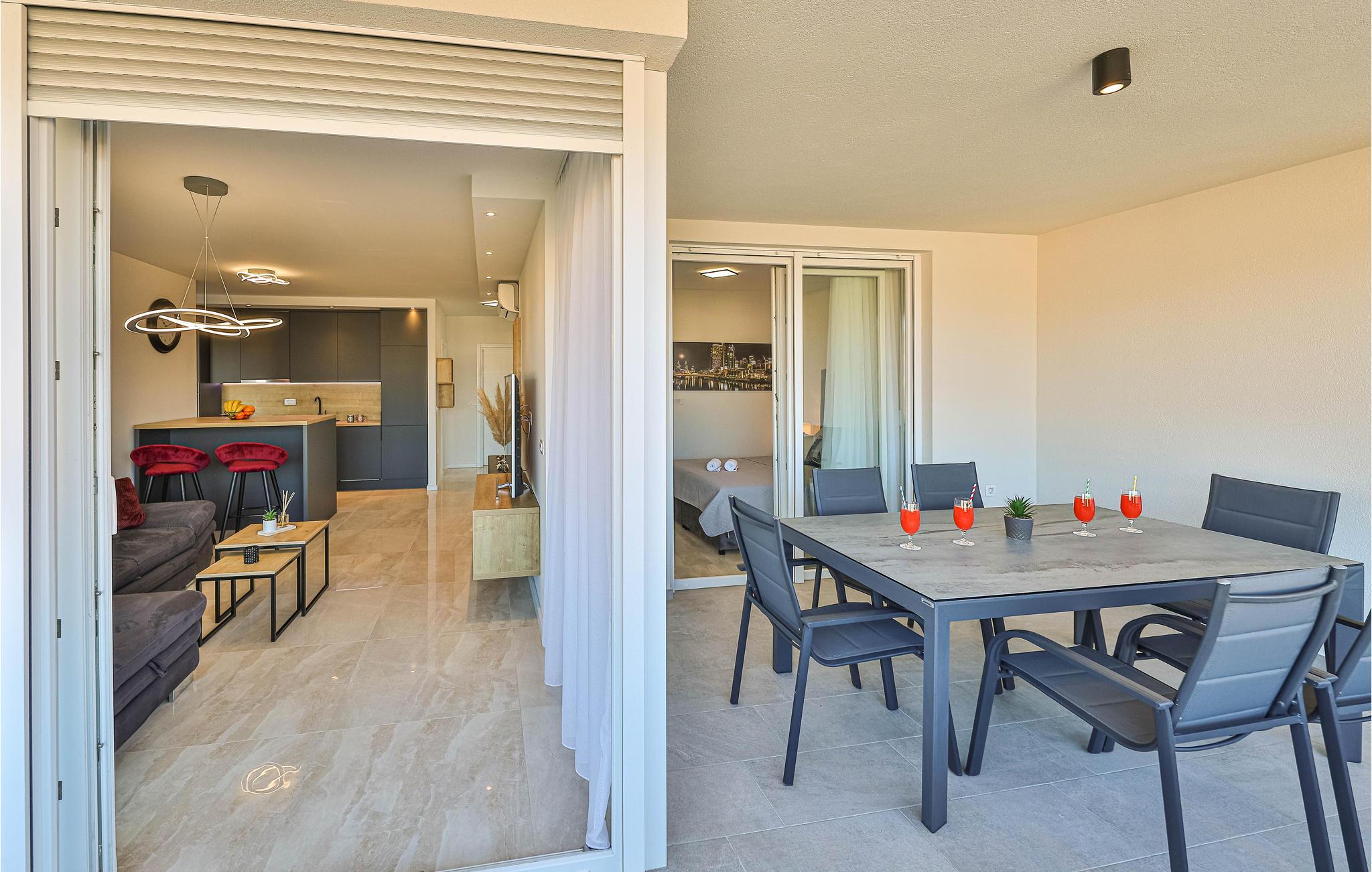 Denne moderne lejlighed byder dig velkommen på bygningens 1. sal. Den har en overdækket altan, hvor I kan spise morgenmad, mens I nyder en vidunderlig panoramaudsigt over havet. Afslut dagen samme sted med et glas vin og en fortryllende solnedgang i horisonten.