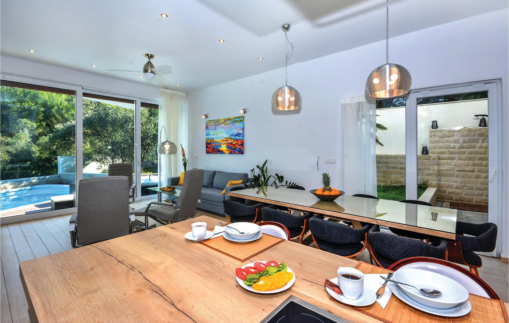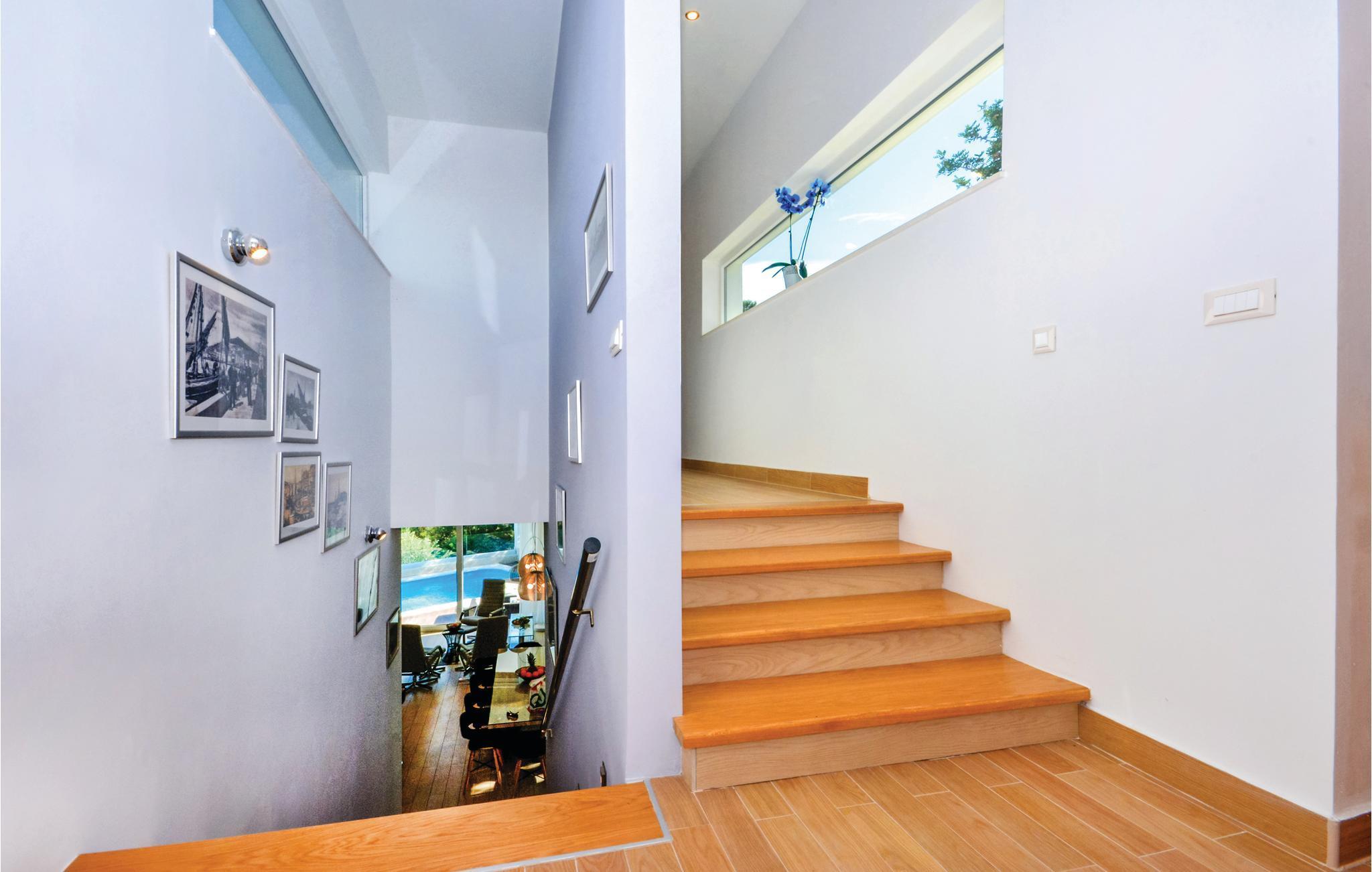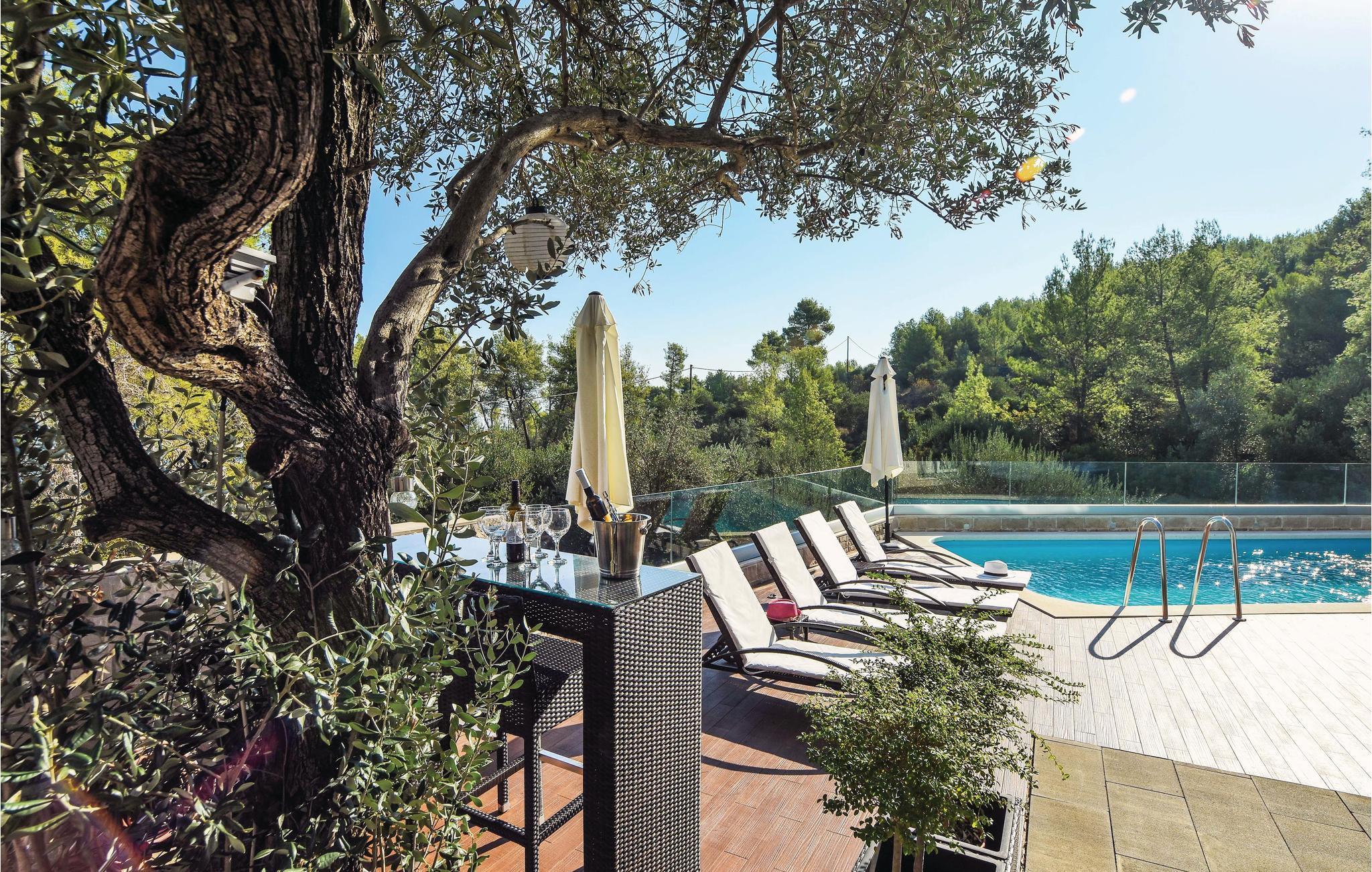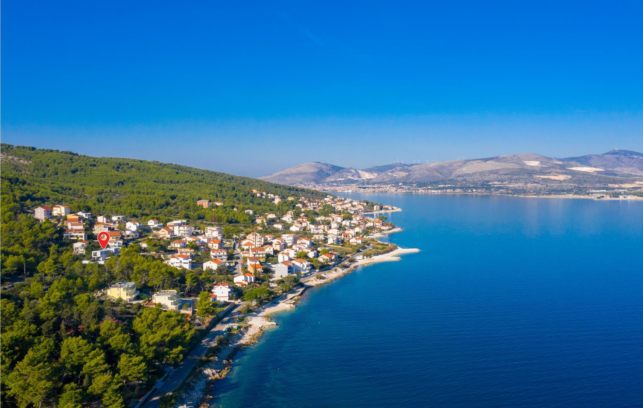 Dette stilfulde feriehus med pool ligger ved siden af en fyrreskov, kun ca. 100 m fra havet. I stueetagen er der: et rummeligt køkken, dagligstue med spiseområde og udgang til terrassen, sommerkøkken med grill, fritidsrum med lille bar og fitnessrum. På 1. sal er der fire soveværelser med bad en suite. Nyd den dejligt anlagte og fuldstændig inhegnede grund med herlig udsigt over landskabet og slap af på en af terrasserne. Opdag mange dejlige strande på øen og besøg den historiske by Trogir, der hører til UNESCOs verdenskulturarv og byder på underholdning og gastronomiske tilbud.