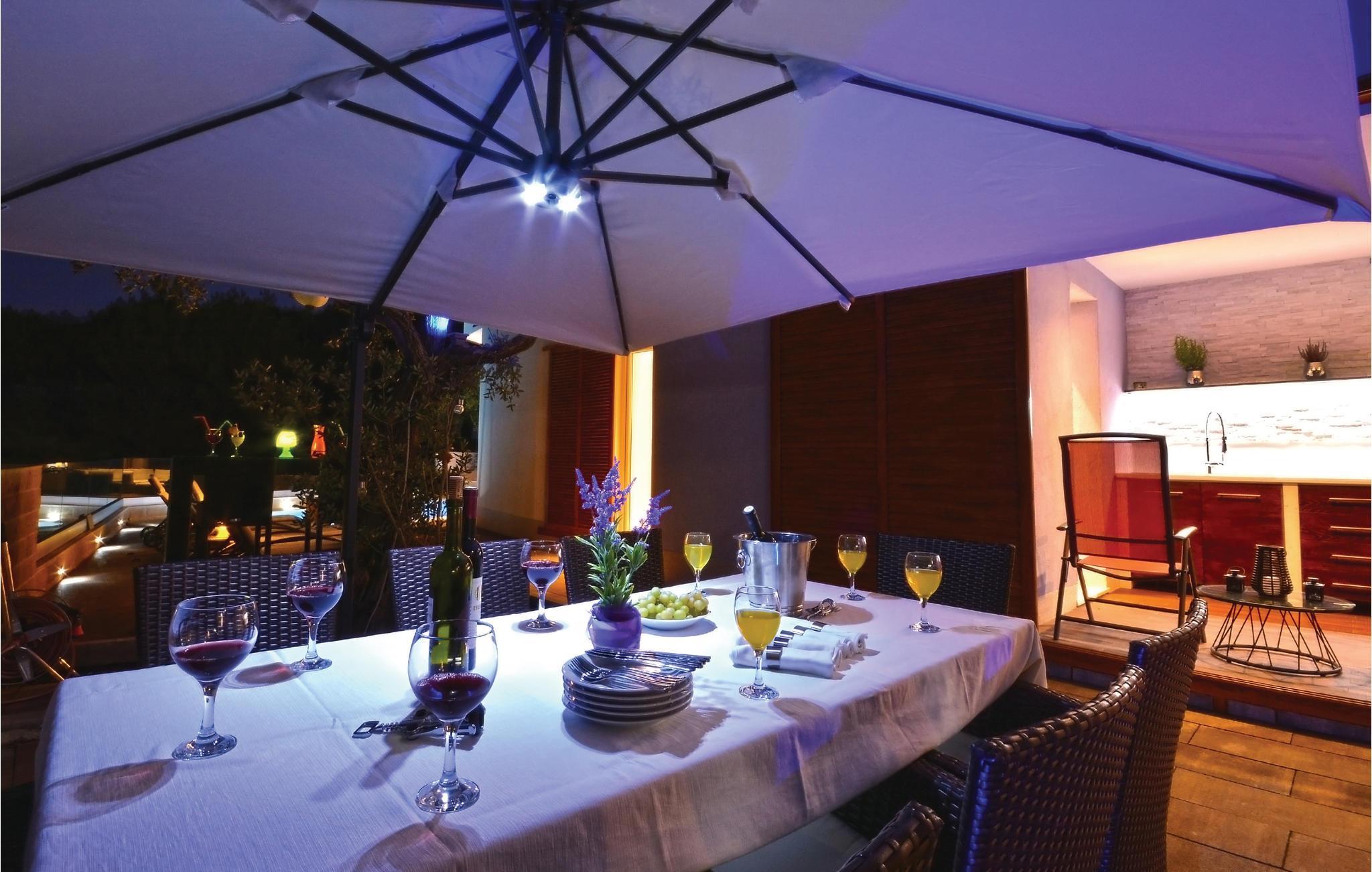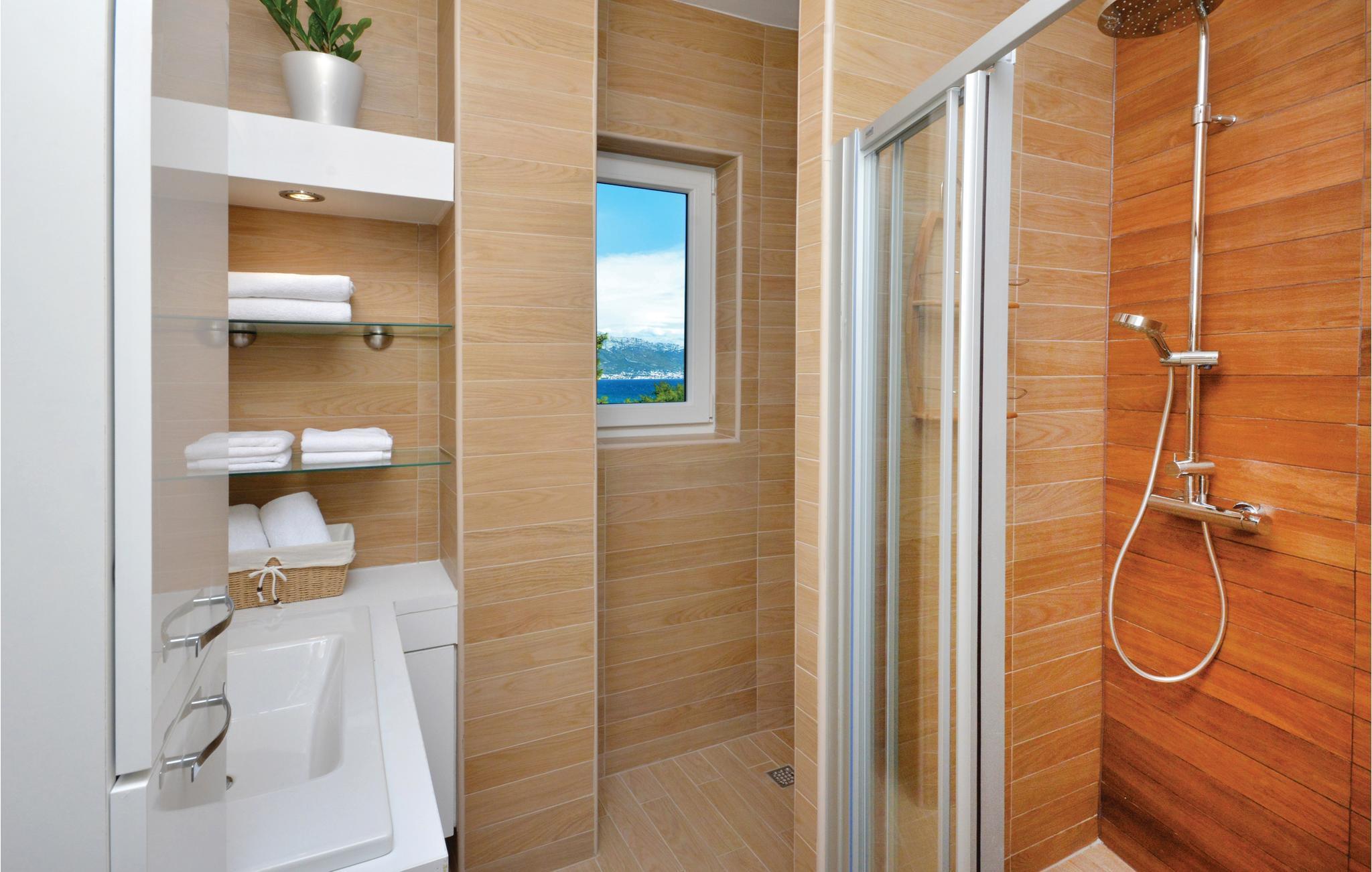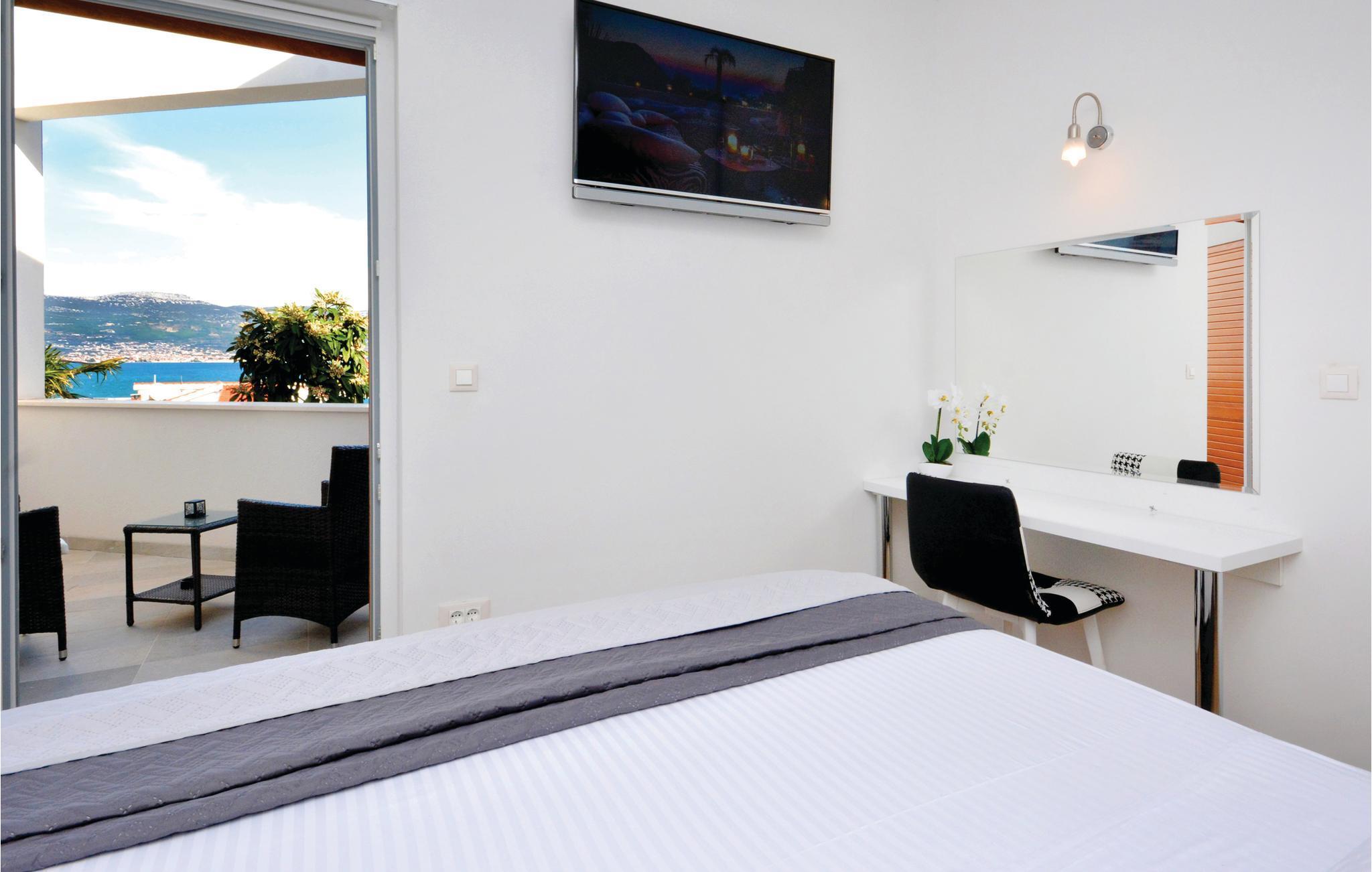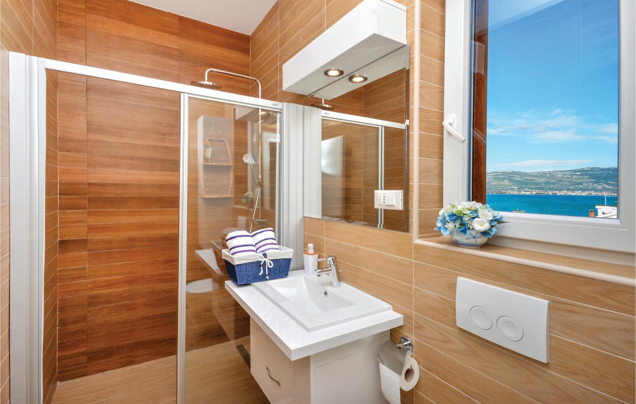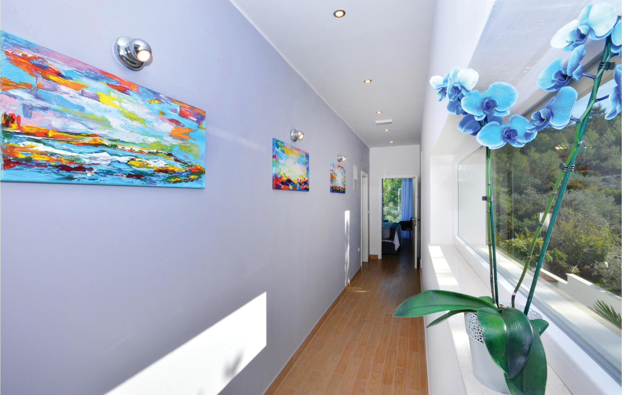 Dette stilfulde feriehus med pool ligger ved siden af en fyrreskov, kun ca. 100 m fra havet. I stueetagen er der: et rummeligt køkken, dagligstue med spiseområde og udgang til terrassen, sommerkøkken med grill, fritidsrum med lille bar og fitnessrum. På 1. sal er der fire soveværelser med bad en suite. Nyd den dejligt anlagte og fuldstændig inhegnede grund med herlig udsigt over landskabet og slap af på en af terrasserne. Opdag mange dejlige strande på øen og besøg den historiske by Trogir, der hører til UNESCOs verdenskulturarv og byder på underholdning og gastronomiske tilbud.