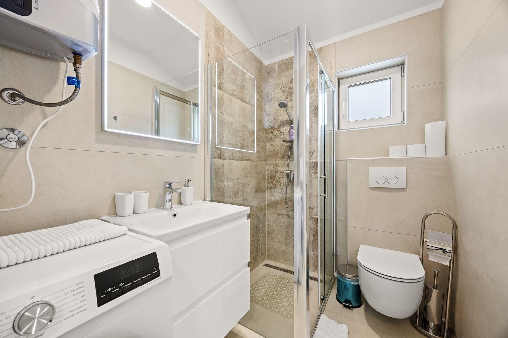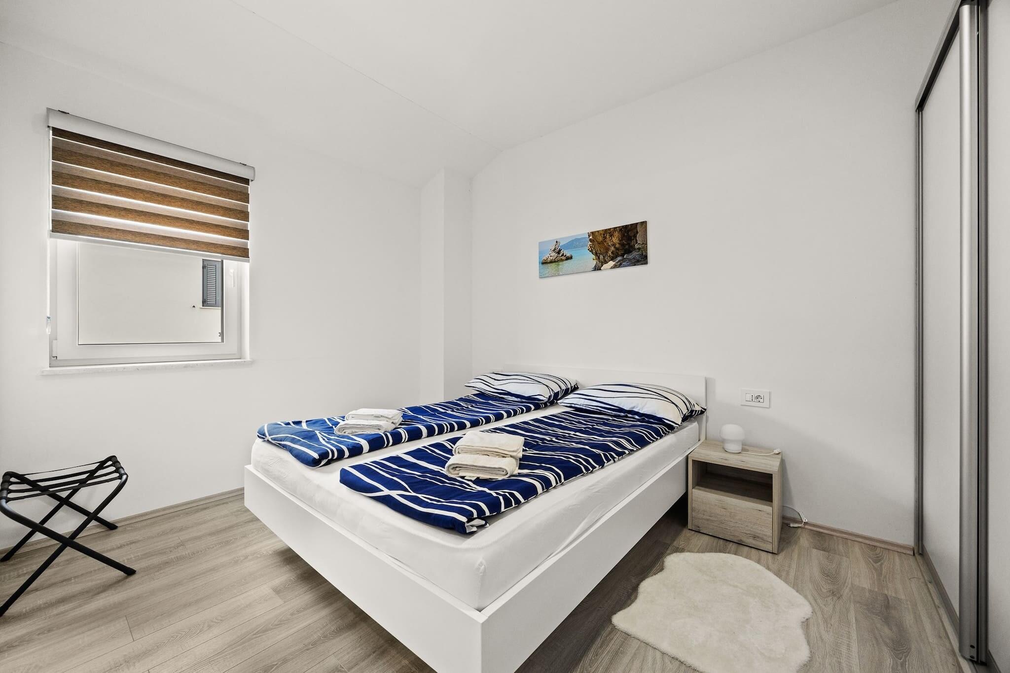 Denne ejendom tilbyder sammen med sit moderne design og rummelige layout et behageligt ophold for op til seks gæster. Den har to store dobbeltsenge og en køjeseng i sine tre soveværelser, med en sovesofa i stuen til ekstra soveplads. Lejligheden har en privat balkon med en fantastisk havudsigt, perfekt til at slappe af eller nyde måltider udendørs. Ejendommen er kæledyrsvenlig og tillader små kæledyr med forudgående varsel, og tilbyder også yderligere faciliteter såsom en barneseng og høj stol efter anmodning. Gratis privat parkering er tilgængelig for gæsterne, hvilket sikrer bekvemmelighed under deres ophold. Lejligheden er ideelt beliggende i gåafstand fra en smuk sandstrand, hvilket gør den perfekt til strandelskere. I nærheden kan gæsterne udforske den charmerende lokale landsby med et udvalg af caféer, restauranter og butikker at nyde. Den gamle bydel i Rab, kendt for sine historiske smalle gader og traditionelle bygninger, ligger også tæt på. Offentlig transport er let tilgængelig, med busstationer i nærheden, og færger kører ofte for at forbinde øen med fastlandet. Den nærmeste lufthavn er let tilgængelig med bil, hvilket gør det bekvemt at rejse til og fra området. Lejligheden har et fuldt udstyret køkken med køleskab, ovn, mikroovn, opvaskemaskine og kaffemaskine, perfekt til at tilberede måltider under dit ophold. Det velindrettede badeværelse har moderne bekvemmeligheder såsom bruser, hårtørrer og kropssæbe. Yderligere bekvemmeligheder inkluderer aircondition, satellit-tv og gratis Wi-Fi, hvilket sikrer et afslappende og behageligt ophold.