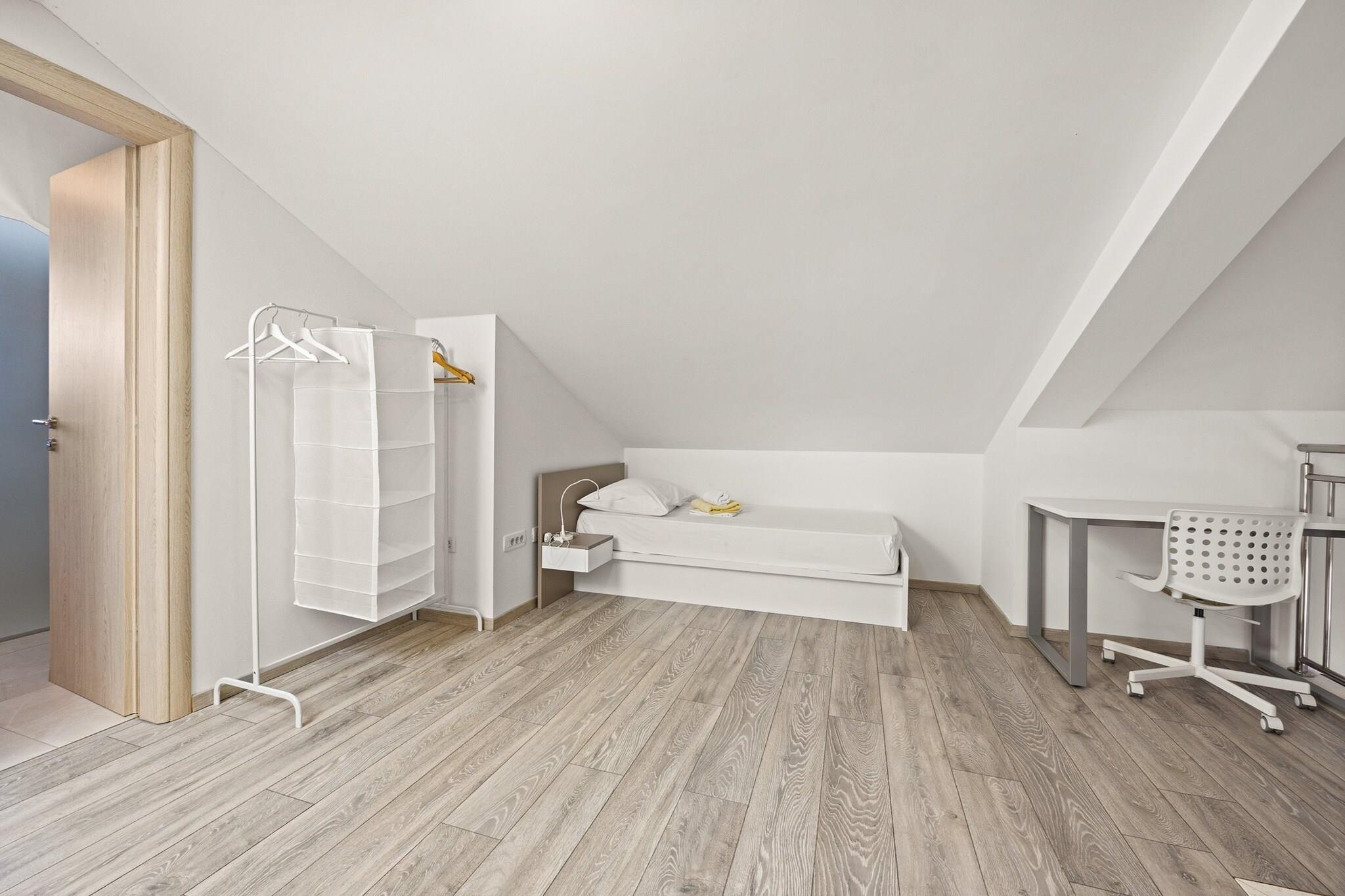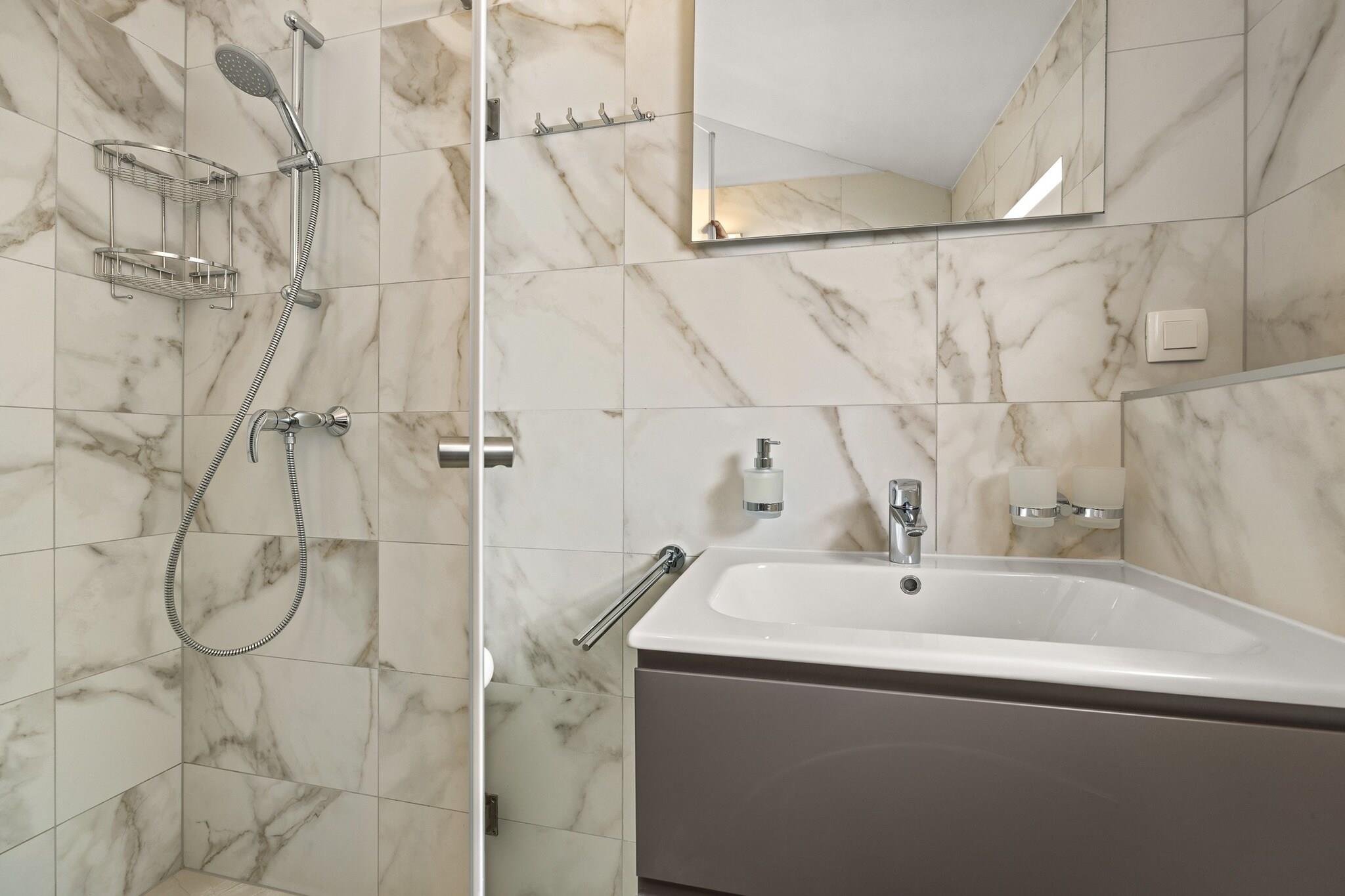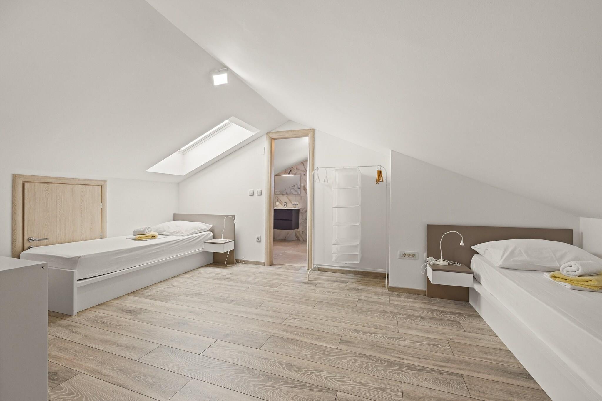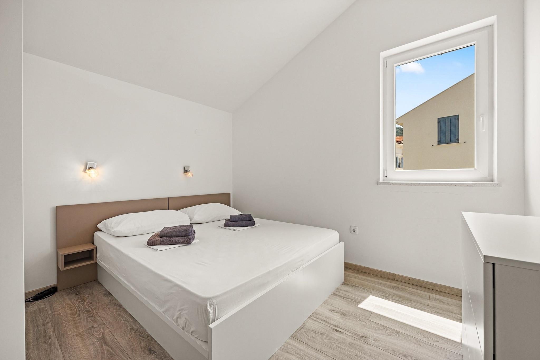 Denne ejendom, med sin moderne indretning og fredfyldte havudsigt, er et ideelt tilflugtssted for familier eller små grupper. Lejligheden kan komfortabelt rumme op til 4 voksne og 2 børn, og tilbyder privatliv og plads til alle. Det har to soveværelser - det ene med en king-size seng og det andet med to enkeltsenge - og to badeværelser. Galleriområdet giver en perfekt plads til børn, med plads til to ekstra luftsenge. En overdækket terrasse giver privatliv og beskyttelse mod solen, mens lejlighedens balkon byder på en malerisk udsigt over Adriaterhavet. Der medfølger én parkeringsplads, med mulighed for at anmode om en ekstra plads i garagen. Lejligheden er beliggende i et fredeligt boligområde, kun 400 meter fra centrum af Cres og dens smukke strand. Cres-øen er let tilgængelig med færge fra Brestova-Porozina, hvilket gør den til en bekvem destination for rejsende. Øen, der er rig på historie, var engang en del af Apsyrtiderne i oldgræsk mytologi og er hjemsted for smukke bugter og uberørt vand, ideelt til svømning og udforskning. Med sin historiske betydning og naturlige skønhed er Cres perfekt for både naturelskere og historieentusiaster. Lejligheden indeholder et fuldt udstyret køkken med moderne apparater såsom induktionskomfur, køleskab og ovn. Det tilbyder også væsentlige faciliteter såsom aircondition, Wi-Fi og et fladskærms-tv til underholdning. De to badeværelser har brusere, og lejligheden er udstyret med nødvendige ting såsom en hårtørrer og håndklæder. Med den ekstra bonus af en privat balkon, aircondition og sikker parkering, vil gæsterne nyde et behageligt og afslappende ophold i dette charmerende feriehus.
