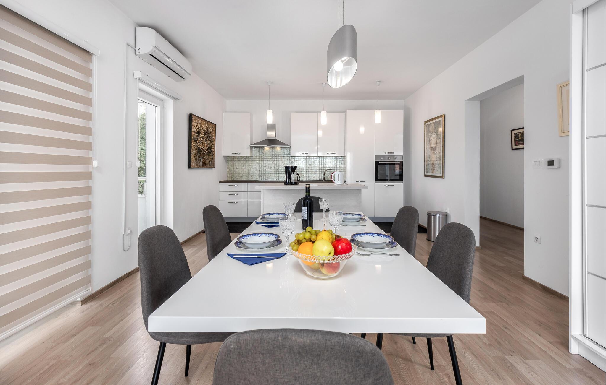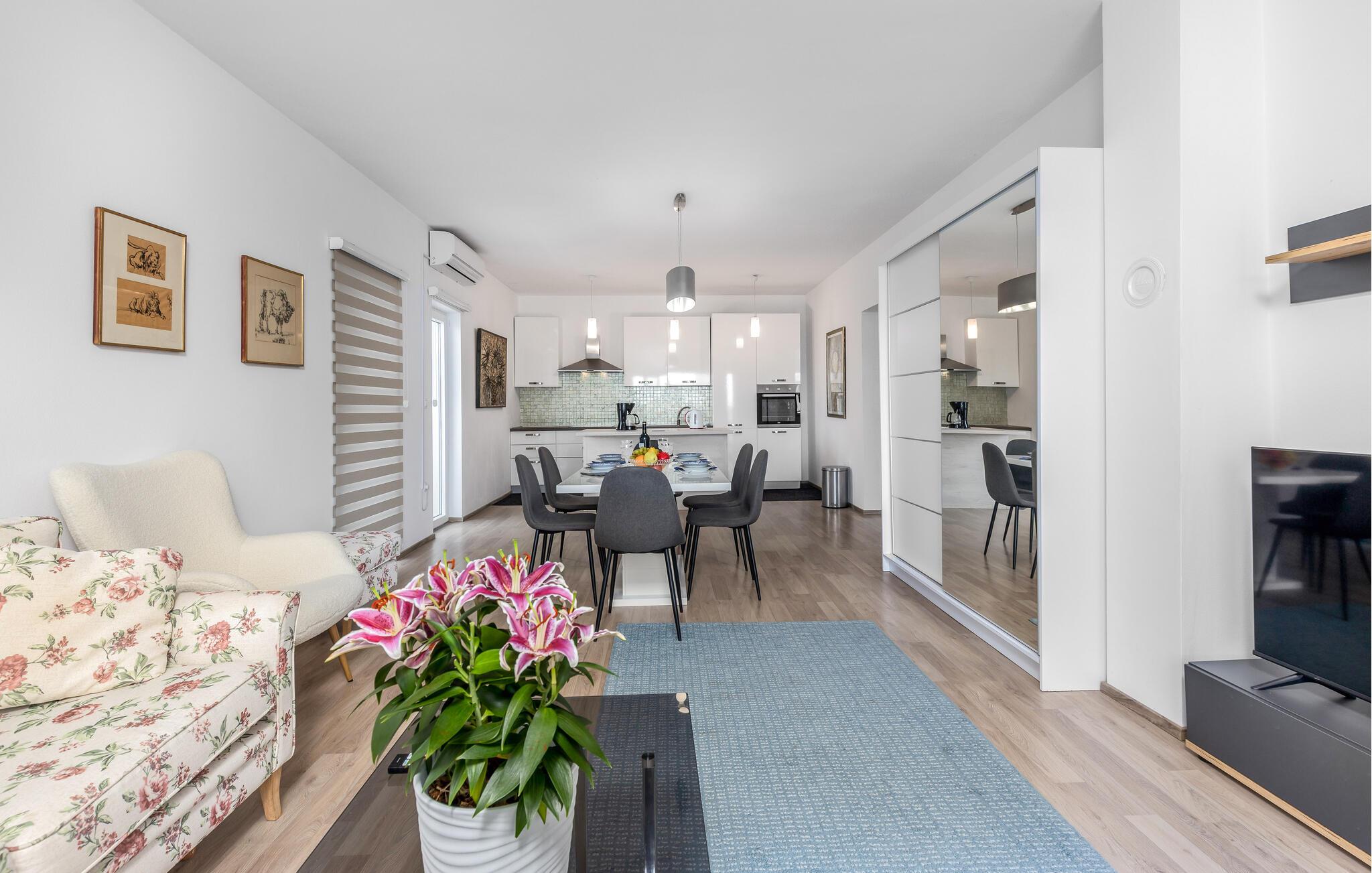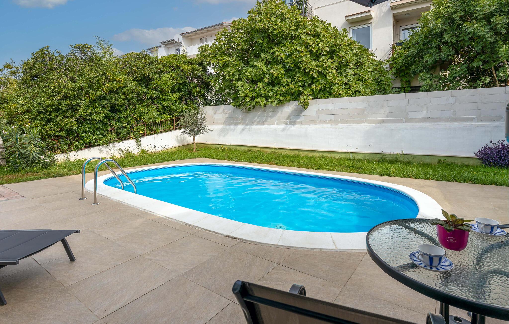 Her finder I alt, hvad I behøver for et afslappende ophold: stilfuldt indrettede værelser, der lukker masser af lys ind, og et fuldt udstyret køkken til at tilberede måltider sammen. Lejligheden er en af to rummelige enheder i et charmerende familiehus. Udenfor frister den fælles pool bag huset, perfekt til en forfriskende dukkert eller afslappende timer i solen.