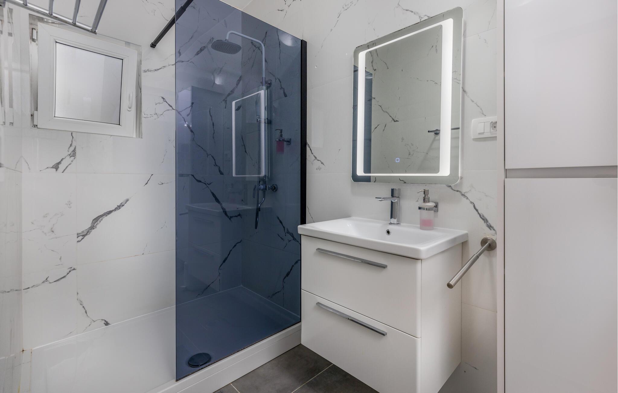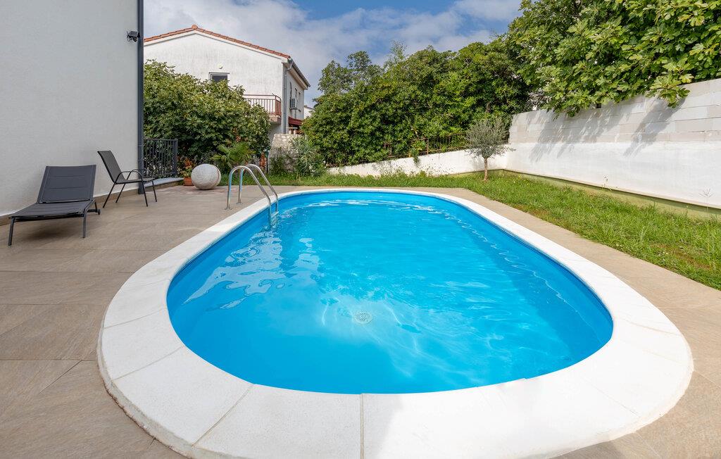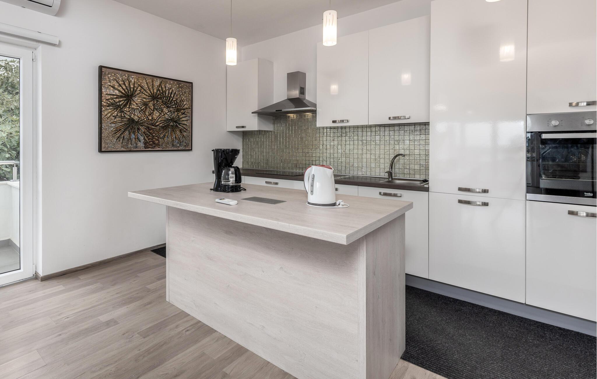 Her finder I alt, hvad I behøver for et afslappende ophold: stilfuldt indrettede værelser, der lukker masser af lys ind, og et fuldt udstyret køkken til at tilberede måltider sammen. Lejligheden er en af to rummelige enheder i et charmerende familiehus. Udenfor frister den fælles pool bag huset, perfekt til en forfriskende dukkert eller afslappende timer i solen.
