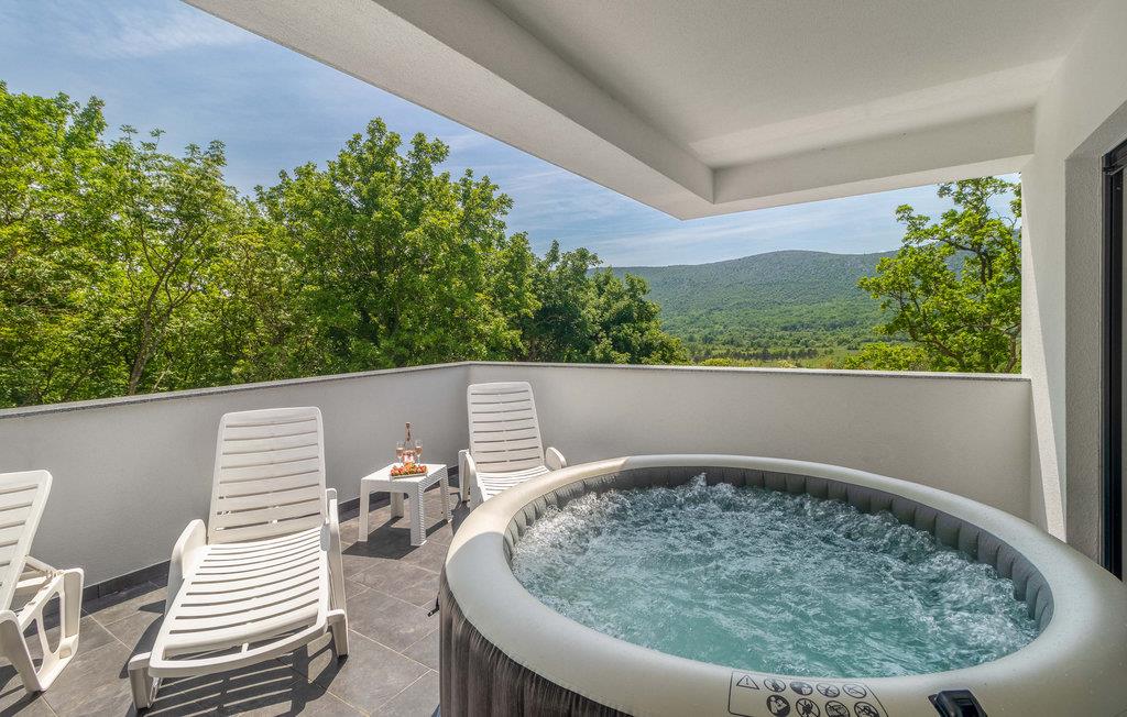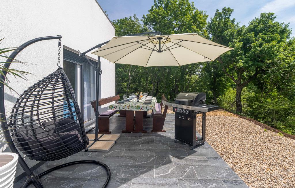 Rundt om huset finder I mange muligheder for fuldt ud at nyde jeres tid udendørs. Uanset om I solbader ved den overjordiske pool, nyder en afslappende kop kaffe med en fantastisk udsigt over landskabet, mens børnene leger gladeligt eller nyder et hyggeligt måltid fra grillen på terrassen, vil ferieafslapningen ikke vente længe på sig. En boblende dukkert i det udendørs spabad vil lade batterierne op.
