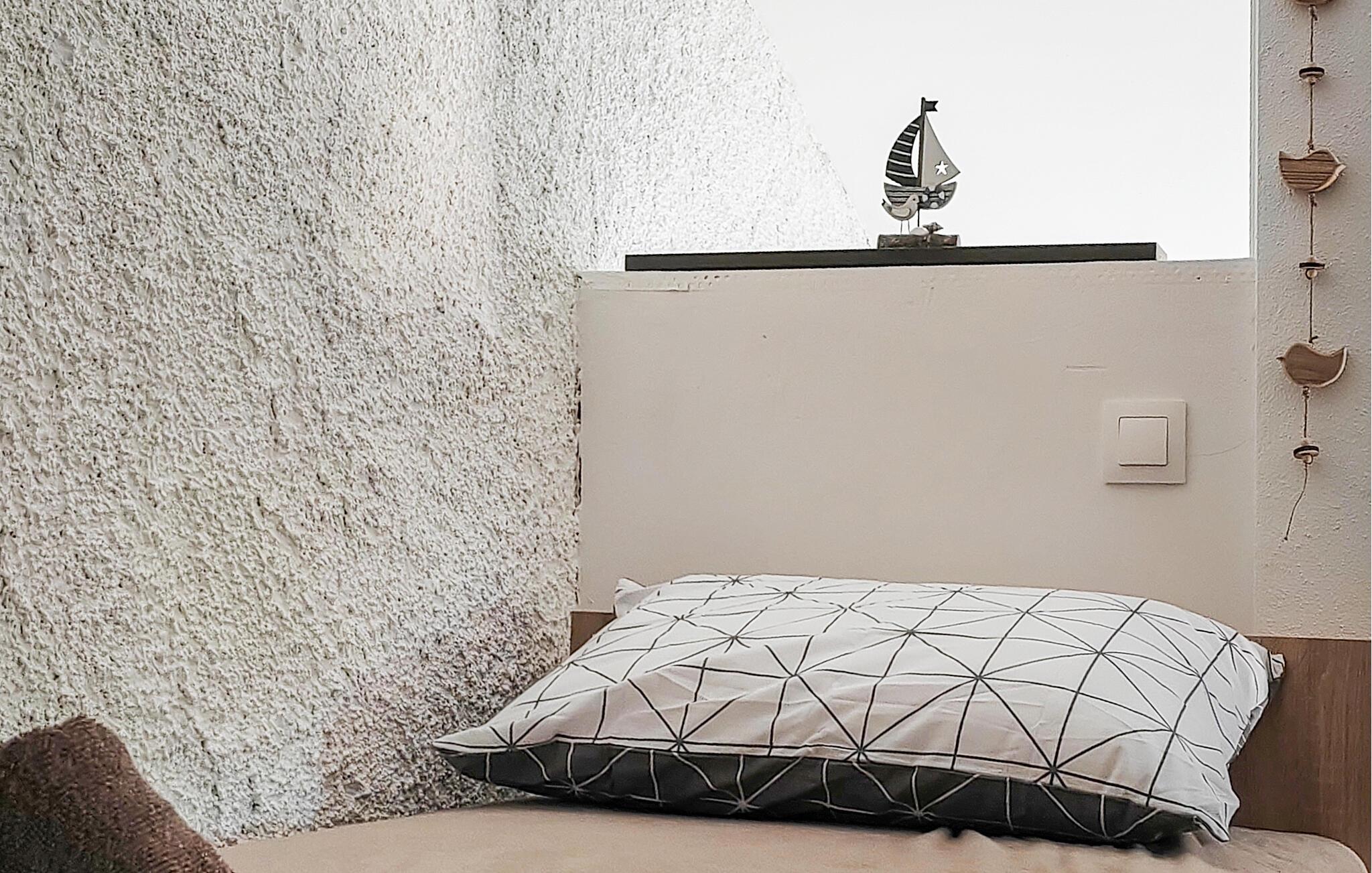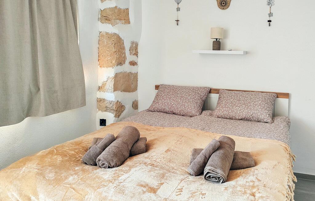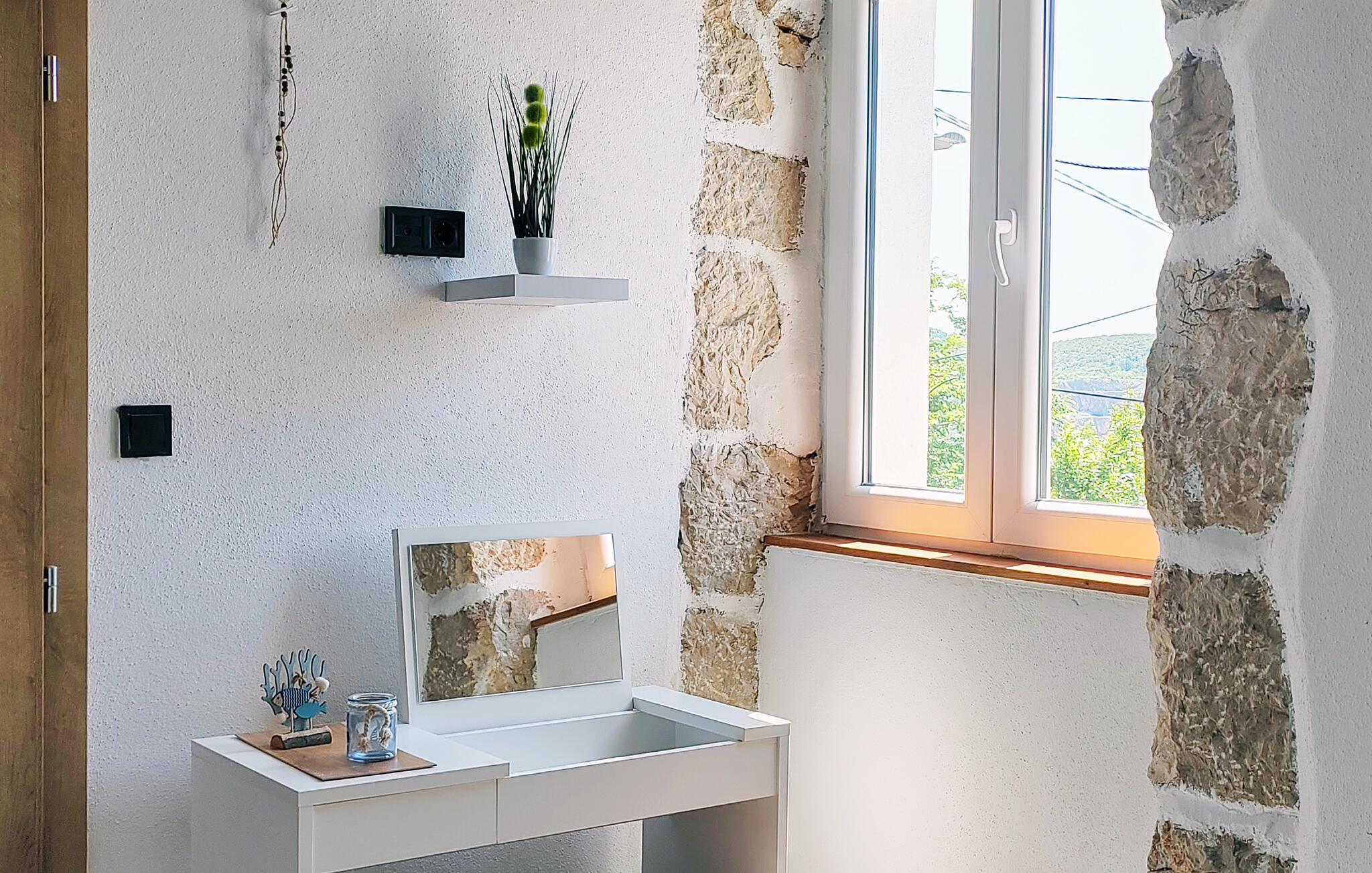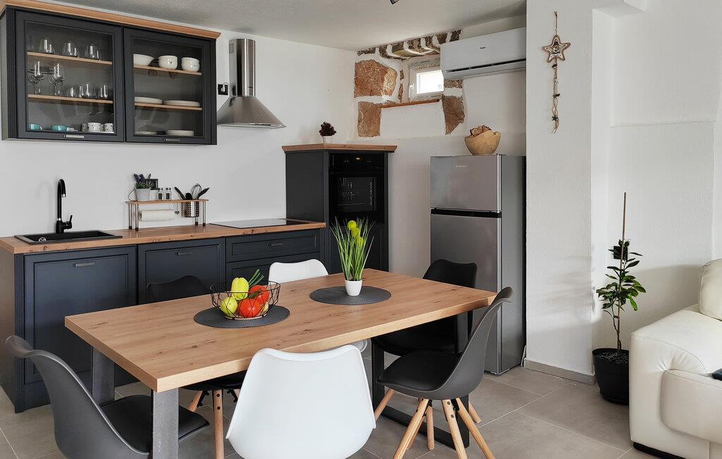 Fordyb jer i den særlige atmosfære i dette kærligt designede feriehus. Her finder I moderne komfort kombineret med rustikke elementer af synlige natursten, hvilket giver huset sin autentiske karakter. Sæt jer til rette i den hyggelige sofa og nyd den rolige atmosfære i opholdsstuen. Tilbered jeres måltider i det åbne køkken og server dem ved træbordet med jeres familie.